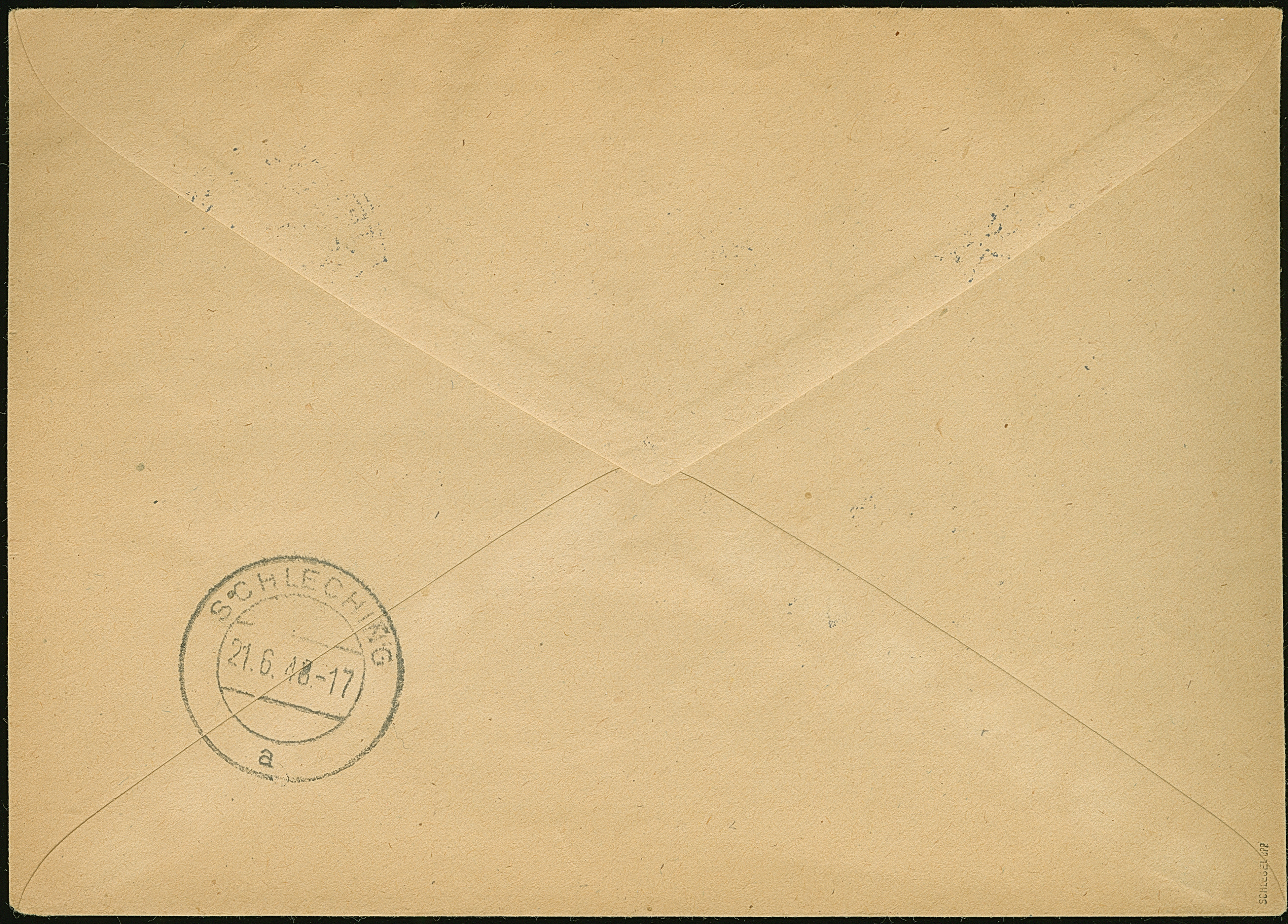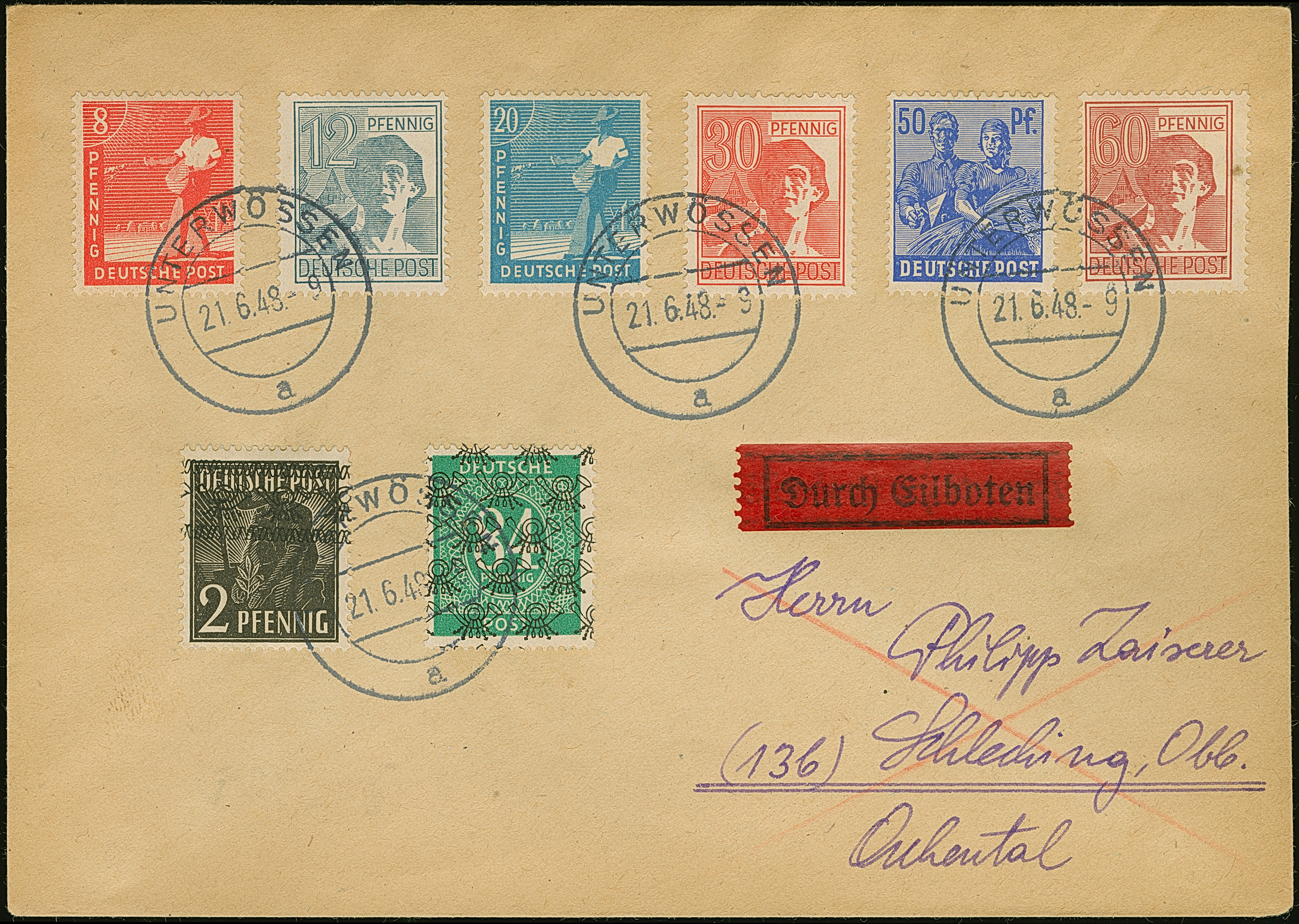1948, Netzaufdruck 84 Pfg. zusammen mit Netzaudruck 2 Pfg. und weiterer Zufrankatur mit Ersttagsstempel “UNTERWÖSSEN 21.6.48” auf Eilbotenbrief nach Schleching, tadellos, sign. Schlegel BPP