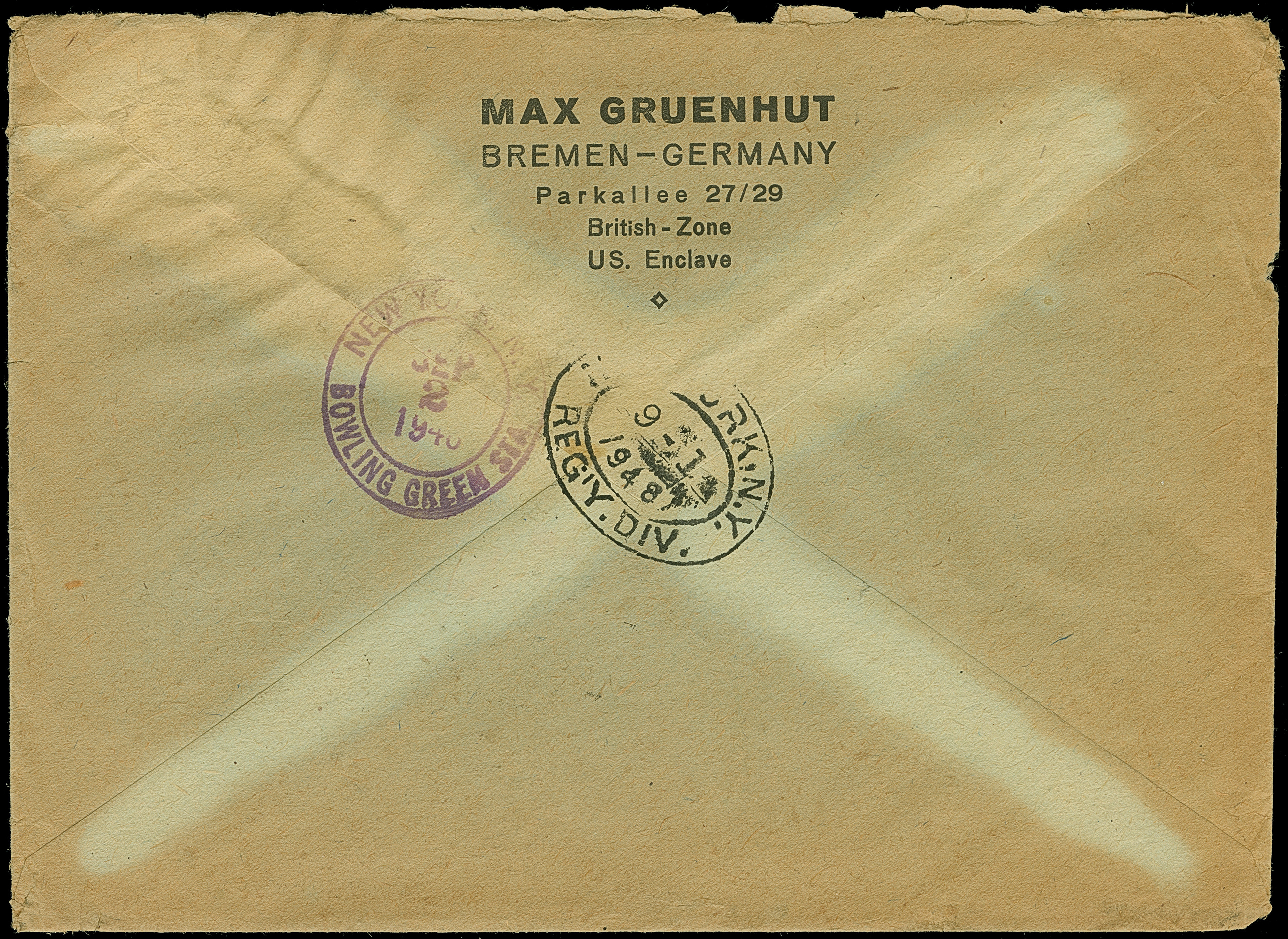 Netz auf Arbeiter 60 Pfg. karminbraun, zwei senkrechte 4er-Streifen und Einzelwert je mit Stempel “BREMEN 28.8.48” als tarifgerechte Mehrfachfrankatur auf R-Luftpostbrief bis 40g mit JEIA-Zulassungsmarke mit Stempel “HAMBURG 29.8.48” nach New York mit Ankunftsstempel Der Umschlag mit kleinen Randfehlern und etwas verfärbt, die Marken sind in einwandfreier Erhaltung. Trotz der Einschränkungen eine außergewöhnliche Mehrfachfrankatur auf Übersee-Luftpostbrief zur JEIA-Zeit