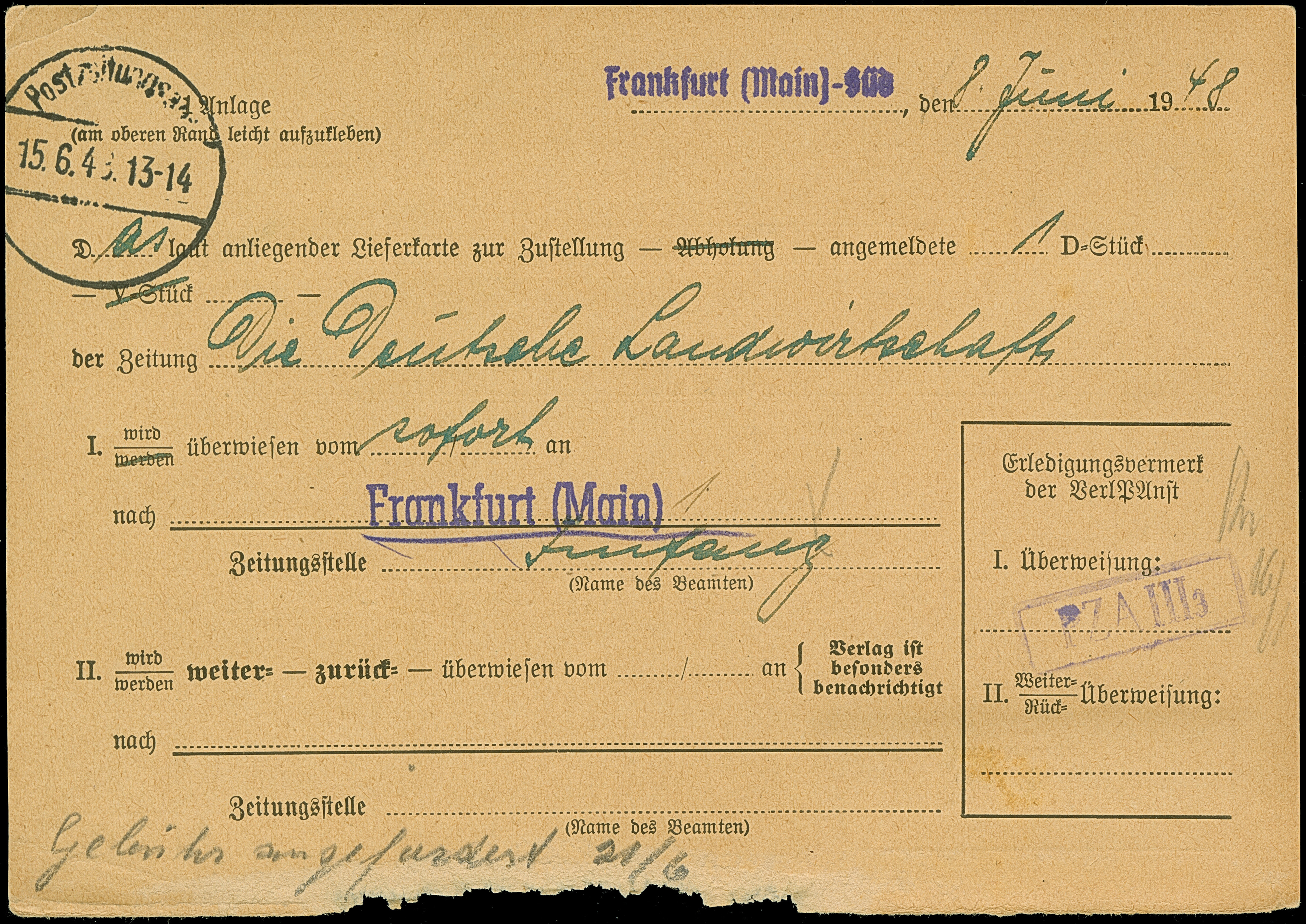 Netz auf Arbeiter 40 Pfg. im senkrechten Paar mit violettem L2 “Frankfurt (M)1 Zeitungsabteilung” als richtig frankierte Gebühr auf Zeitungsüberweisung für Verlagsstücke mit Poststempel “FRANKFURT 9.6.48” sowie rückseitig Innendienststempel vom 15.6. und handschriftlichem Vermerk “Gebühr angefordert 21.6.”. Eine ungewöhnliche Verrechnung der Gebühr mit Briefmarken nach der Währungsreform, obwohl die Zeitungsüberweisung davor verschickt wurde. Die Karte oben mit kleiner Fehlstelle im Rand, ansonsten in guter Erhaltung. In dieser Kombination vielleicht einmaliges Stück