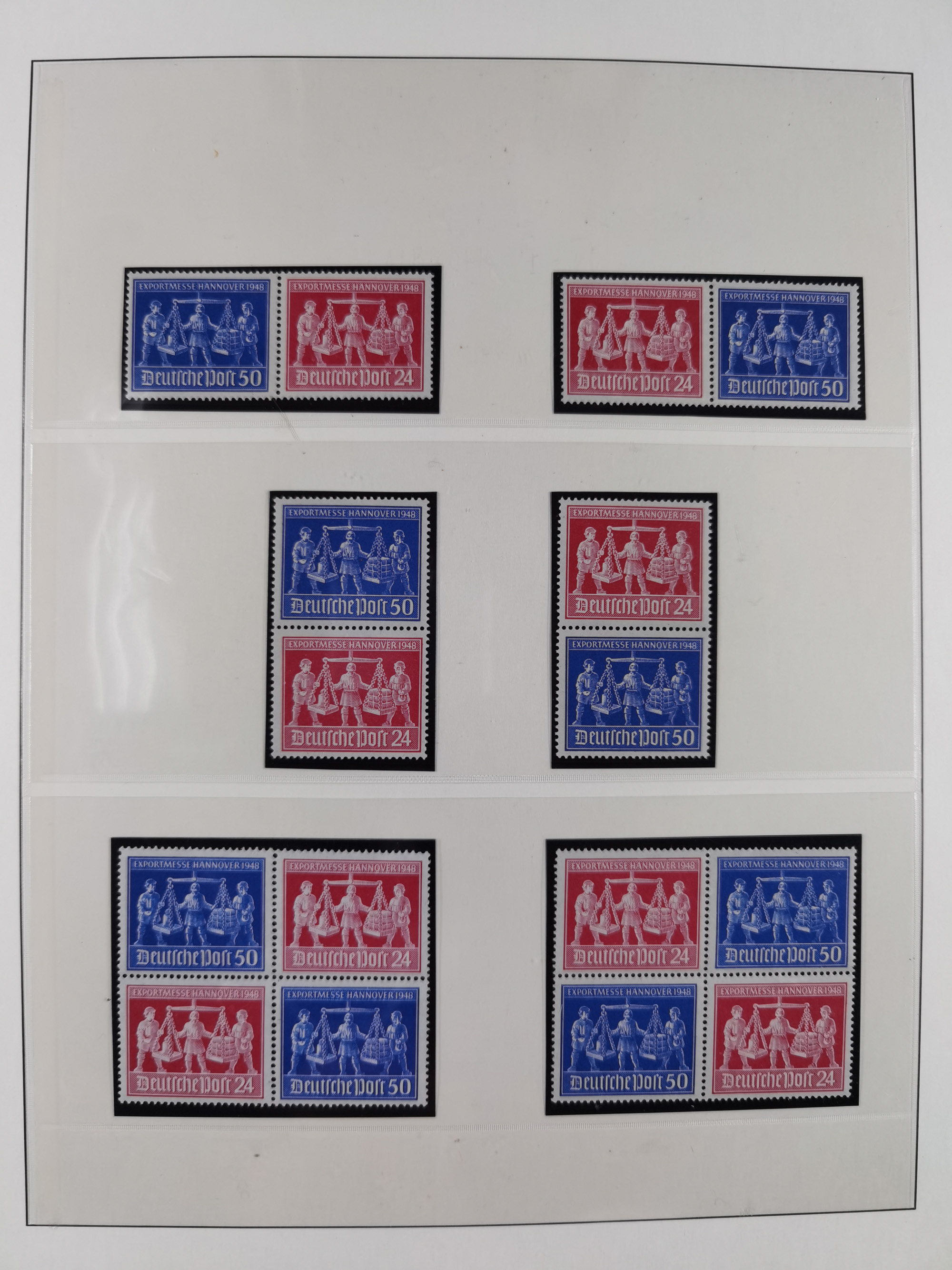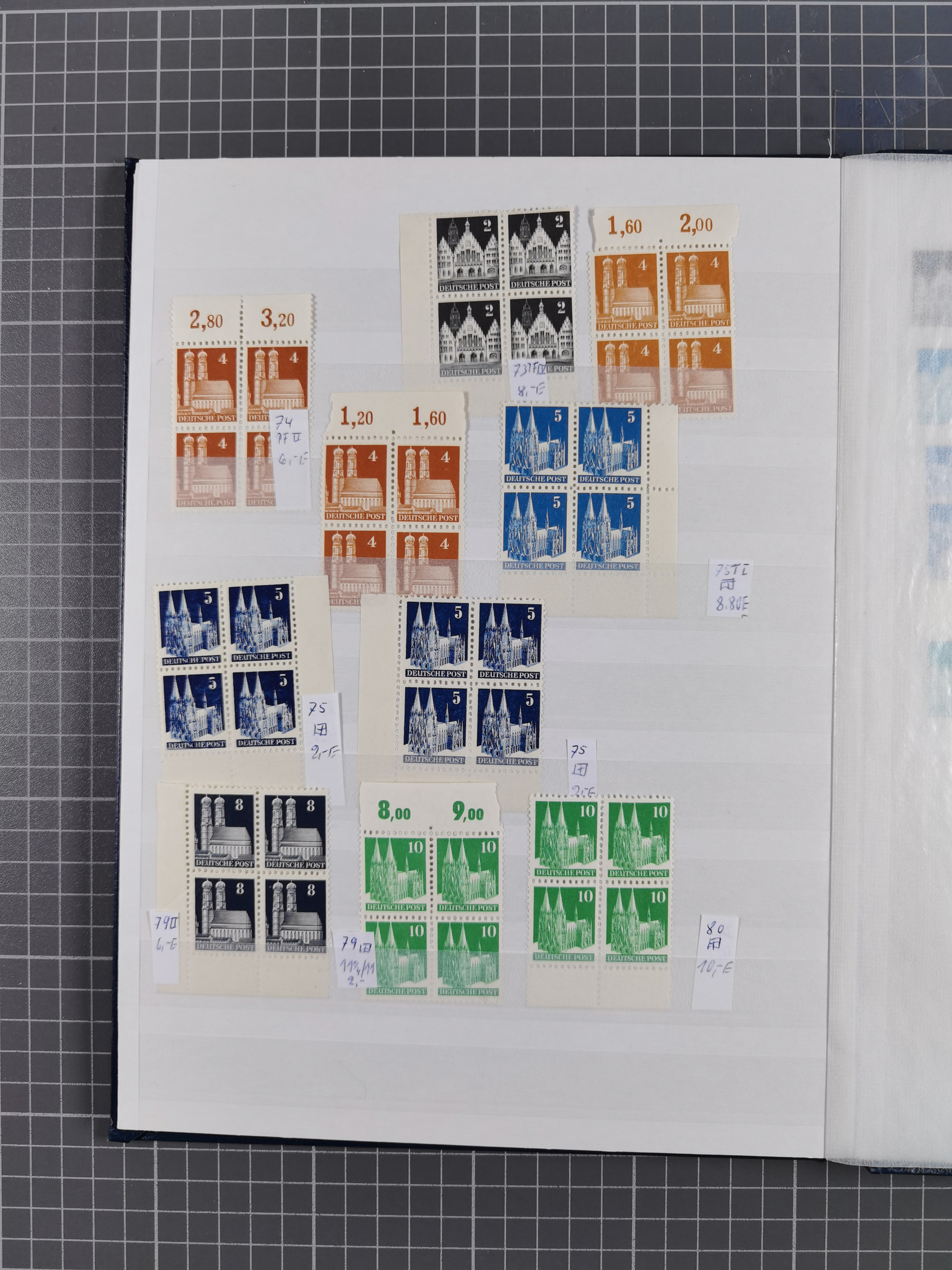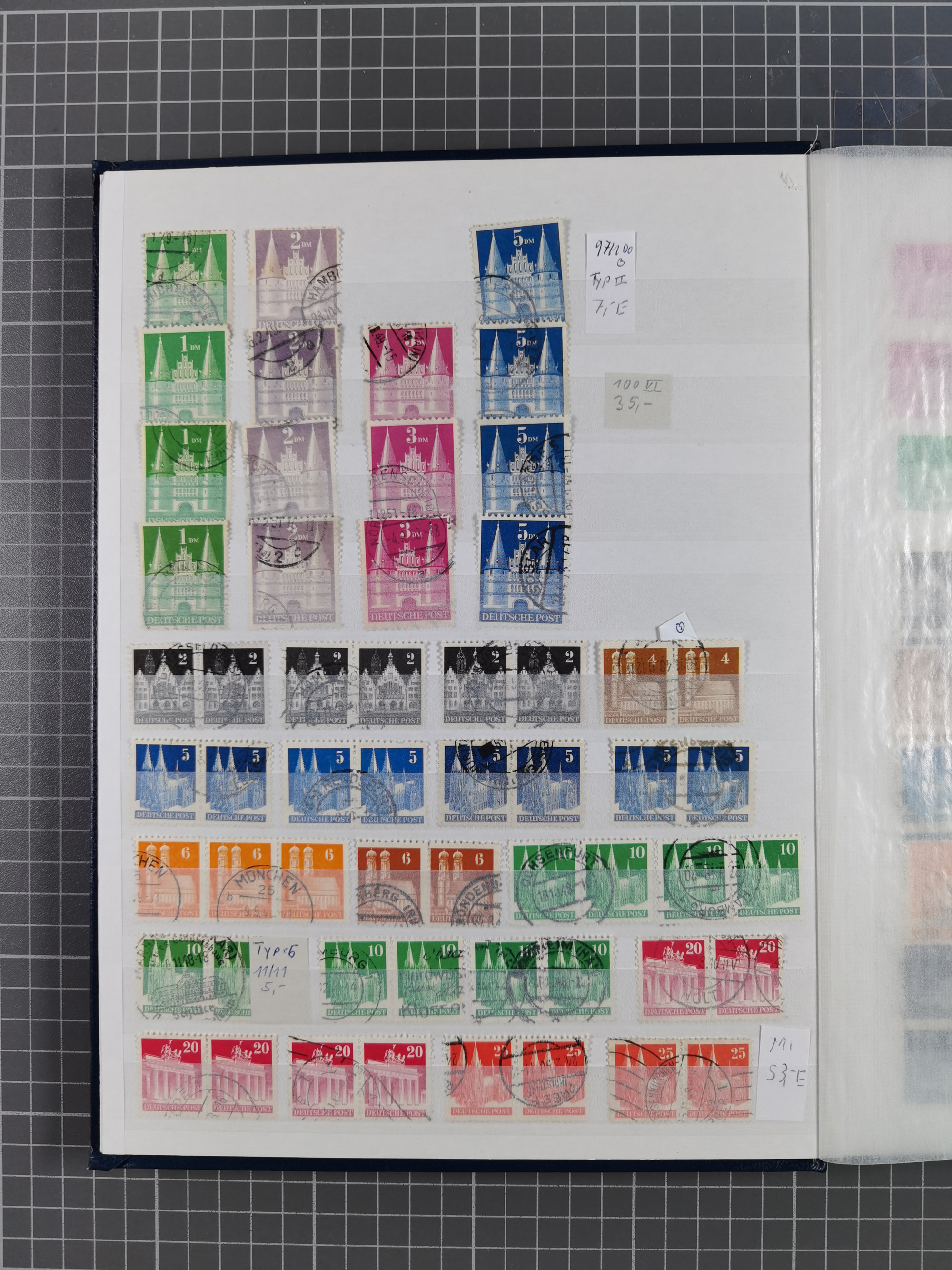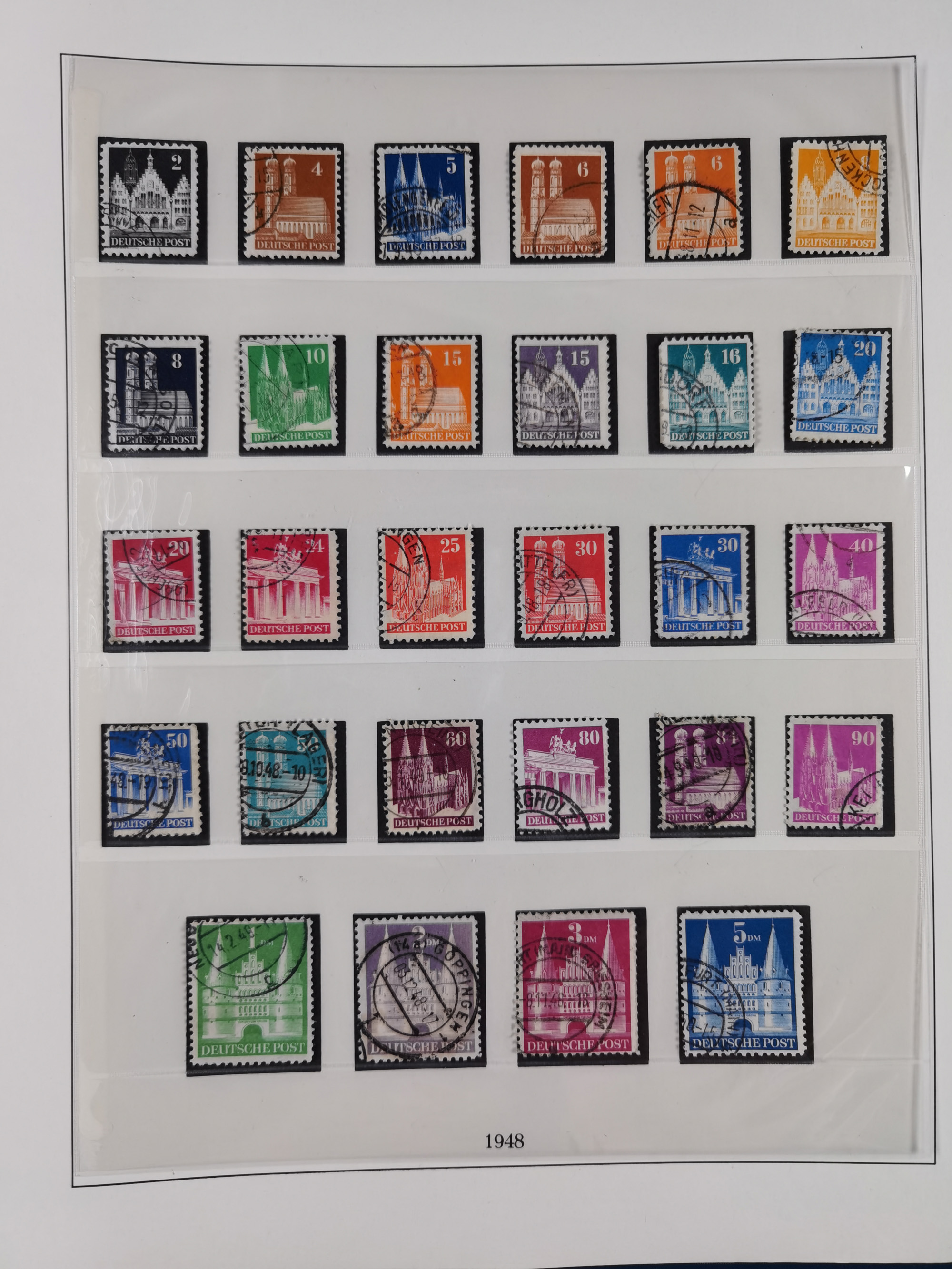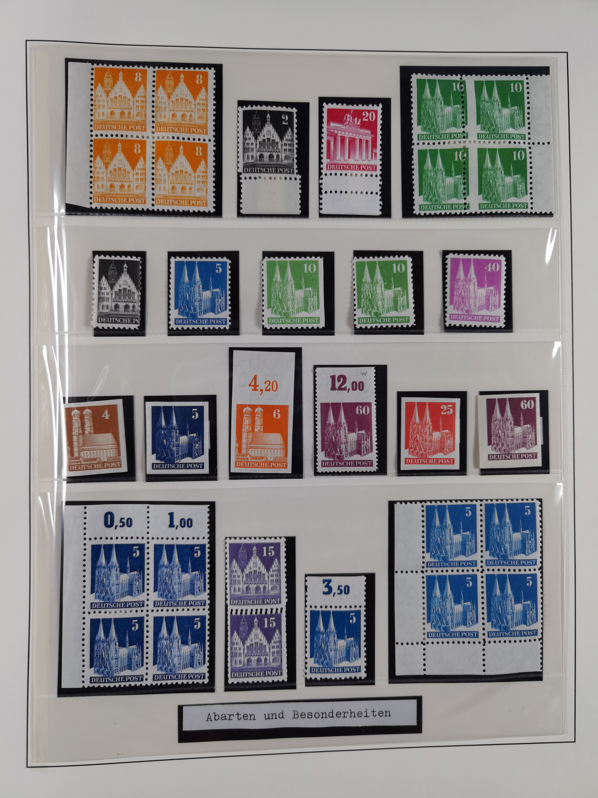 1948, meist postfrischer und gestempelter Bestand “Band/Netz” und “Bauten” mit u.a. Viererblocks, Marken mit Rändern, Bogenecken, Aufdruck-Abarten, in zwei Alben