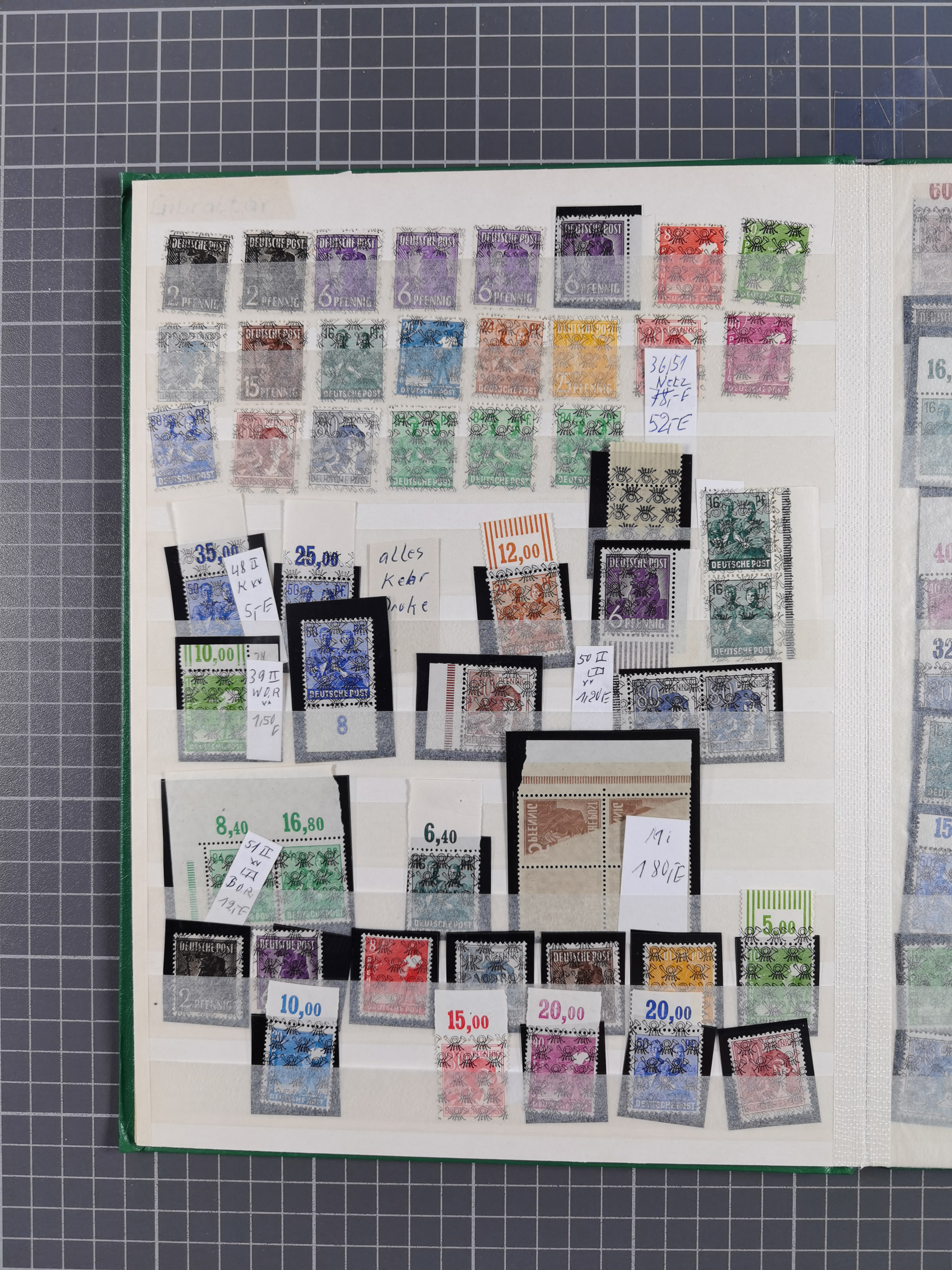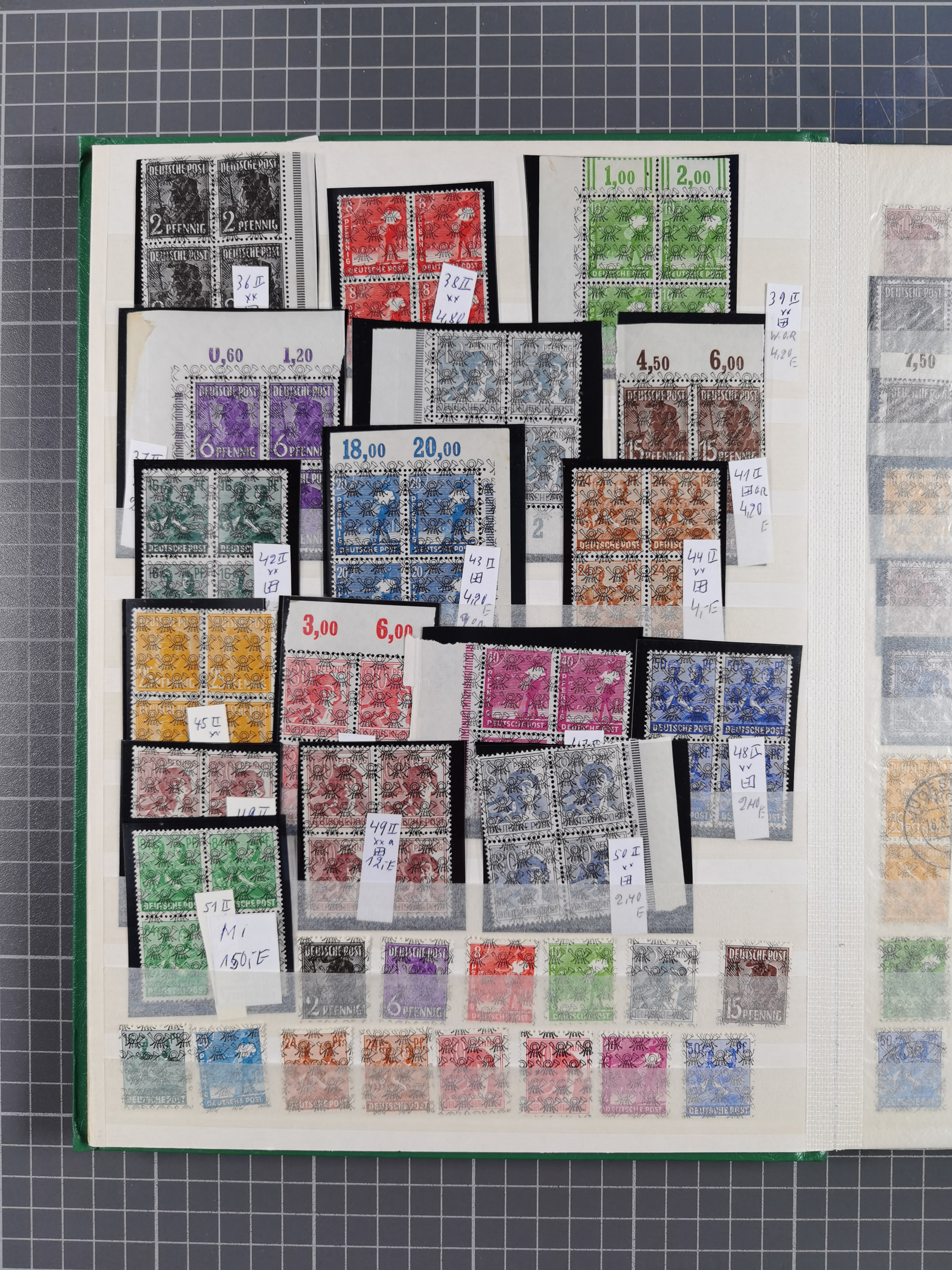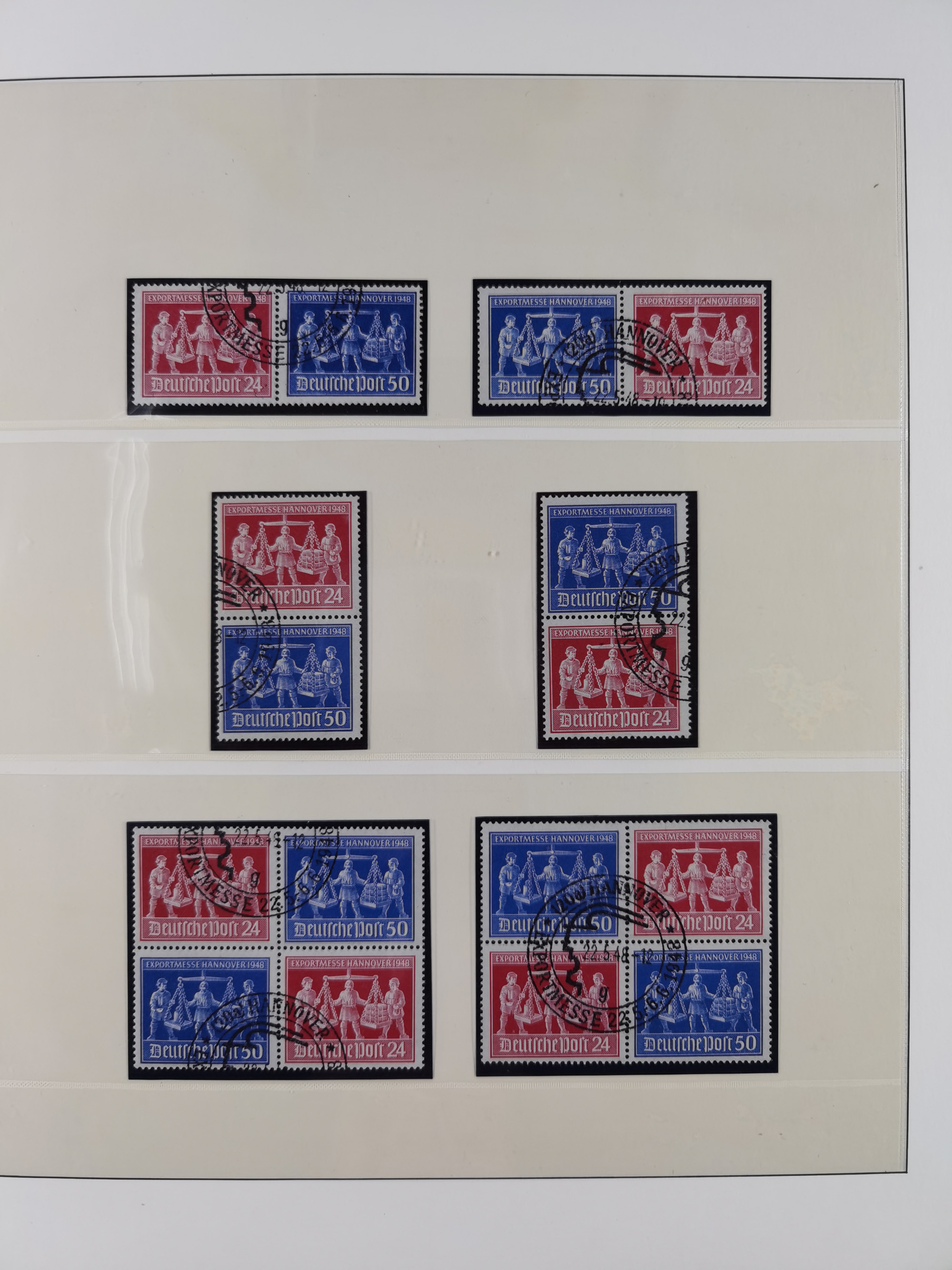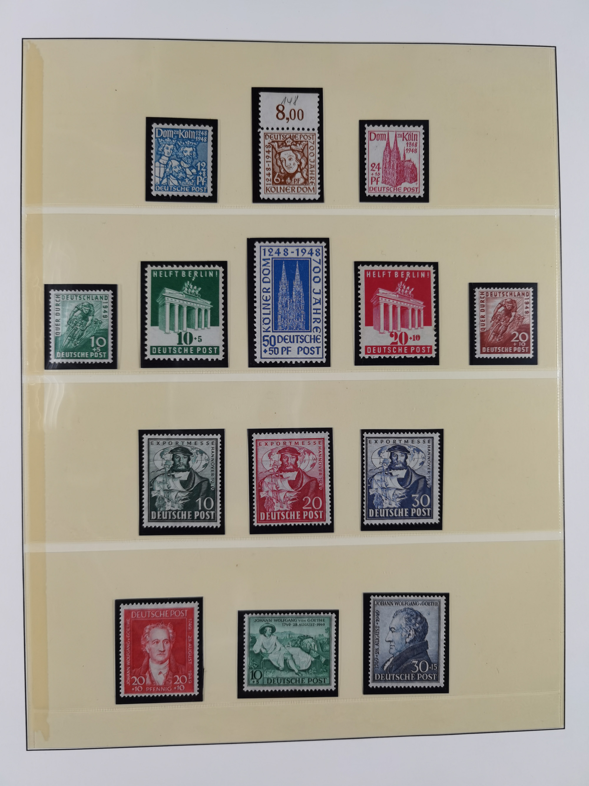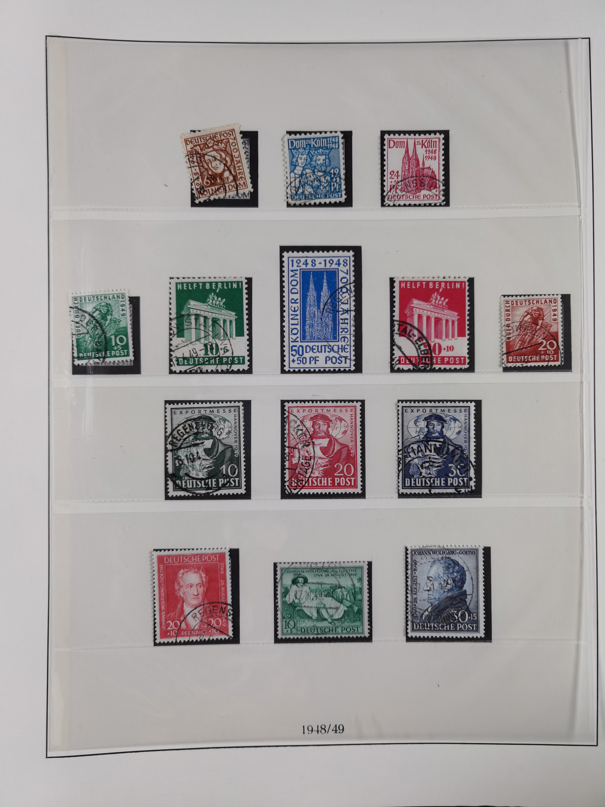 1948, meist postfrischer und gestempelter Bestand “Band/Netz” und “Bauten” mit u.a. Viererblocks, Marken mit Rändern, Bogenecken, Aufdruck-Abarten, in zwei Alben