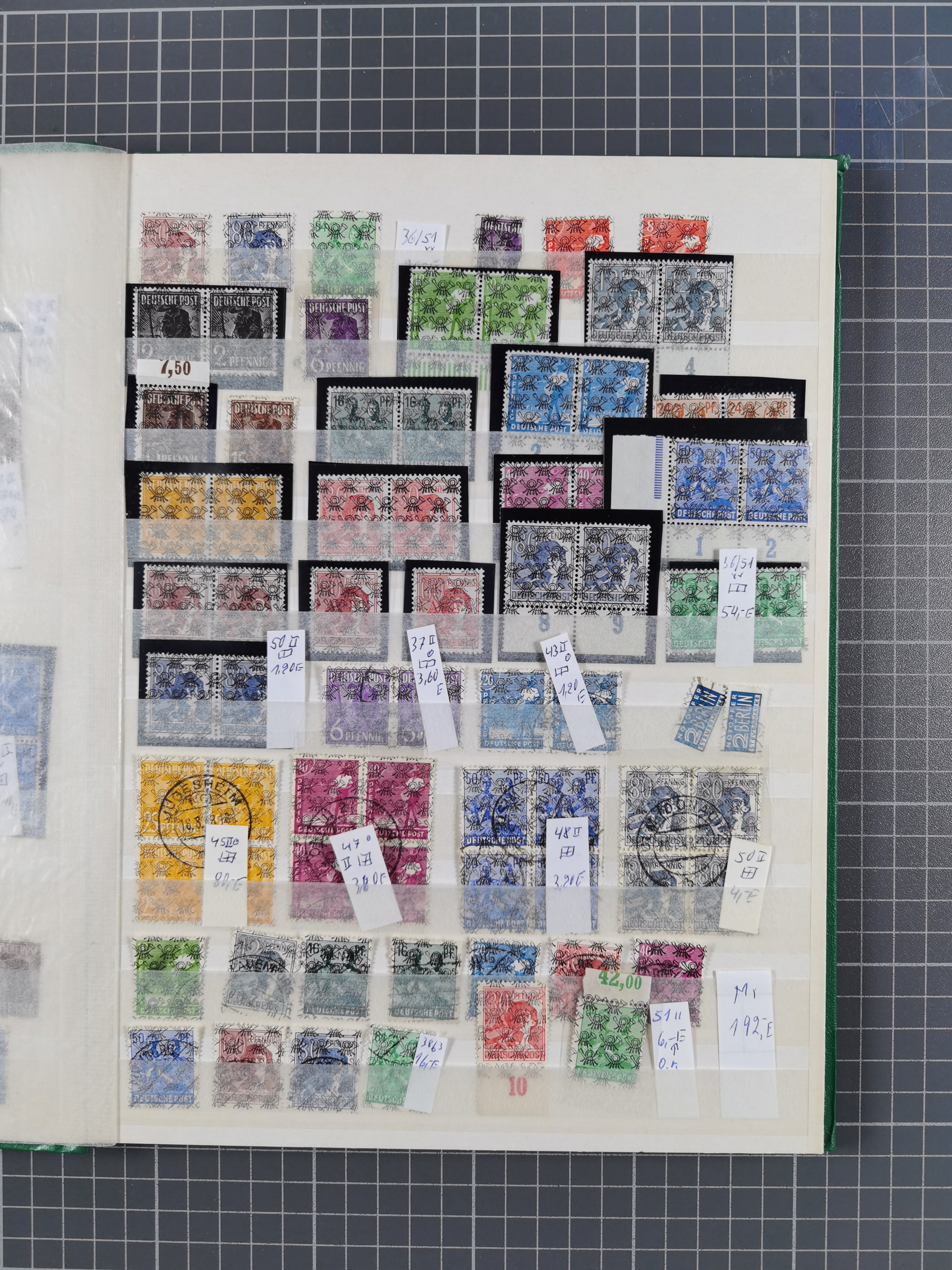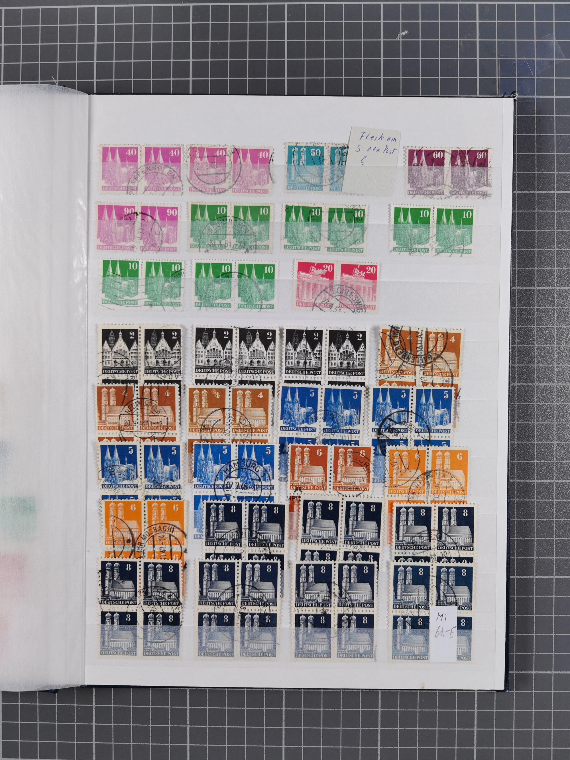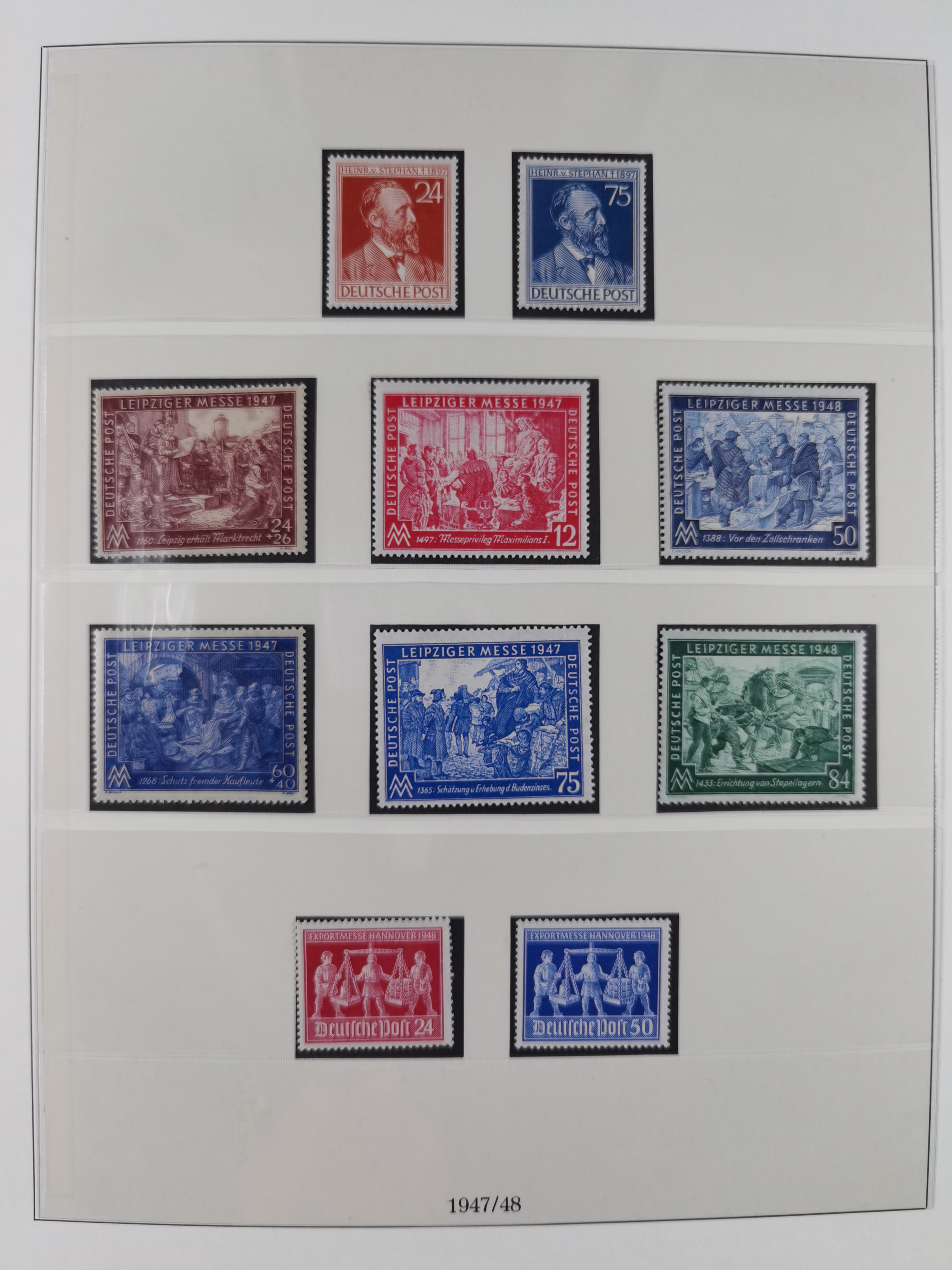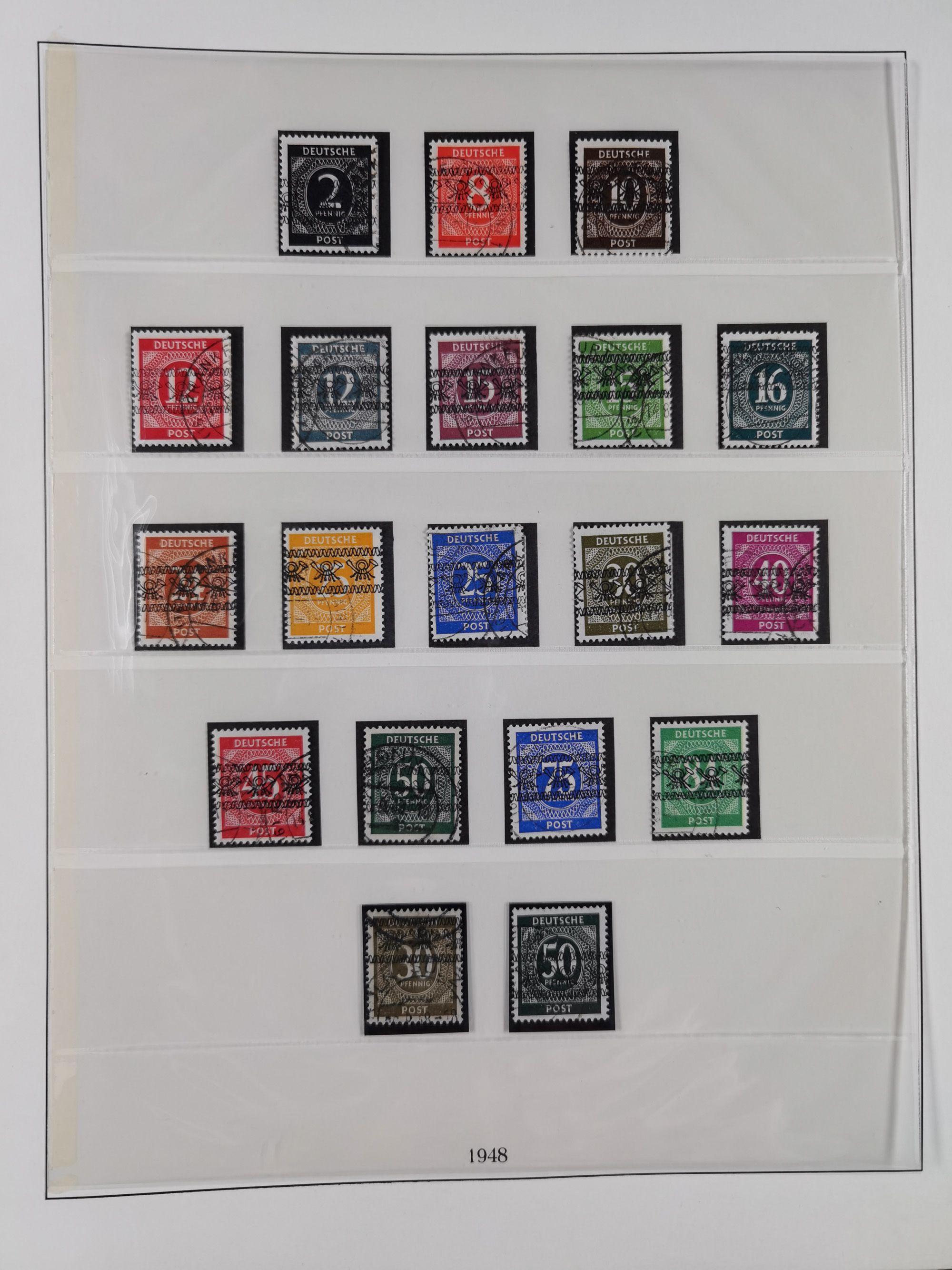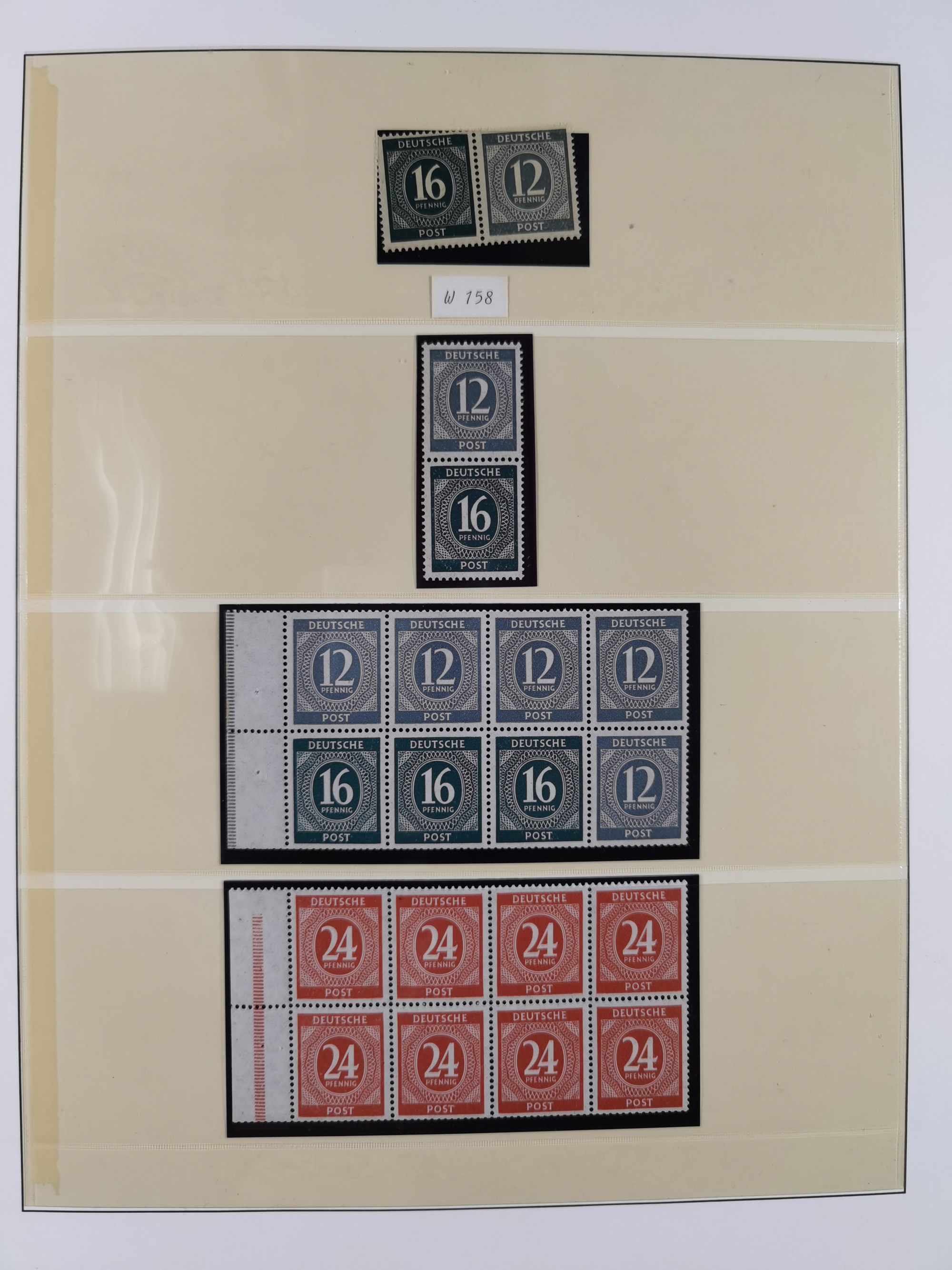 1948, meist postfrischer und gestempelter Bestand “Band/Netz” und “Bauten” mit u.a. Viererblocks, Marken mit Rändern, Bogenecken, Aufdruck-Abarten, in zwei Alben