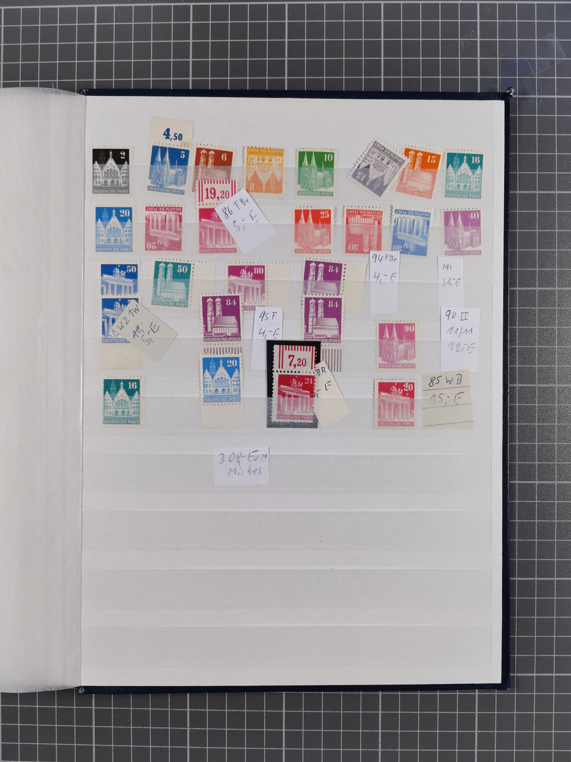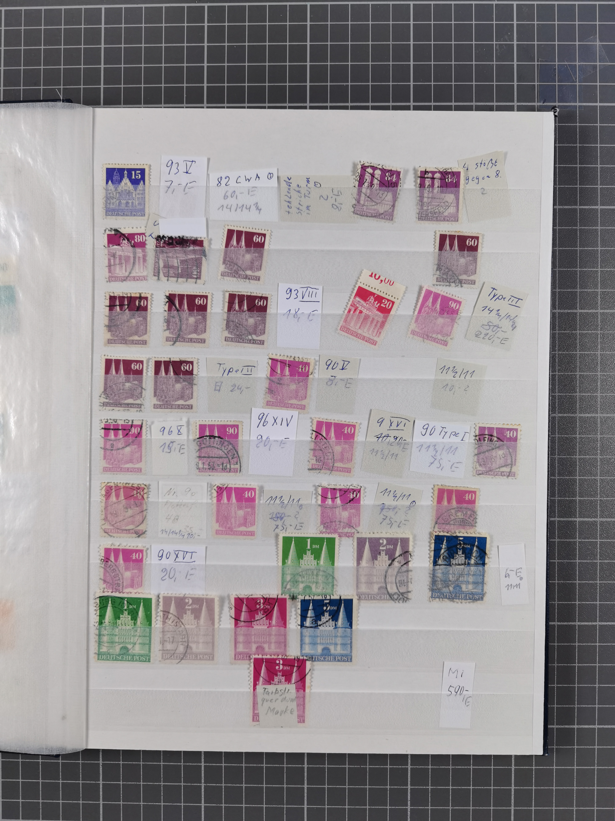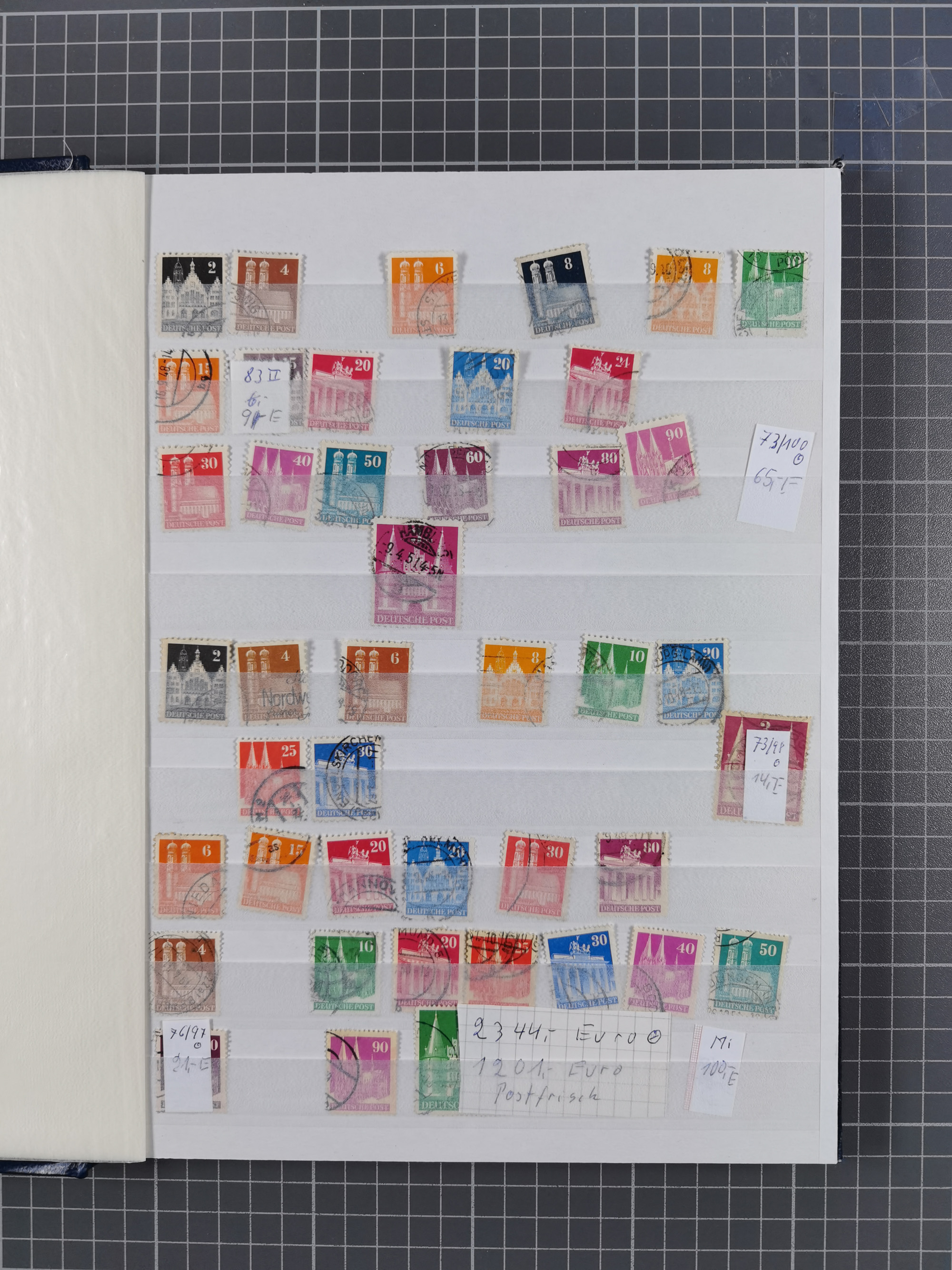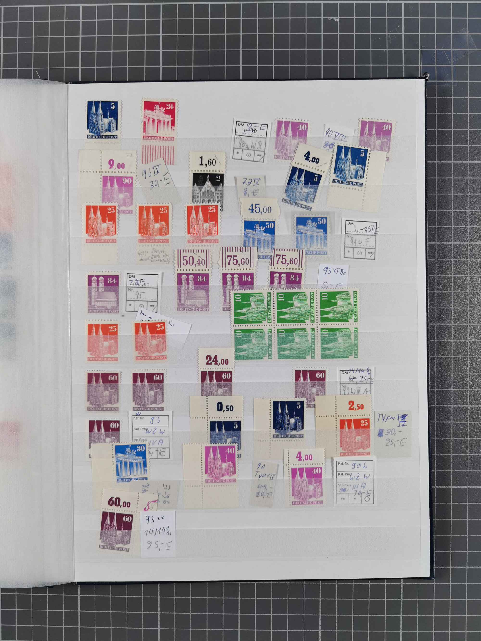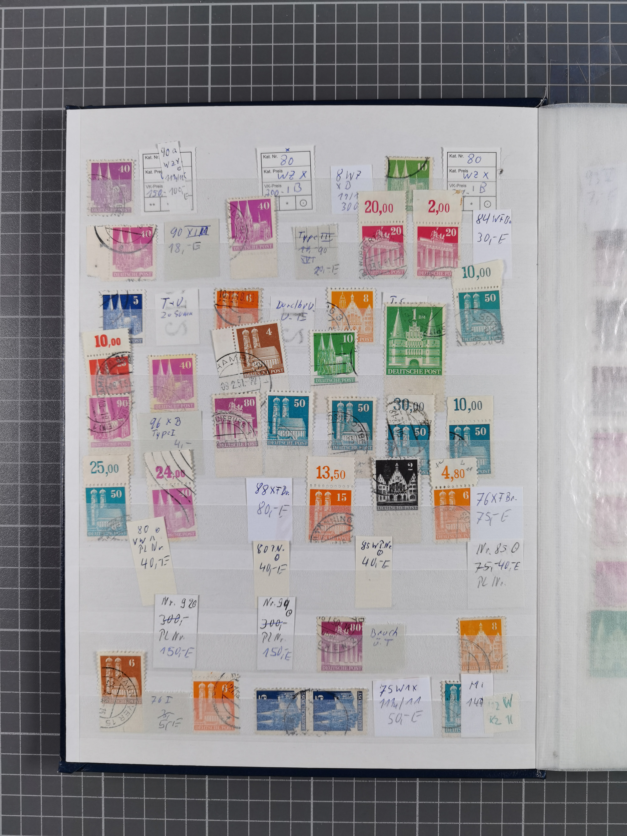 1948, meist postfrischer und gestempelter Bestand “Band/Netz” und “Bauten” mit u.a. Viererblocks, Marken mit Rändern, Bogenecken, Aufdruck-Abarten, in zwei Alben