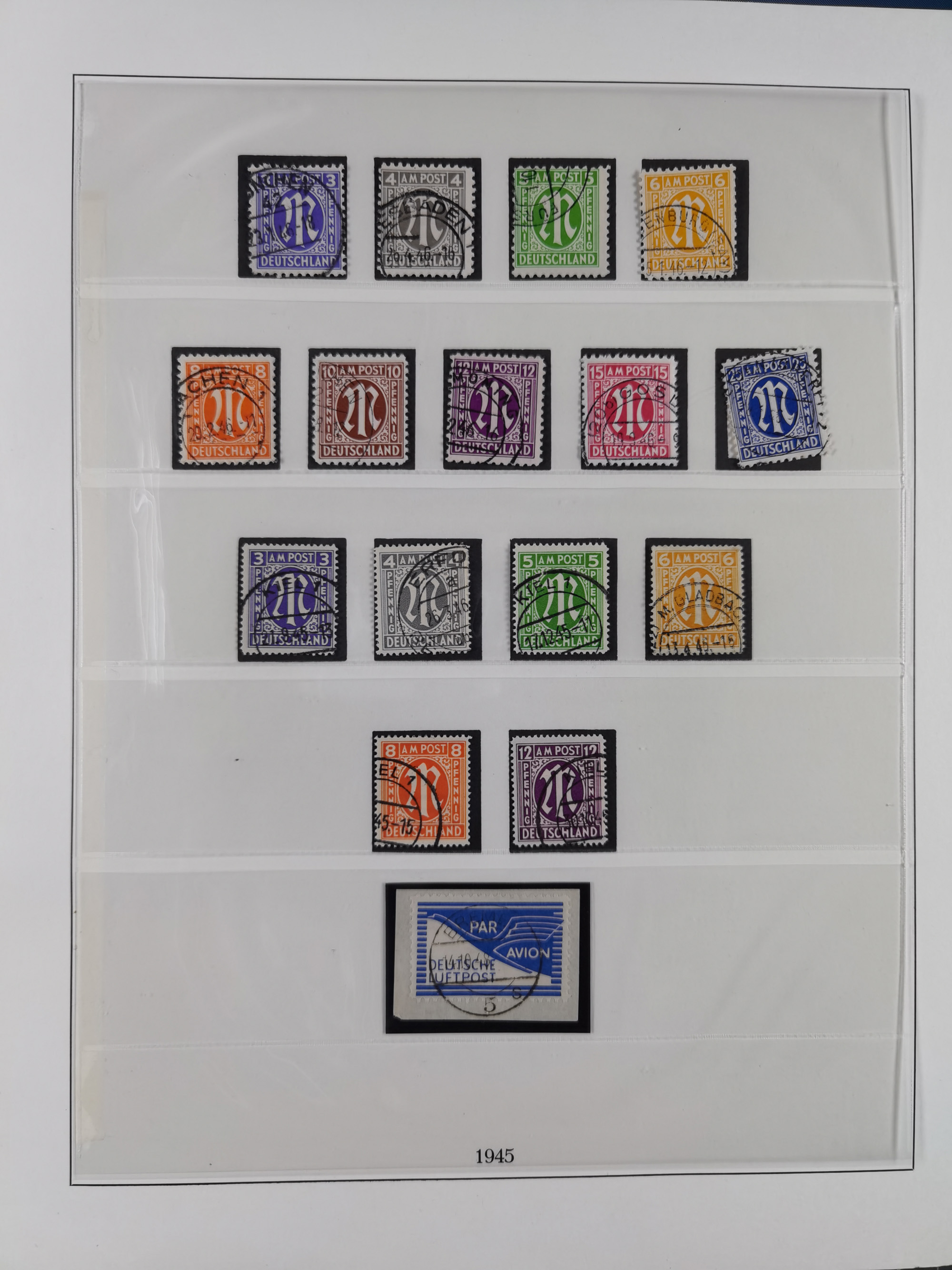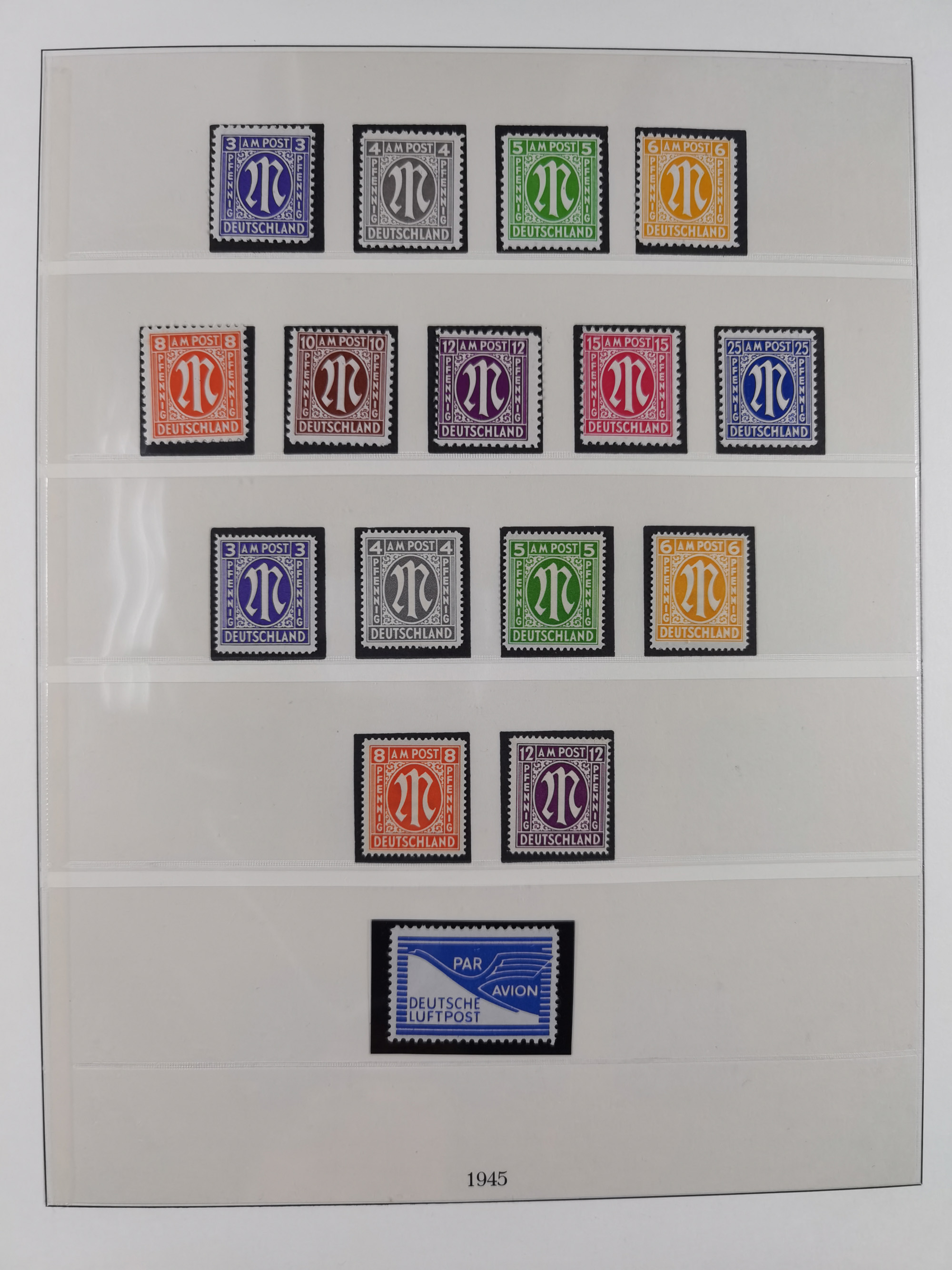 1945, postfrischer Engrosbestand AM-Post 3 Pfg. und 6 Pfg. Amerikanischer Druck, schätzungsweise 200 Bögen zu 3 Pfg. und 100 Bögen zu 6 Pfg., dabei eine ungeöffnete Bogentasche 3 Pfg. (der obere Deckel mit Einriss sowie Brandspuren; dort zwei Marken des ersten Bogens fehlend), die obersten und untersten Bögen teils mit stärkeren Antrennungen und fehlenden Marken, sonst in guter Erhaltung mit teils üblichen Lagerspuren (Mi.-Nr. ex 1-9)