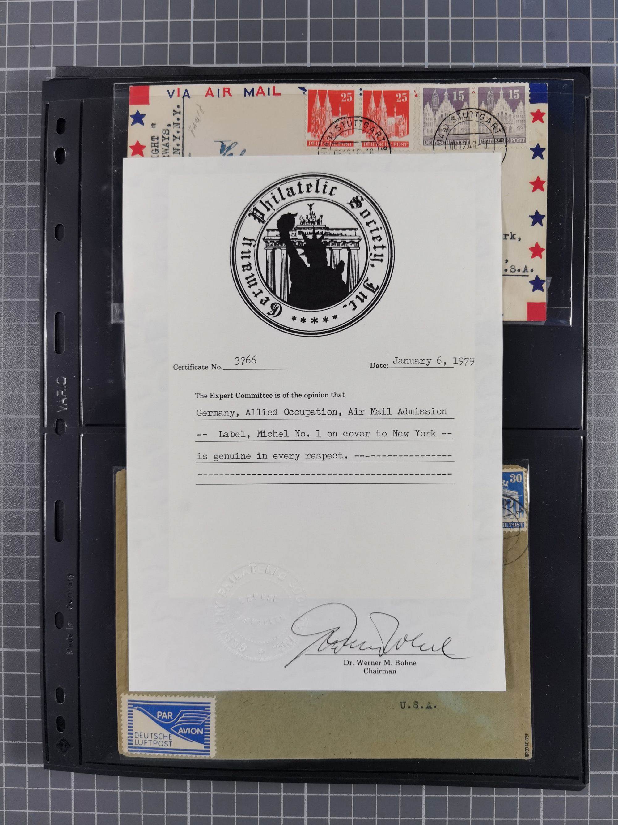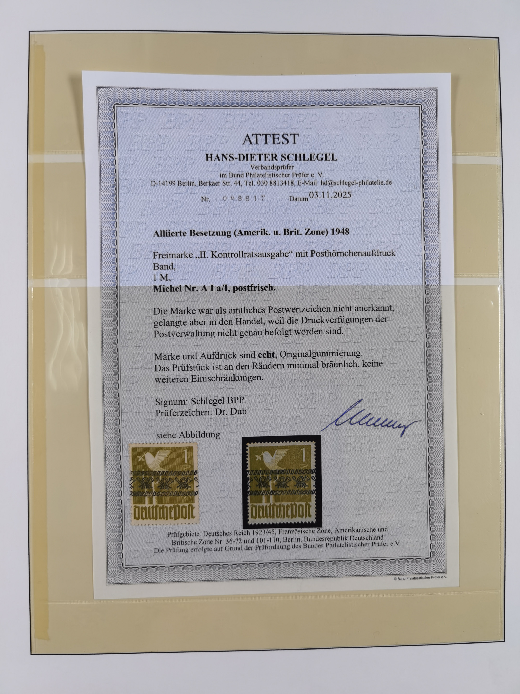 1 M. mittelgelblichgrün, Type II, gezähnt L 11 und mit Wasserzeichen “steigende Wellenlinien” (WZ. 3Y), sehr sauber mit Stempel “REILINGEN über SCHWETZINGEN 13.11.50” entwertet. In der Zähnung fehlt rechts oben ein Zahn und oben hat die Marke einen kurzen Zahn, ansonsten in einwandfreier Erhaltung. Fast alle Marken mit dieser Wasserzeichen-Abart haben kleine Fehler bzw. sind fehlerhaft. Ein optisch ansprechendes Exemplar mit sehr schöner Entwertung, Fotoattest Rolle BPP (2026)