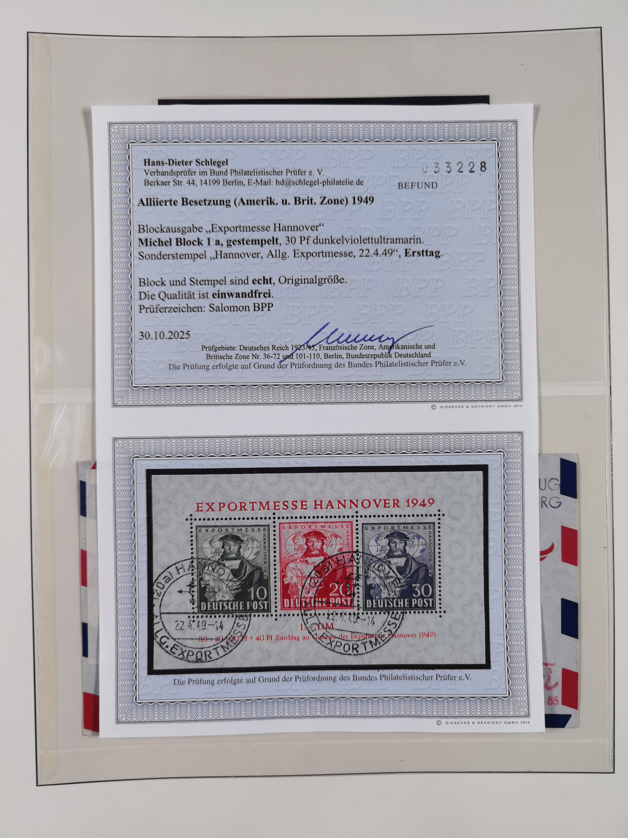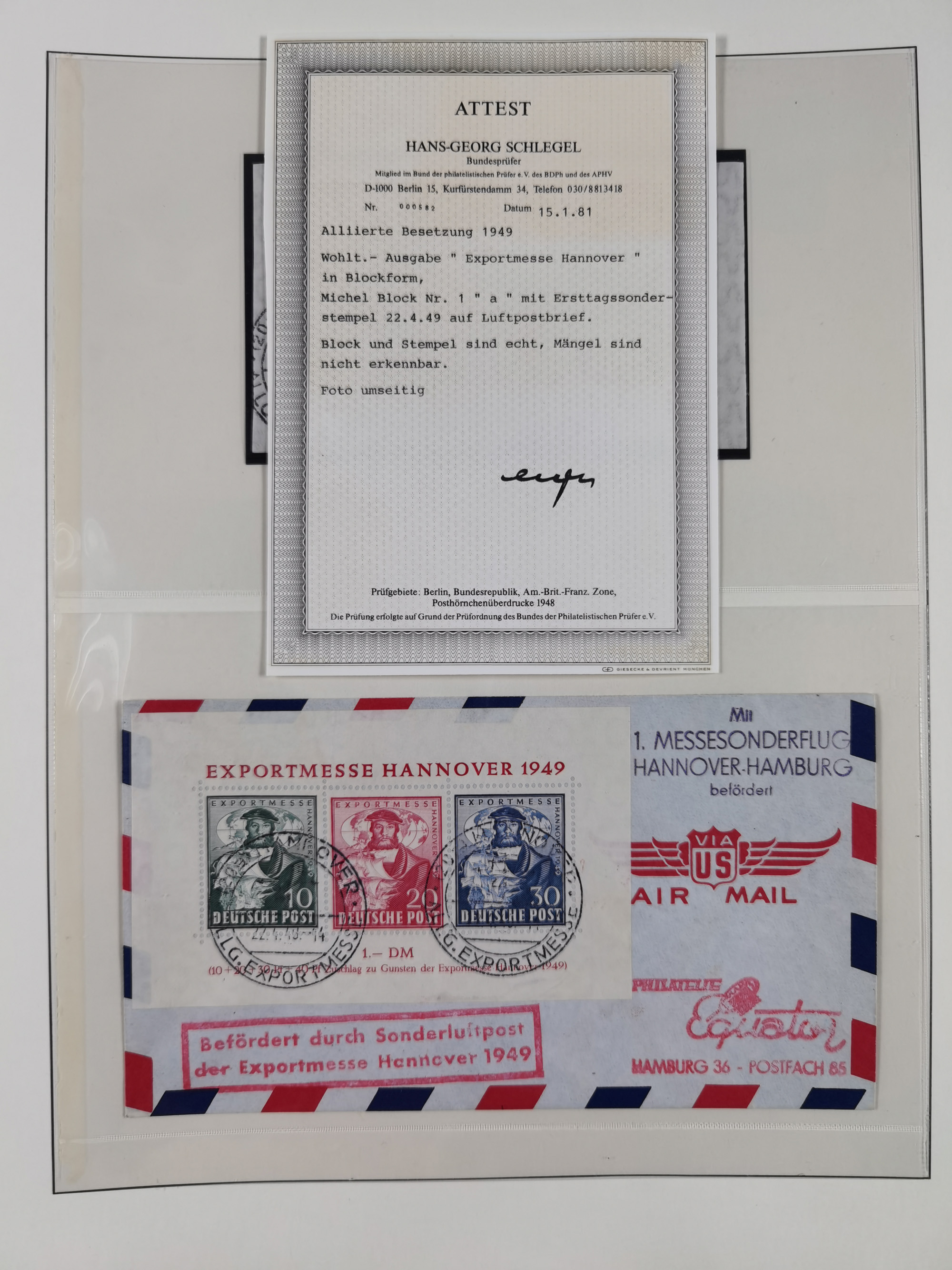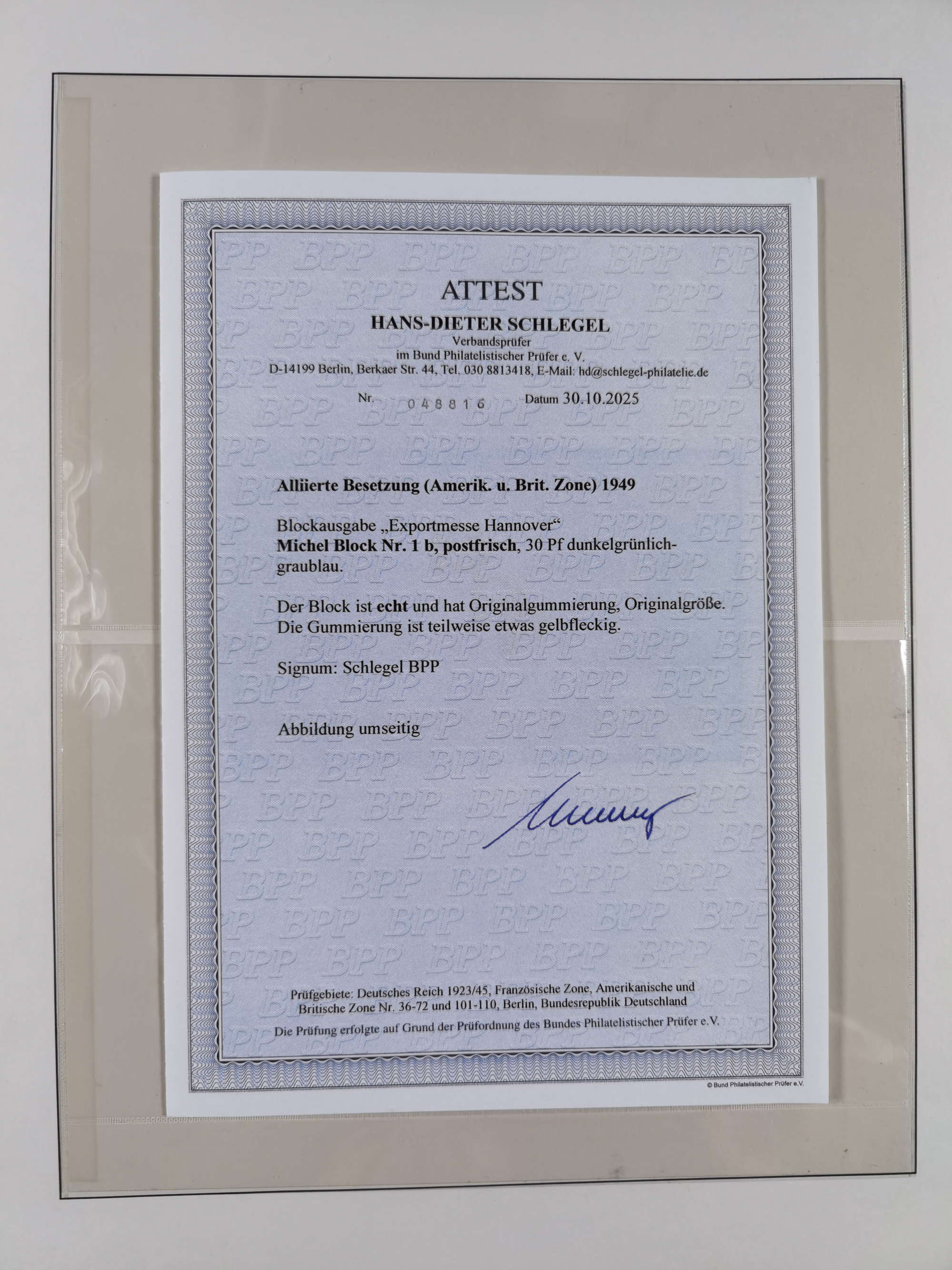 1949, Exportmesse Hannover-Block mit 30 Pfg. dunkelgrünlichgraublau, postfrisch und in einwandfreier Erhaltung, dreifach signiert Schlegel BPP mit Fotoattest (1995)