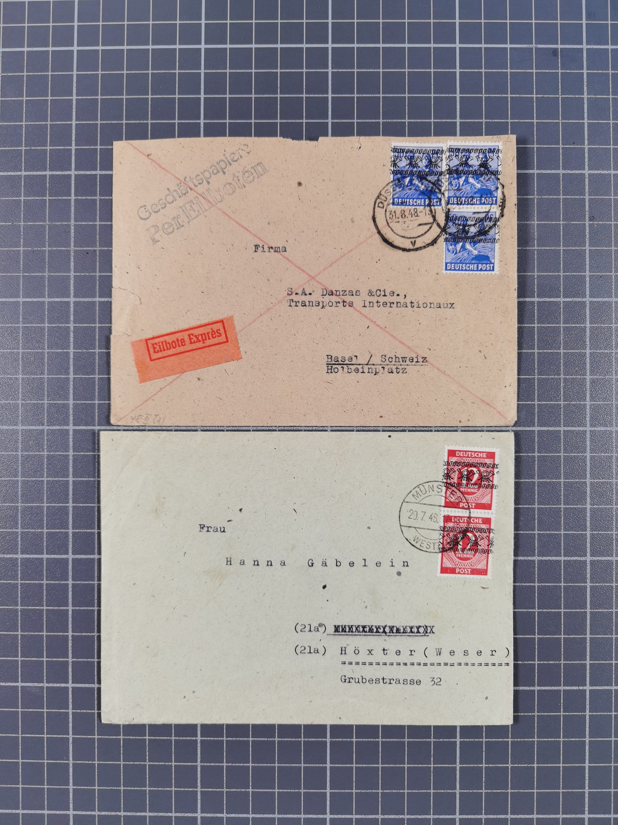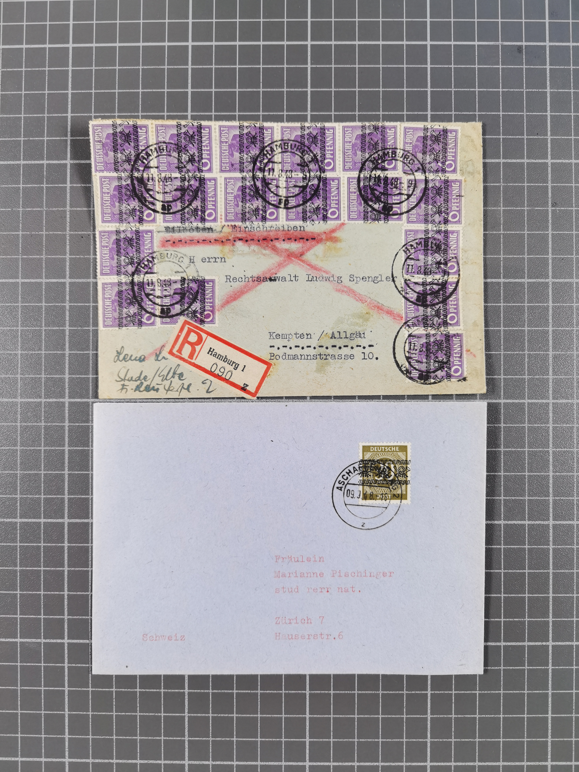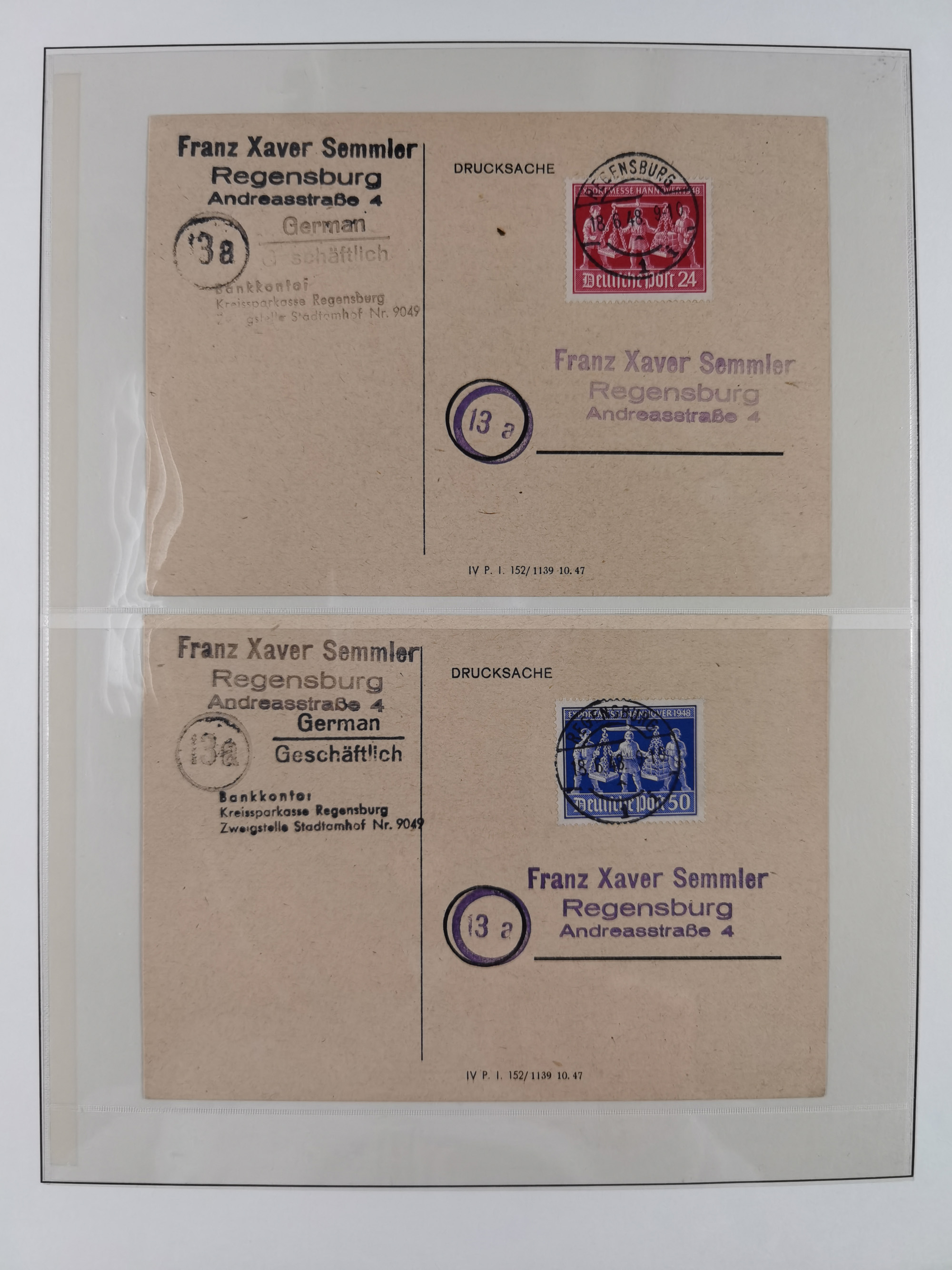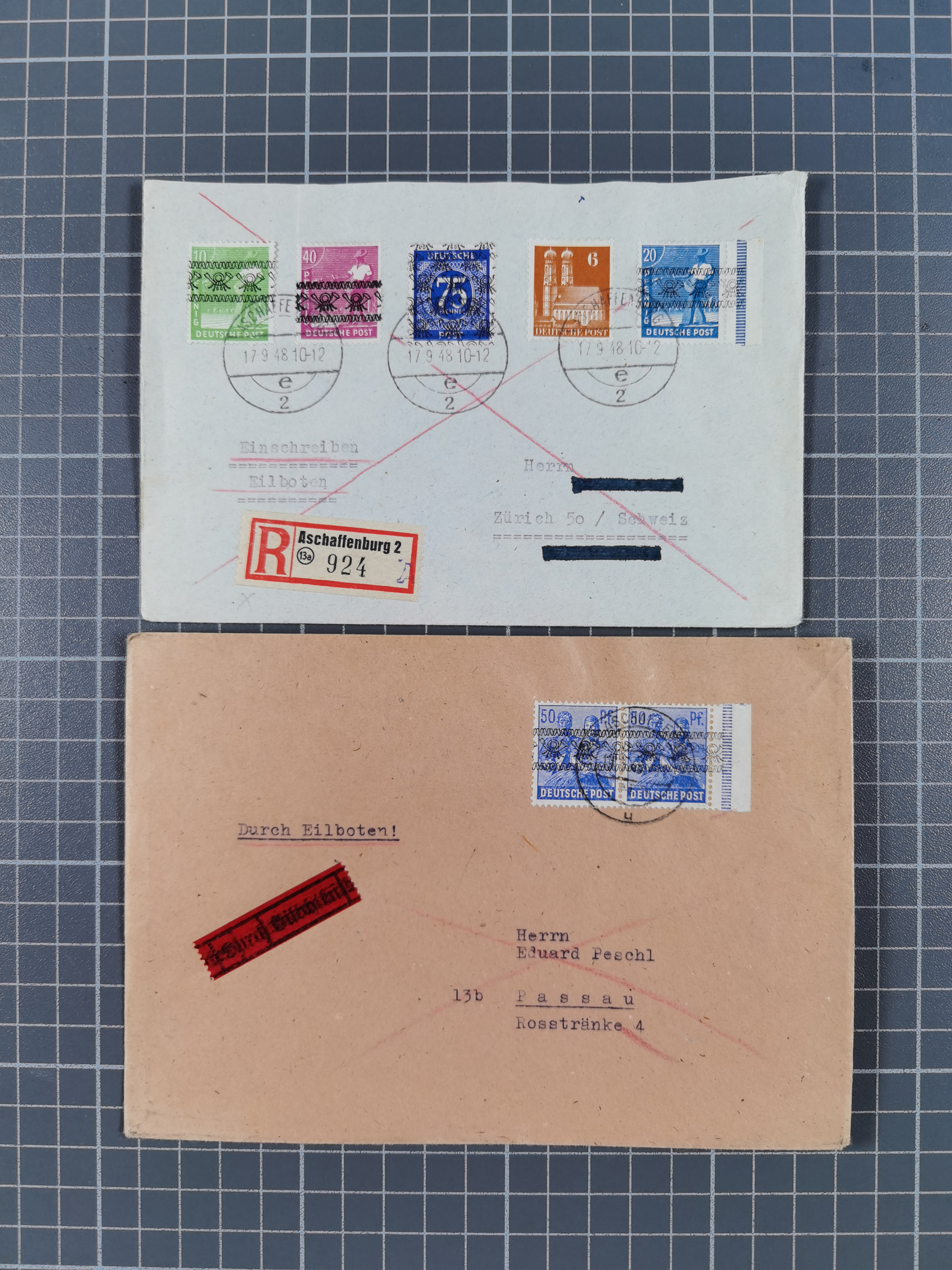 1948, über 120 Briefe und Karten mit Band/Netz-Frankaturen inkl. vieler Einzel- und Mehrfachfrankaturen, dabei bessere Frankaturen, R-Briefe, sieben JEIA-Briefe inkl. MeF Mi.-Nr. 39II (15) und MEF Mi.-Nr. 45I (6), Mi.-Nr. 37I MEF (18), Mi.-Nr. 48I MEF (3) auf Eilboten-Brief nach Basel und Mi.-Nr. 55I MEF (sign. Schlegel BPP)