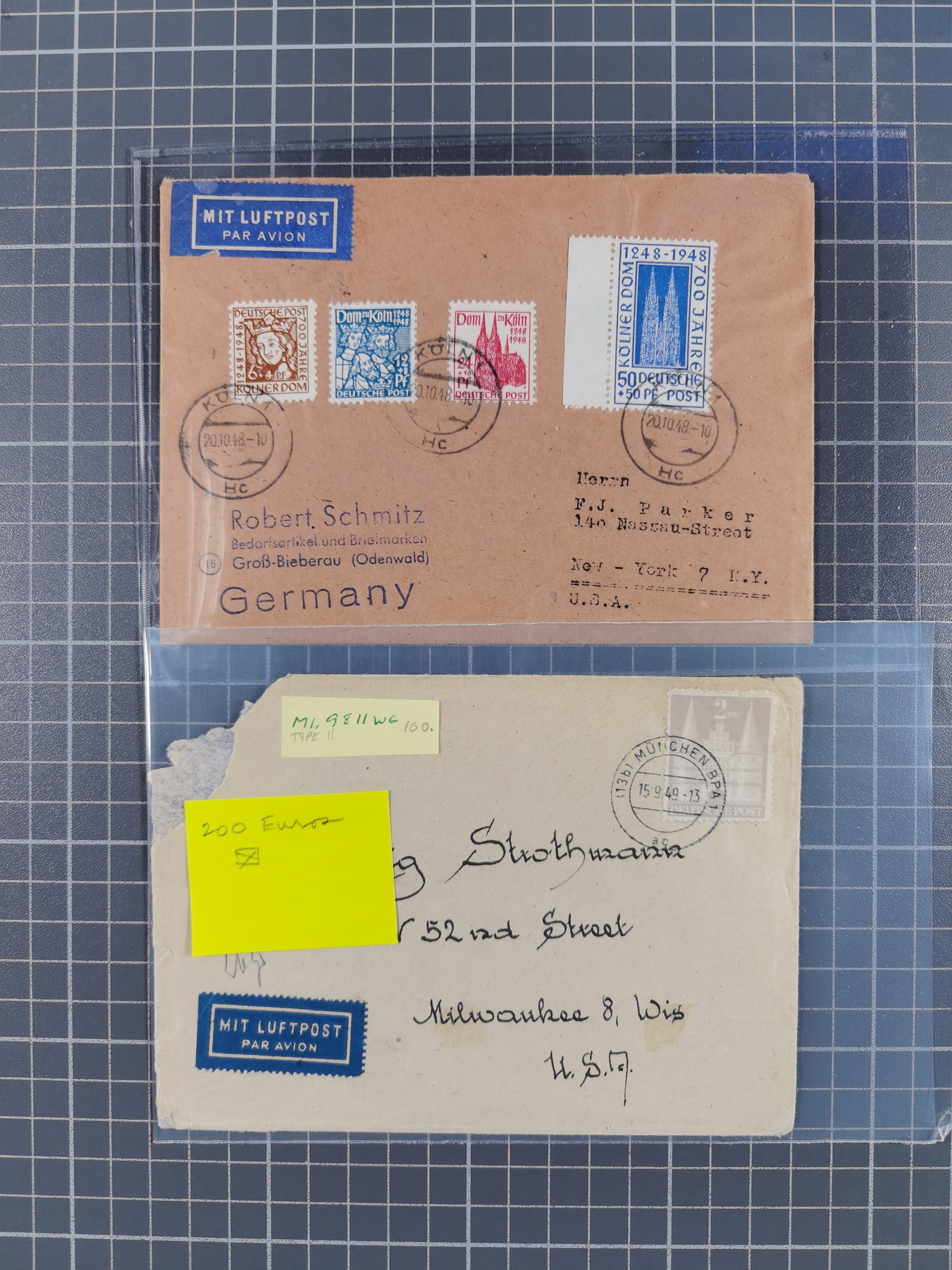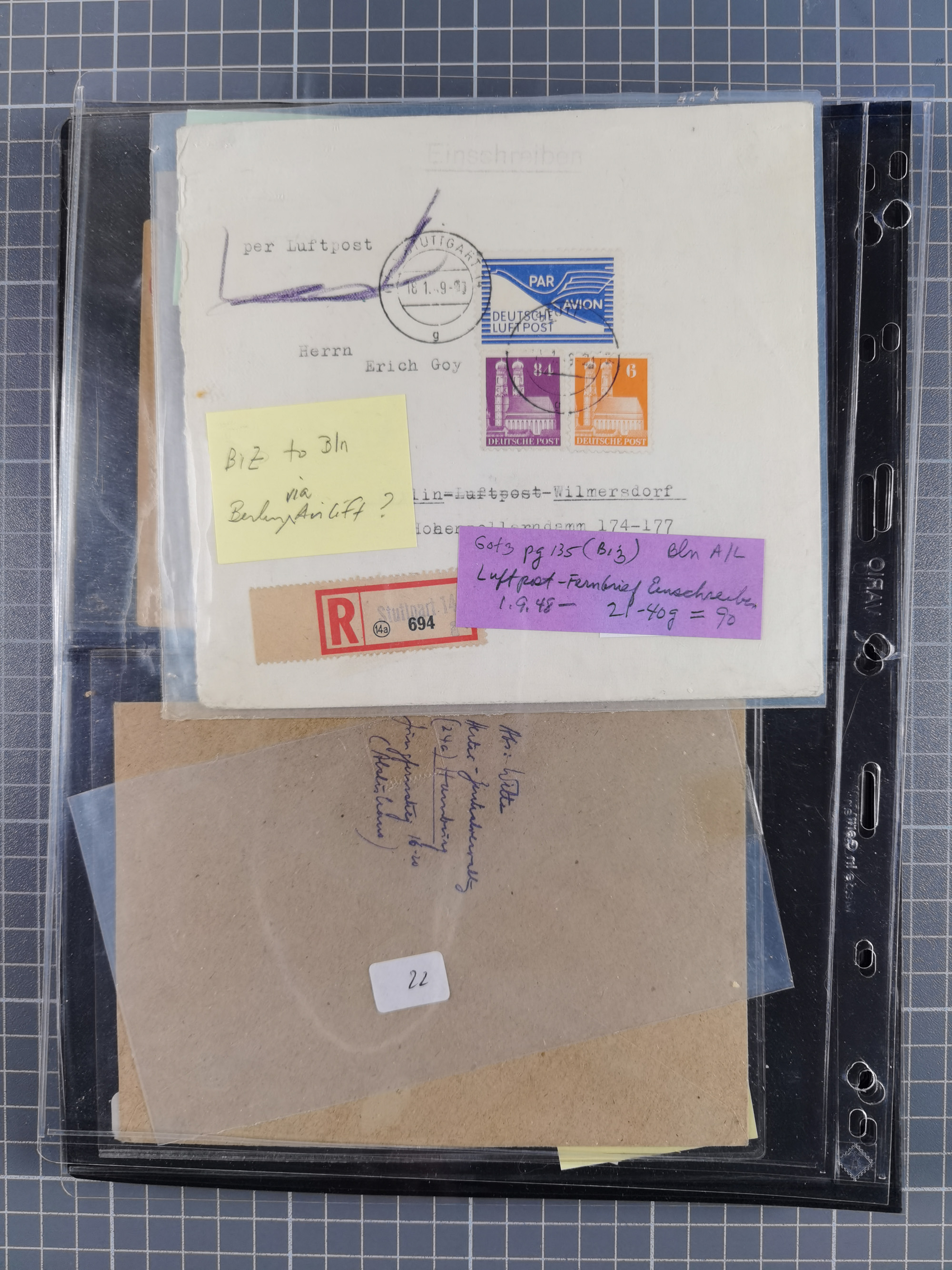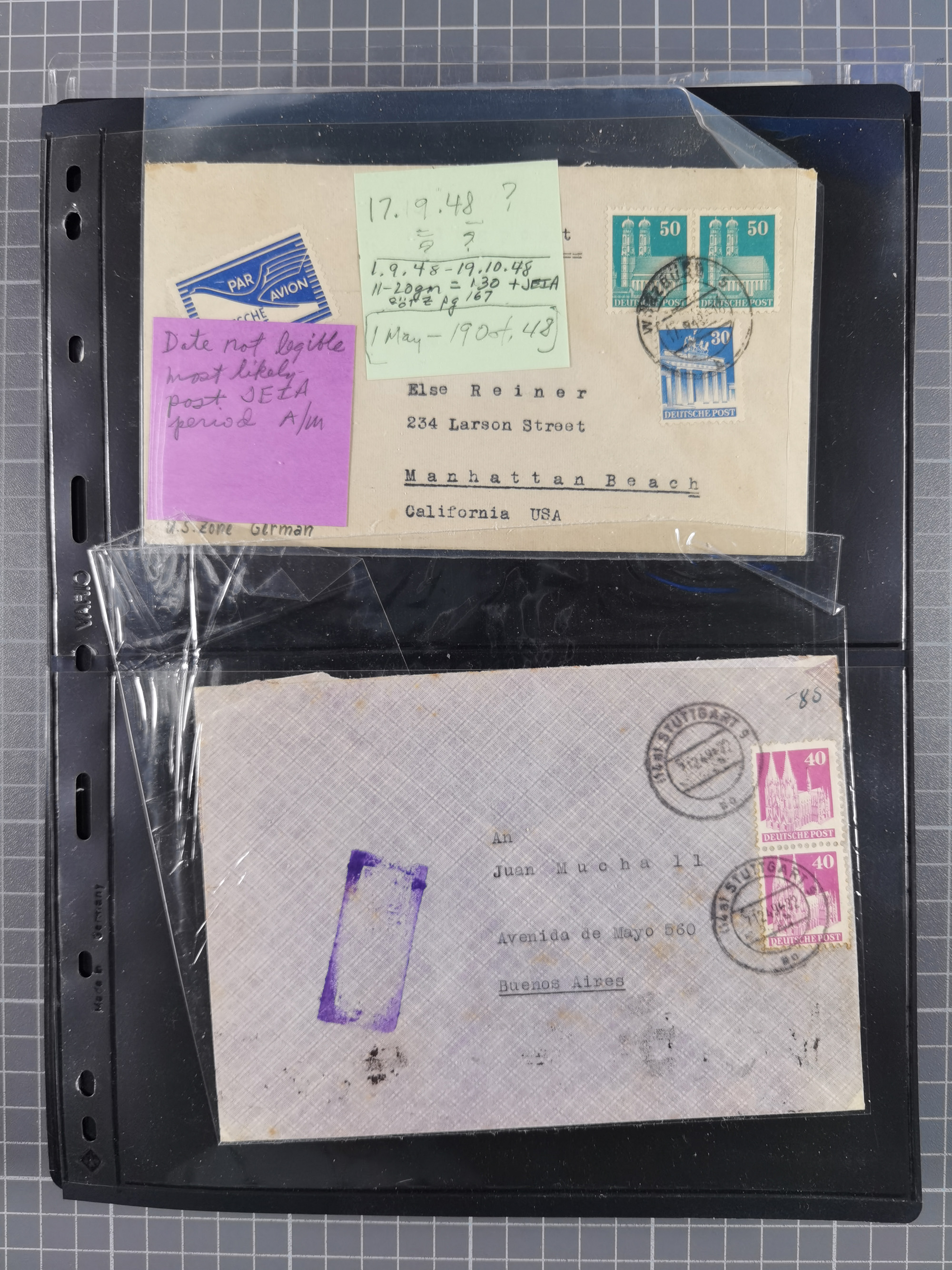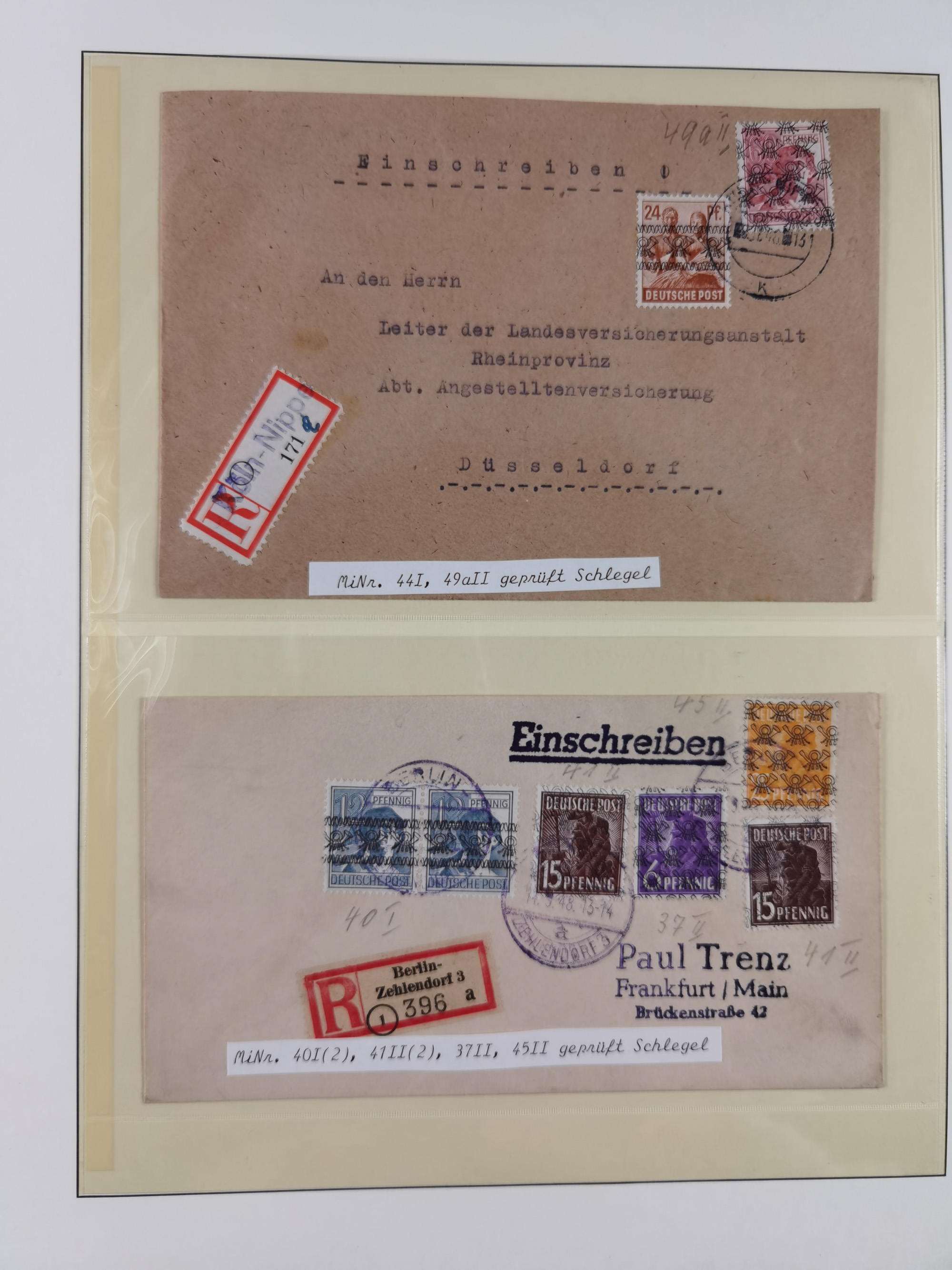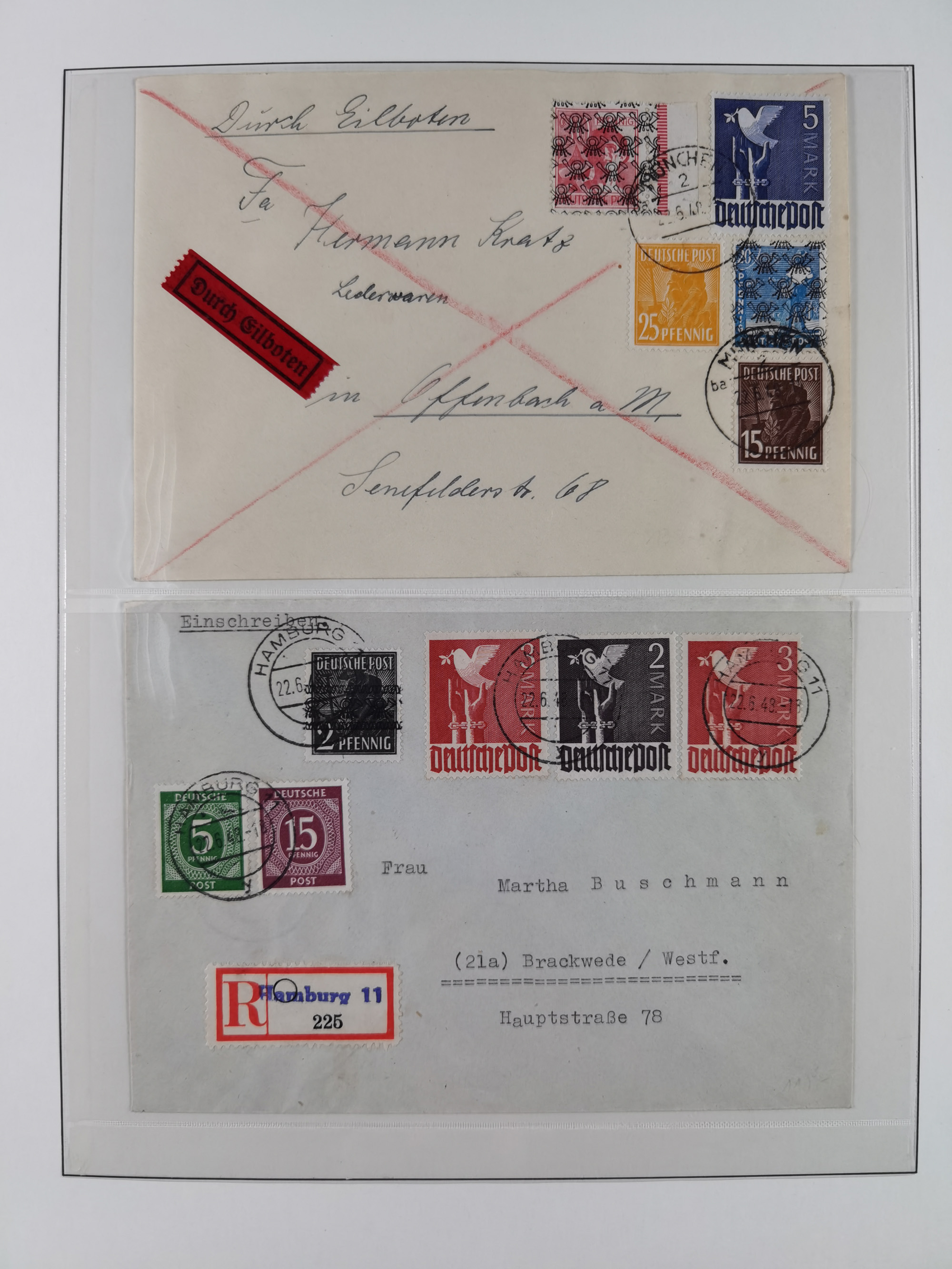 1948/49, ca. 80 Briefe,Karten und Ganzsachen mit Bauten-Frankaturen, dabei oft Auslandspost mit vielen Luftpost-Frankaturen in die USA mit u.a. Mi.-Nr. 97wg im waagerechten Paar auf Luftpost-Brief, senkrechtes Paar Mi.-Nr. 98+90 auf großformatigem Luftpostbrief und Mi.-Nr. 100+93 auf großformatigem Luftpostbrief in die USA. Zum Teil die Briefe mit Randfehlern, vieles aus dem Bedarf