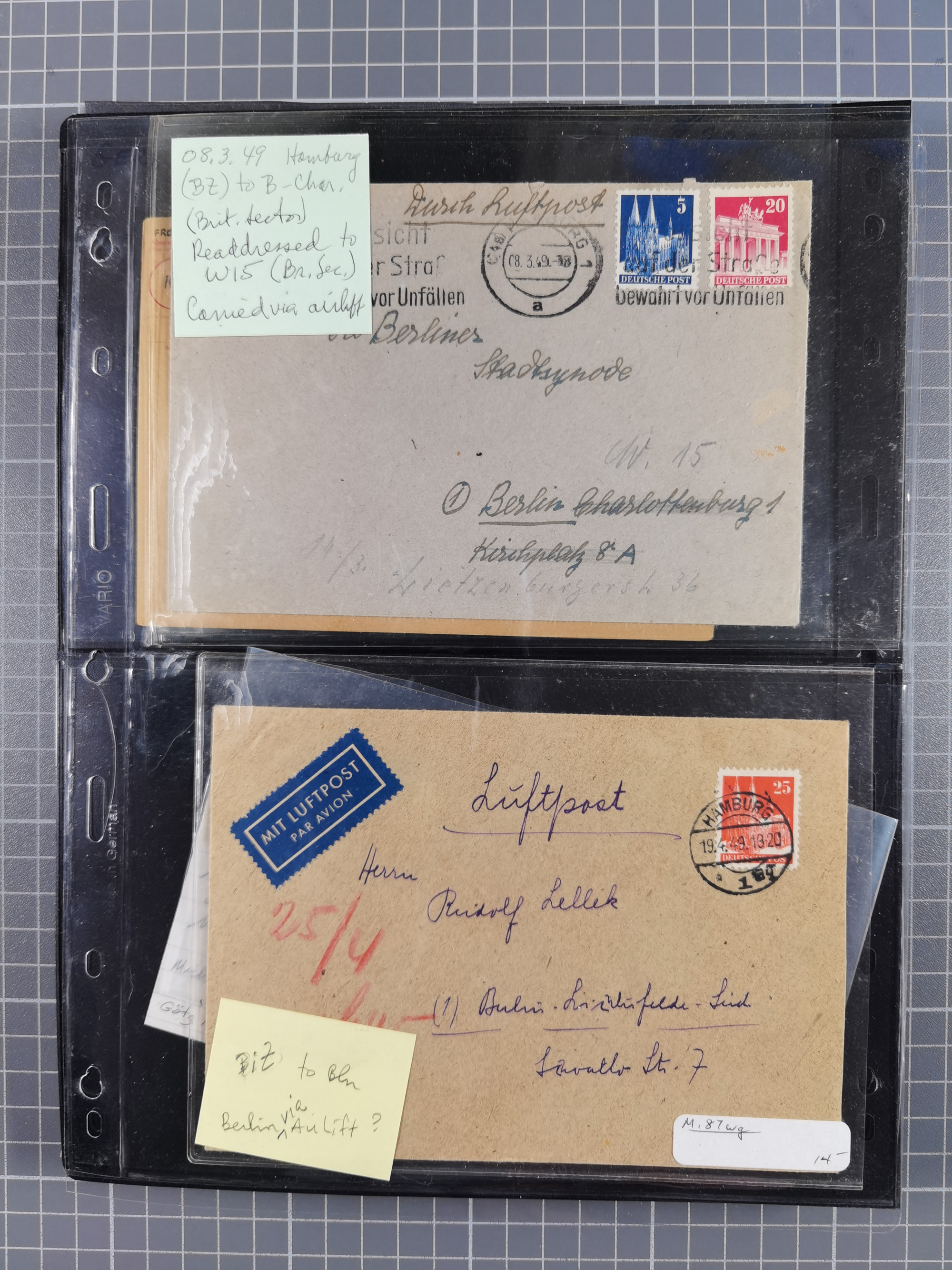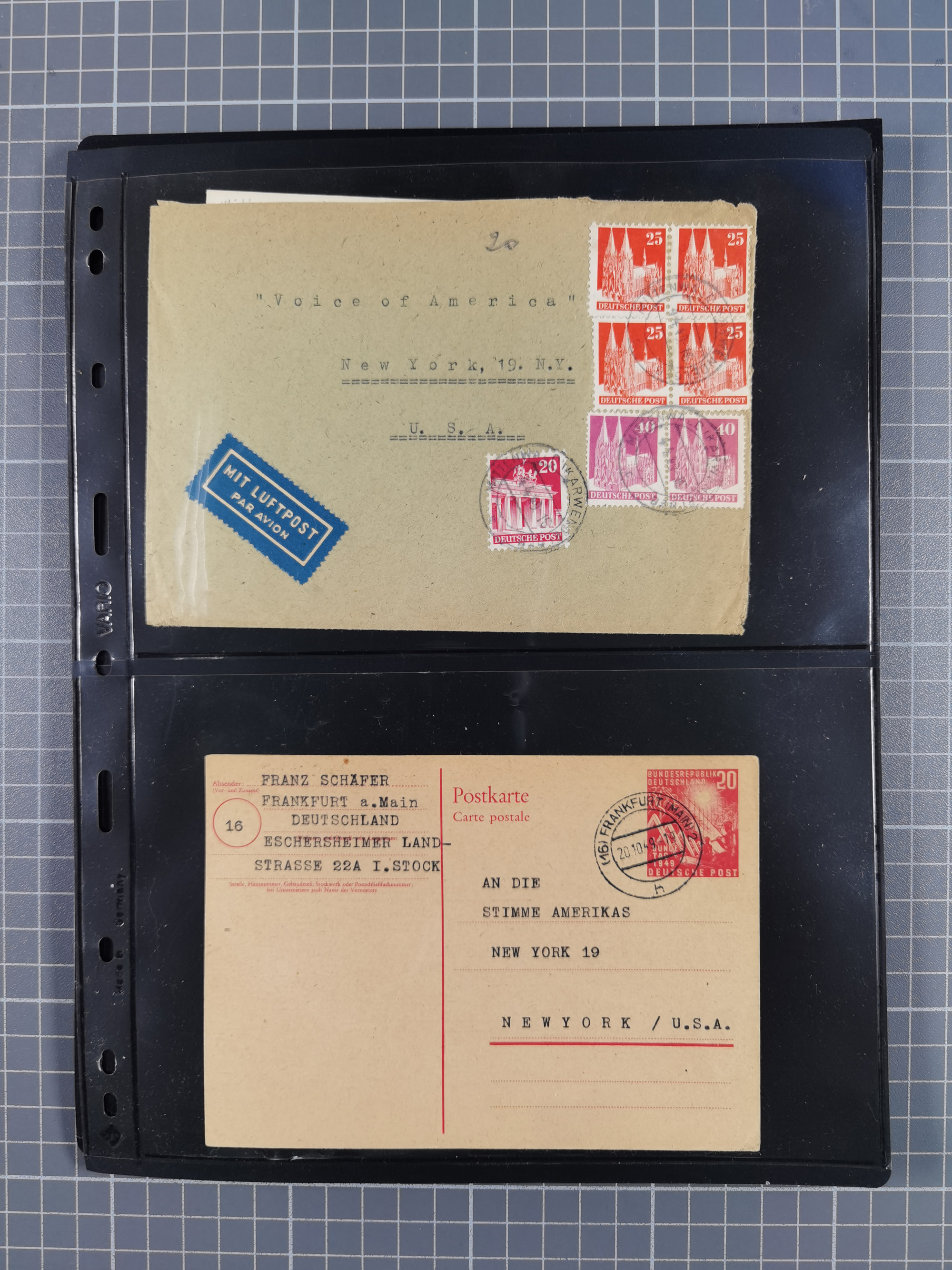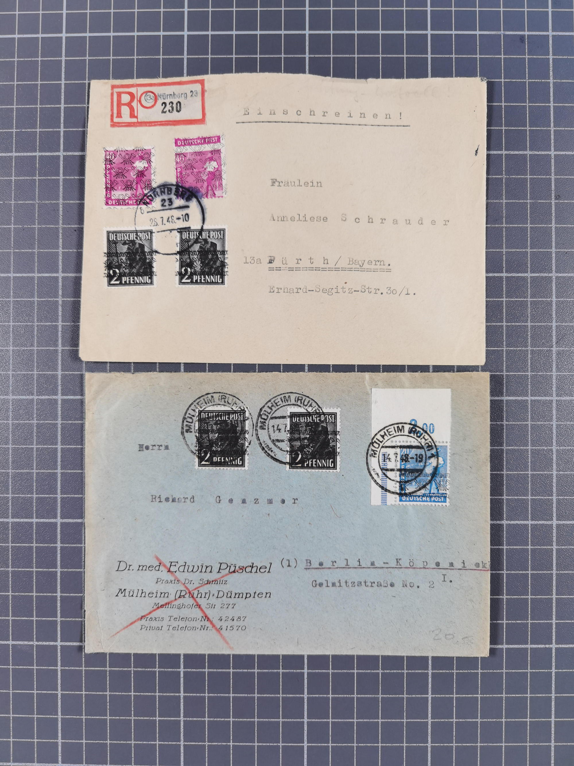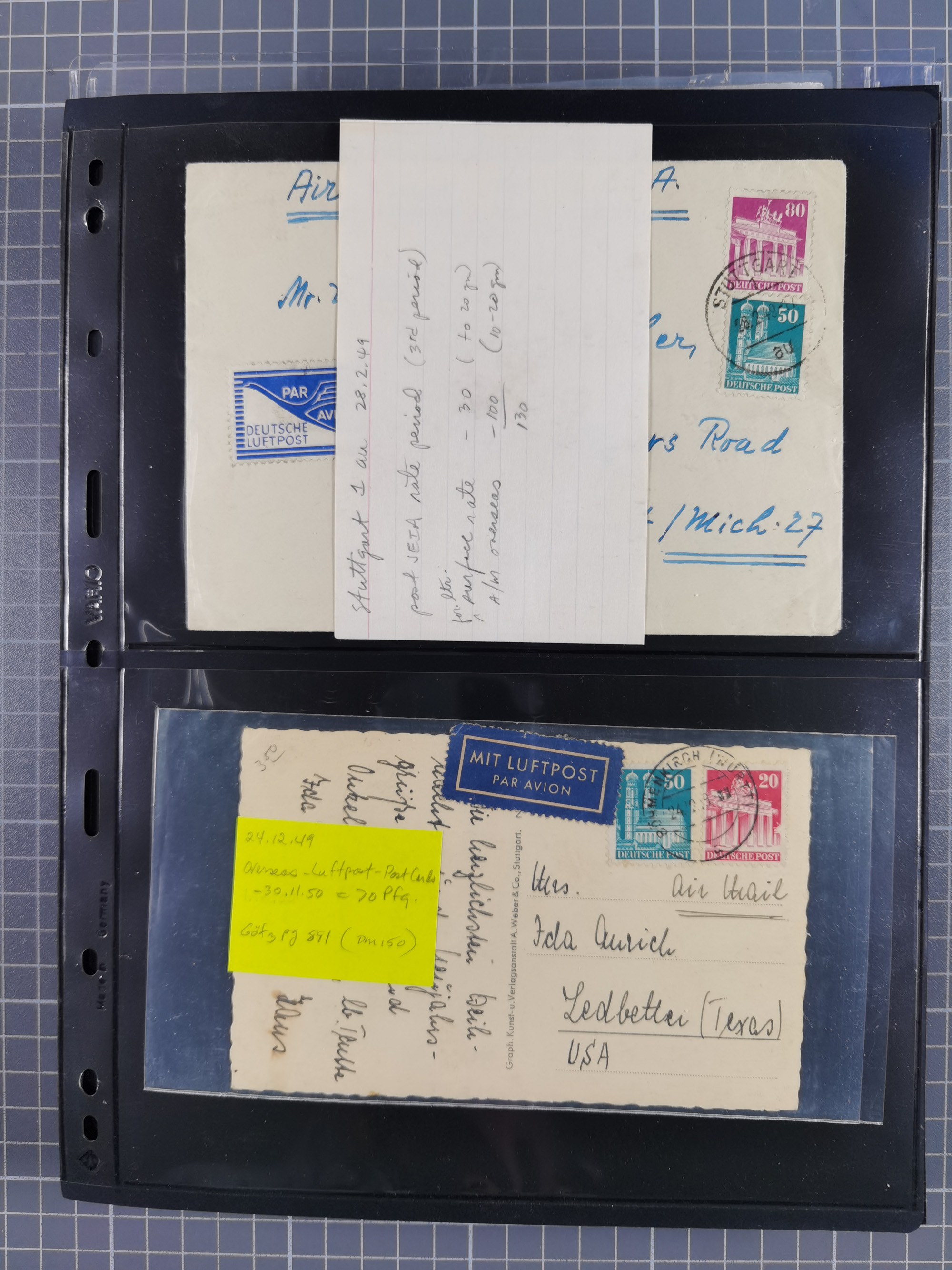 1948/49, ca. 80 Briefe,Karten und Ganzsachen mit Bauten-Frankaturen, dabei oft Auslandspost mit vielen Luftpost-Frankaturen in die USA mit u.a. Mi.-Nr. 97wg im waagerechten Paar auf Luftpost-Brief, senkrechtes Paar Mi.-Nr. 98+90 auf großformatigem Luftpostbrief und Mi.-Nr. 100+93 auf großformatigem Luftpostbrief in die USA. Zum Teil die Briefe mit Randfehlern, vieles aus dem Bedarf
