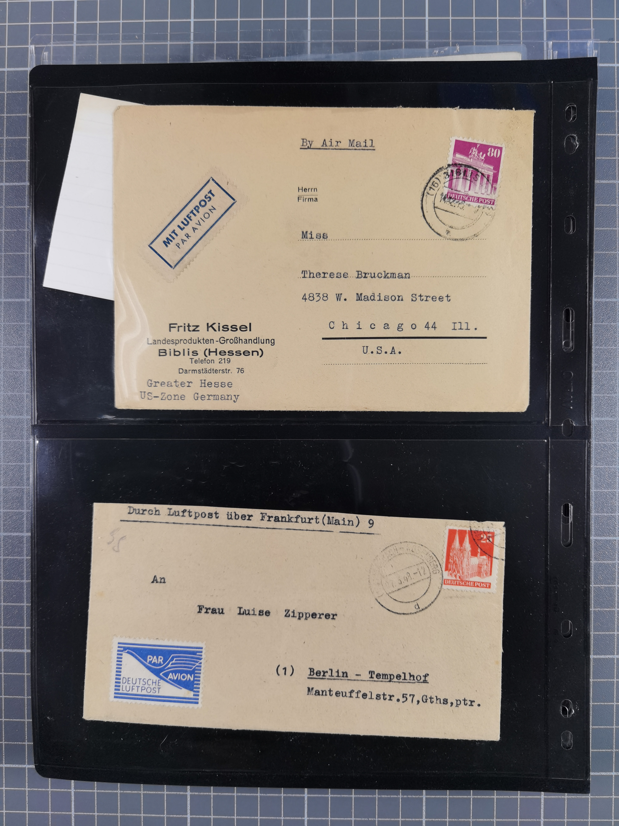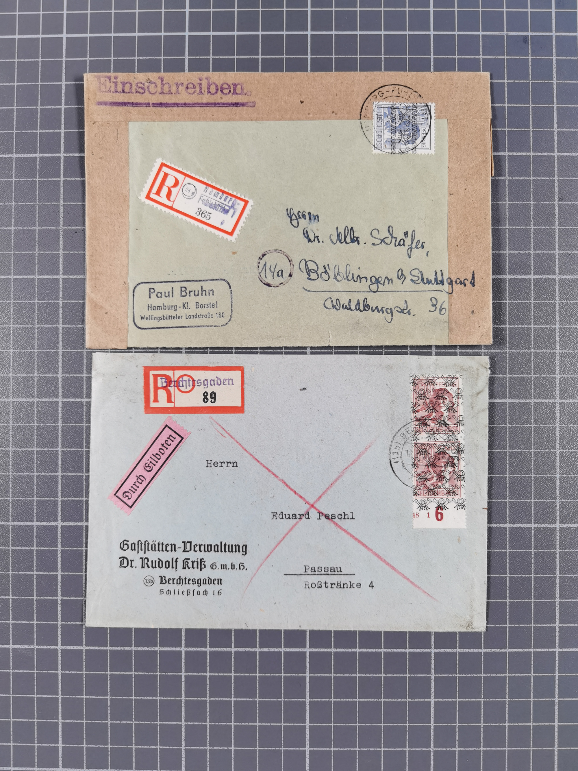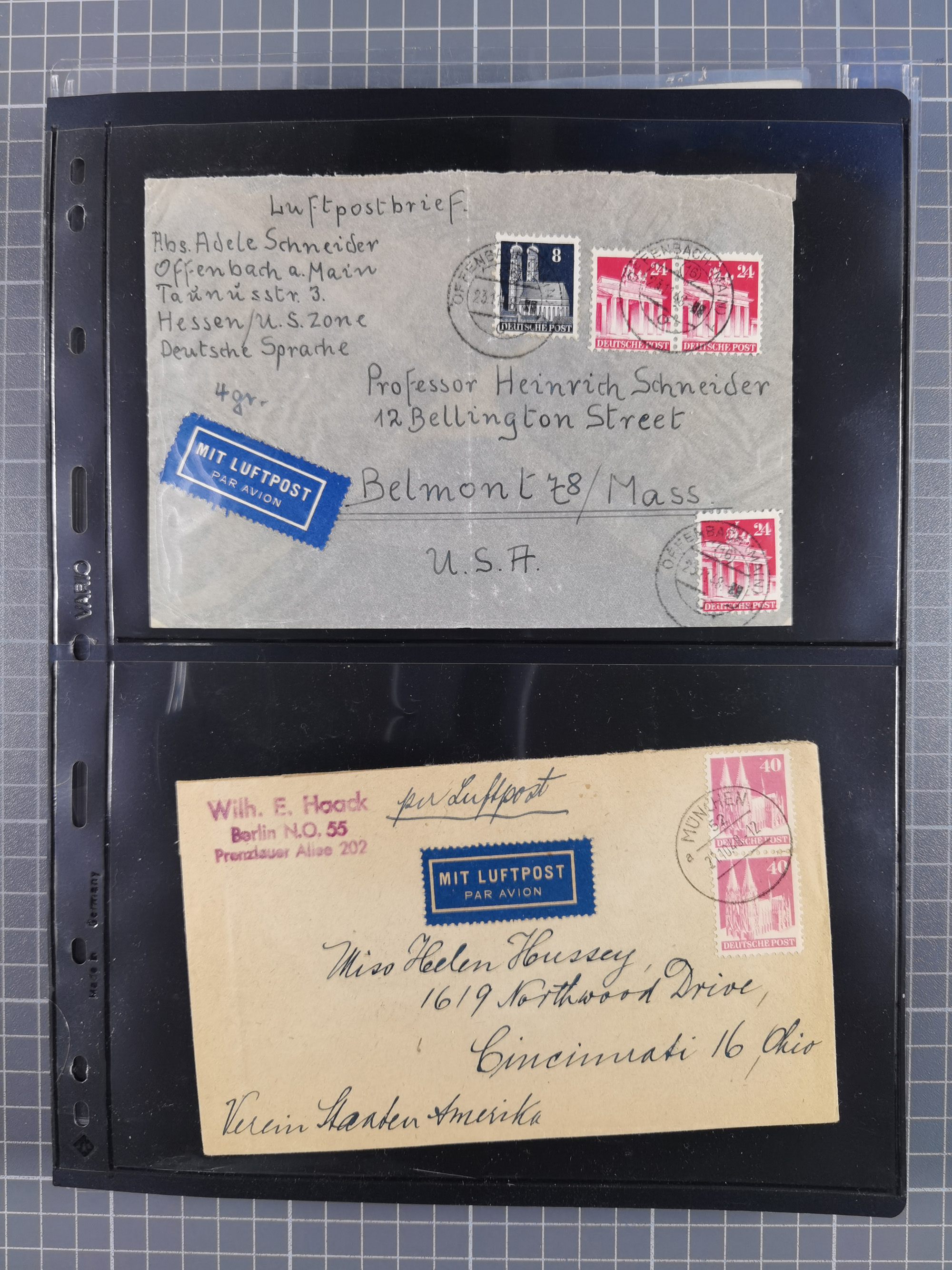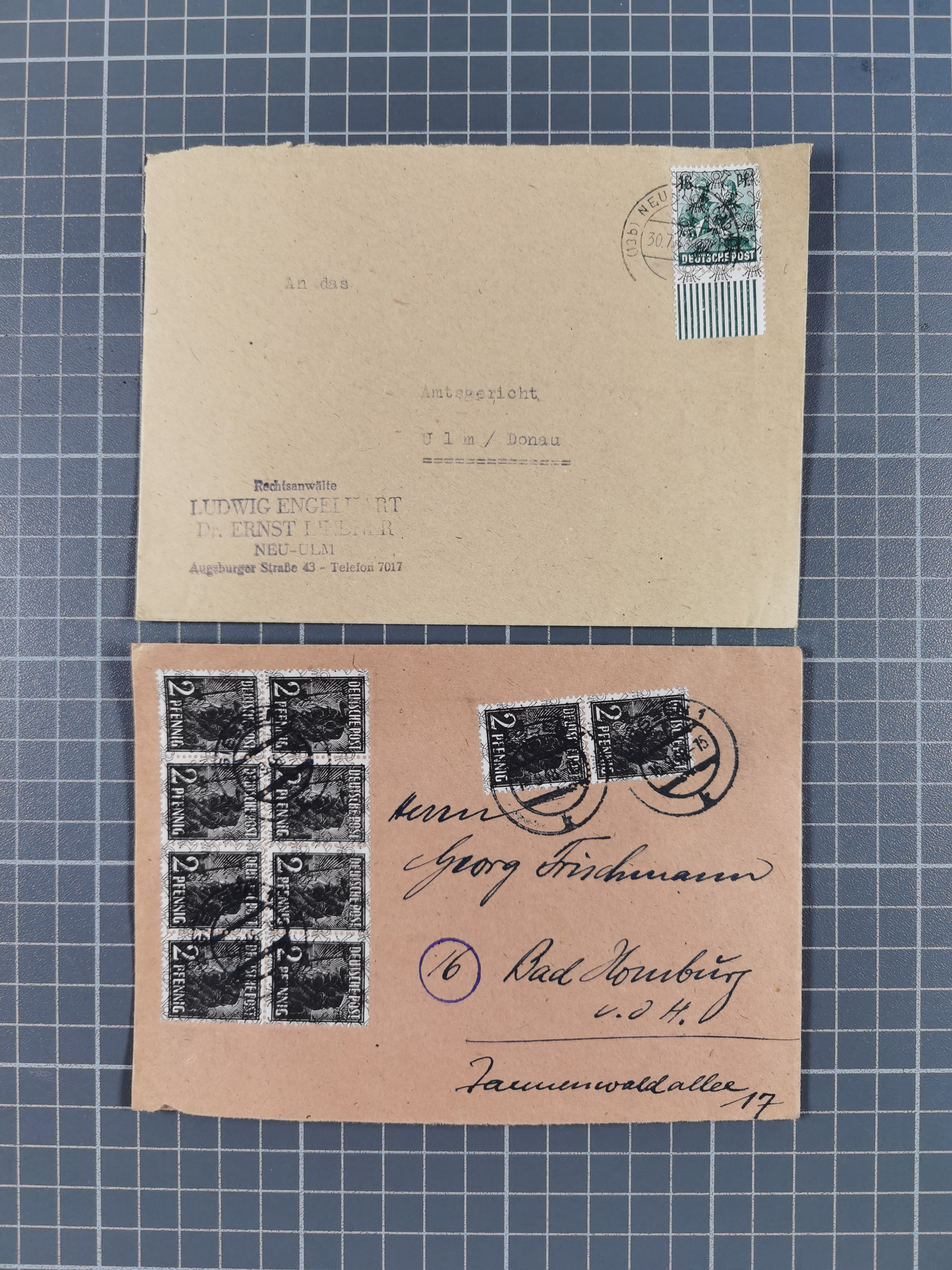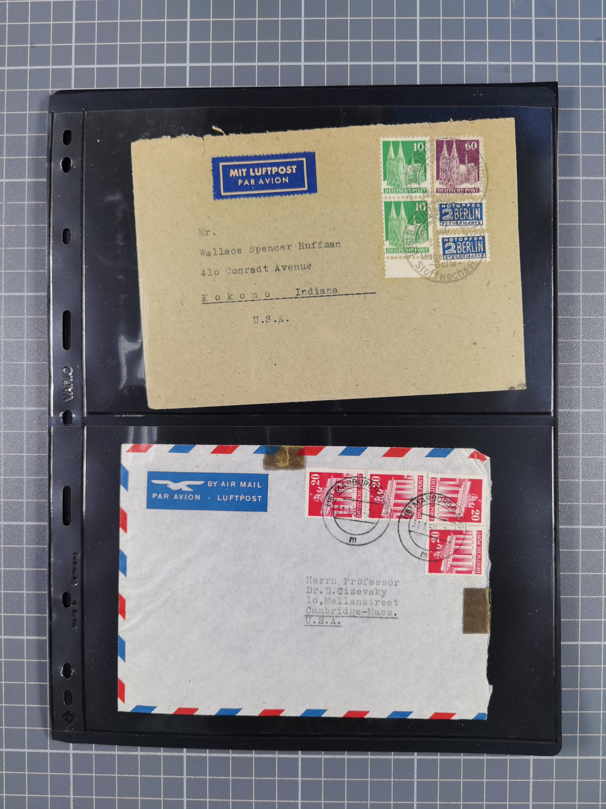 1948/49, ca. 80 Briefe,Karten und Ganzsachen mit Bauten-Frankaturen, dabei oft Auslandspost mit vielen Luftpost-Frankaturen in die USA mit u.a. Mi.-Nr. 97wg im waagerechten Paar auf Luftpost-Brief, senkrechtes Paar Mi.-Nr. 98+90 auf großformatigem Luftpostbrief und Mi.-Nr. 100+93 auf großformatigem Luftpostbrief in die USA. Zum Teil die Briefe mit Randfehlern, vieles aus dem Bedarf