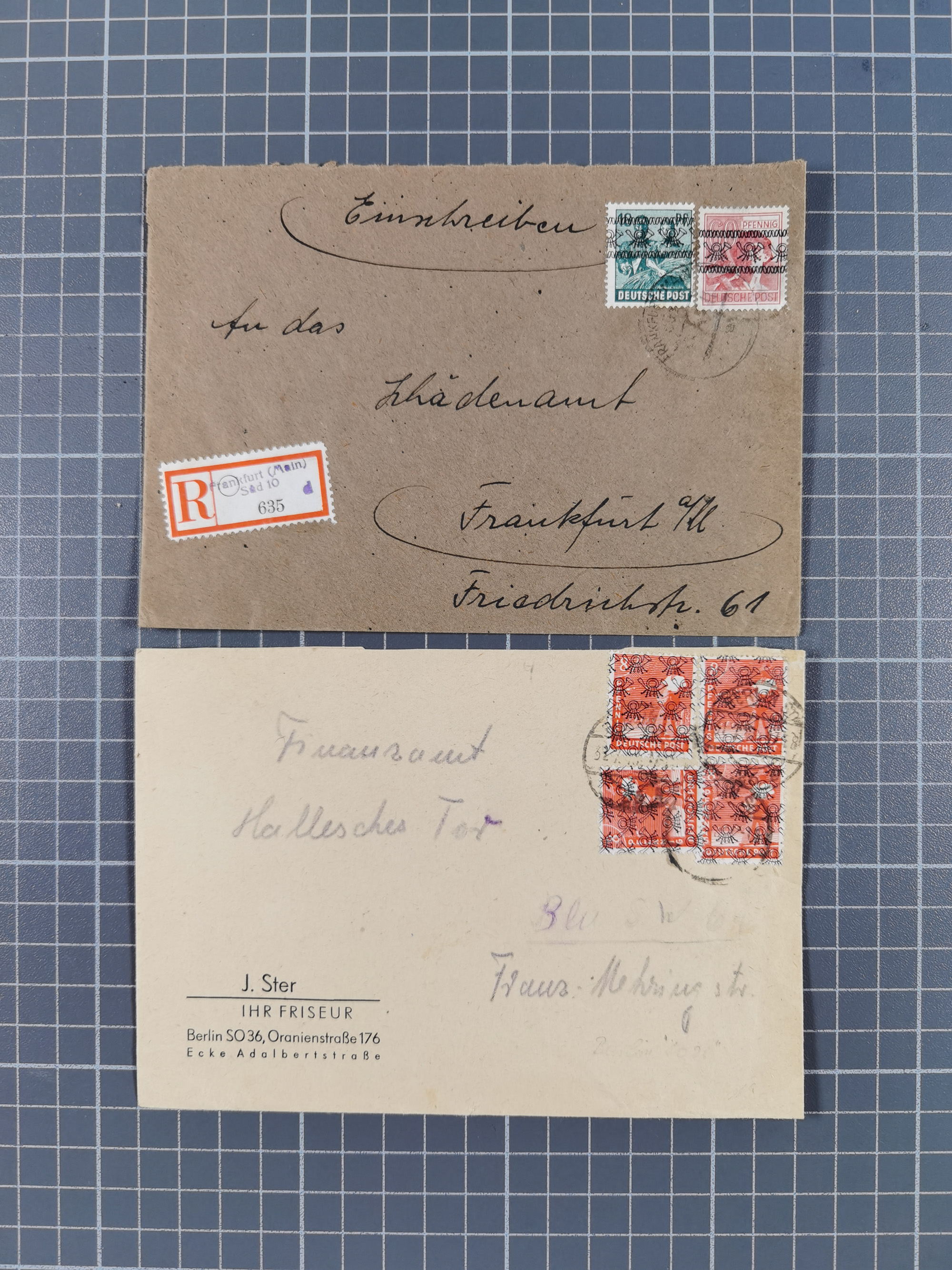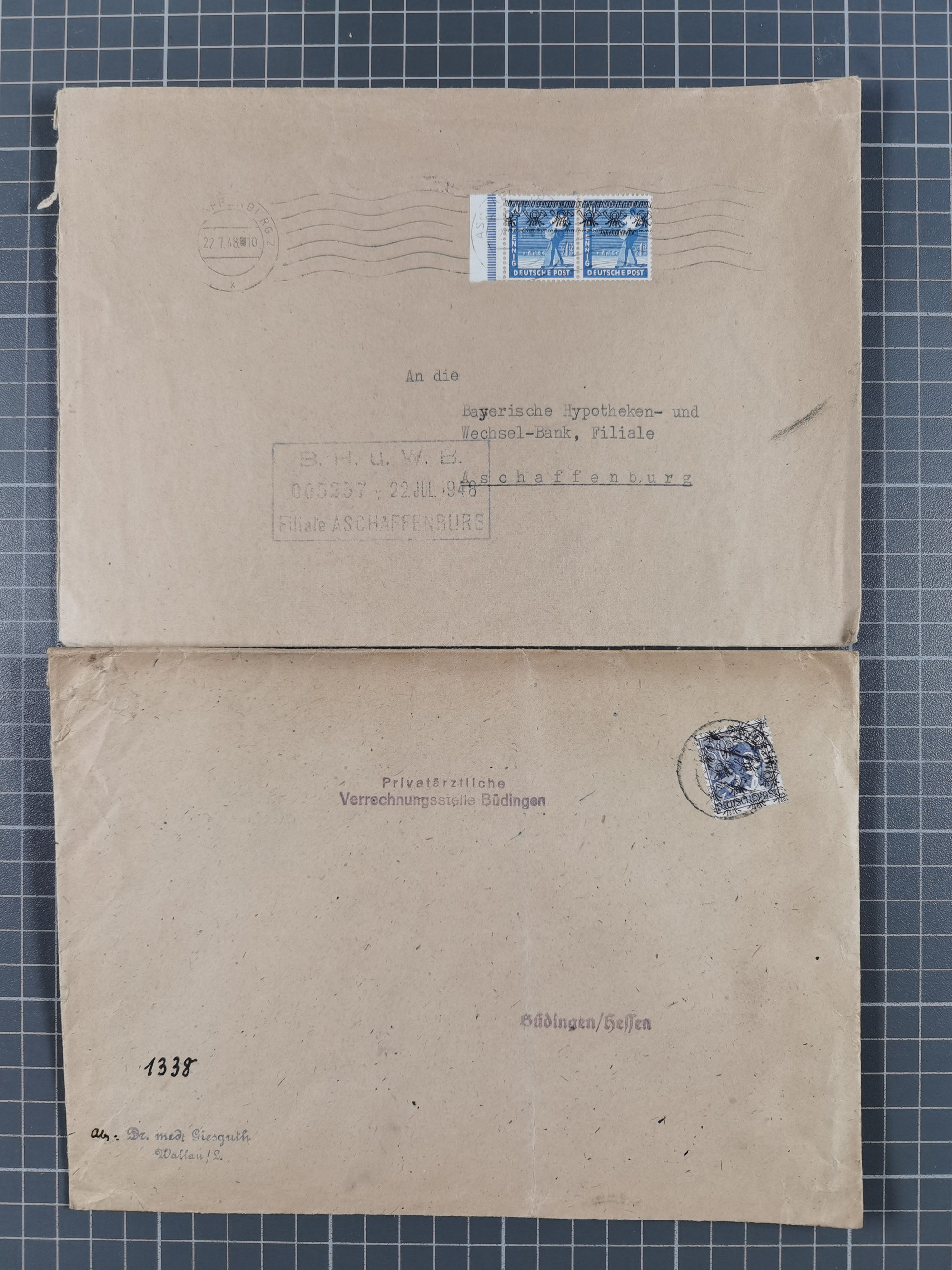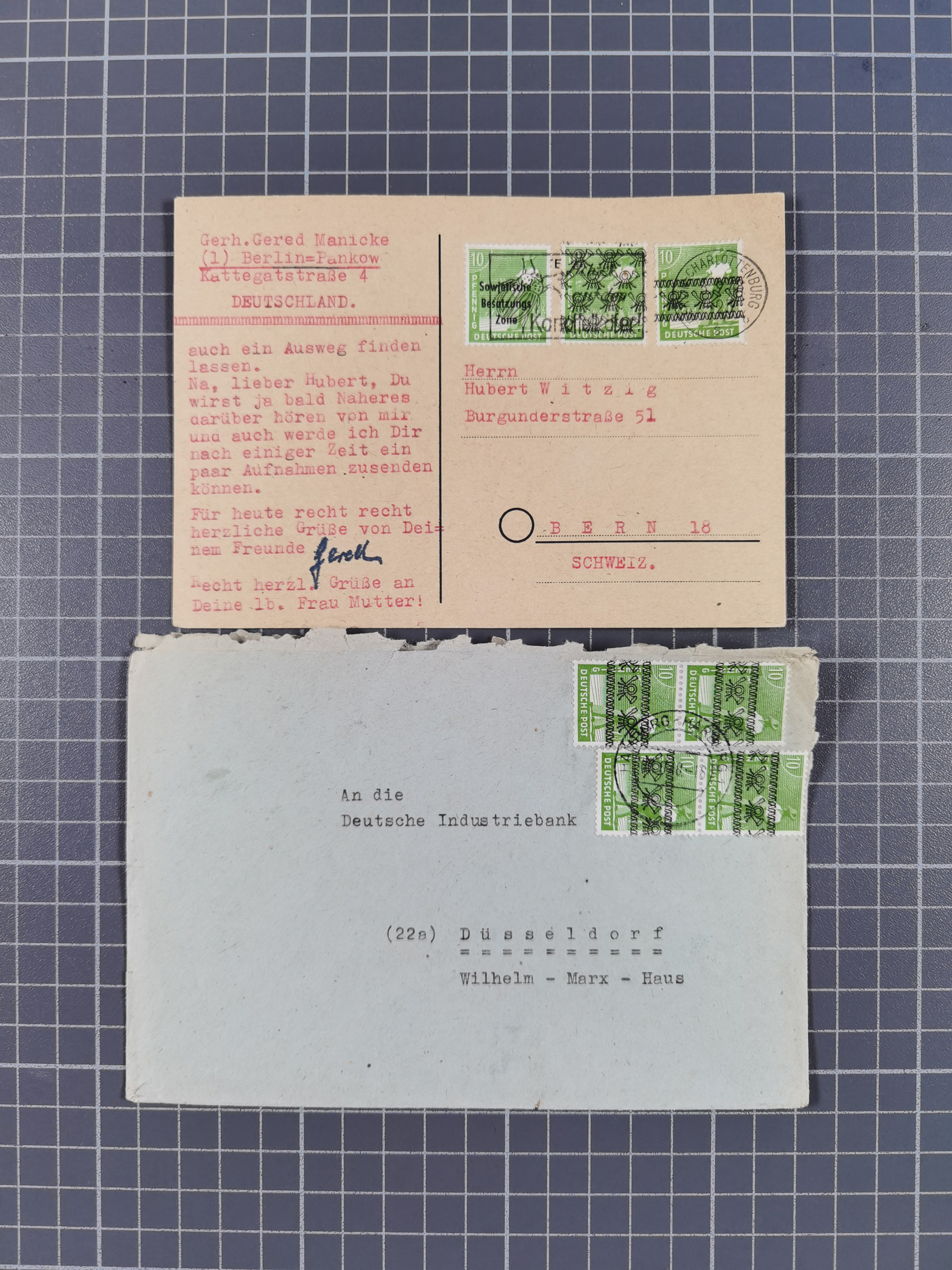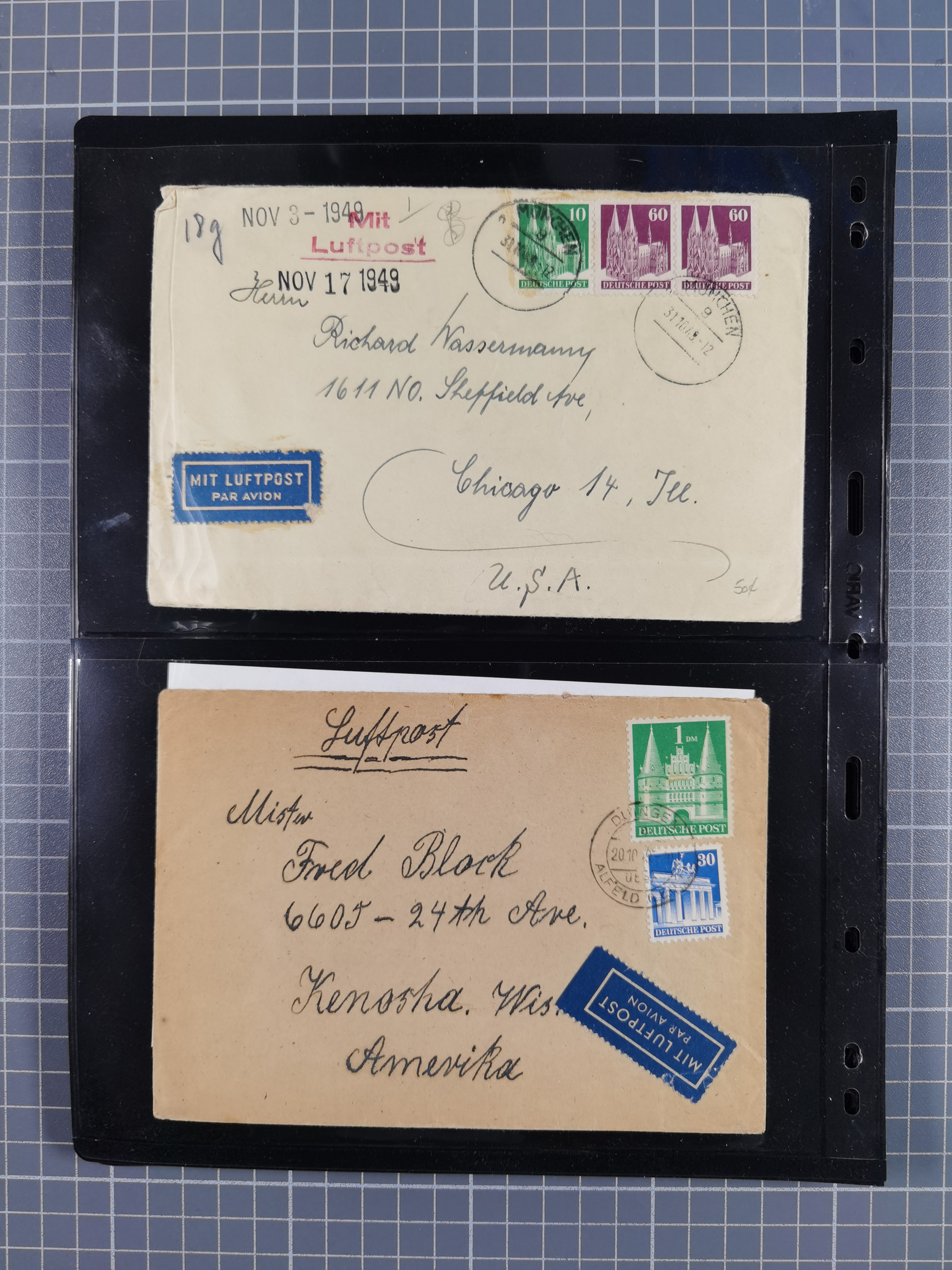 1948/49, ca. 80 Briefe,Karten und Ganzsachen mit Bauten-Frankaturen, dabei oft Auslandspost mit vielen Luftpost-Frankaturen in die USA mit u.a. Mi.-Nr. 97wg im waagerechten Paar auf Luftpost-Brief, senkrechtes Paar Mi.-Nr. 98+90 auf großformatigem Luftpostbrief und Mi.-Nr. 100+93 auf großformatigem Luftpostbrief in die USA. Zum Teil die Briefe mit Randfehlern, vieles aus dem Bedarf
