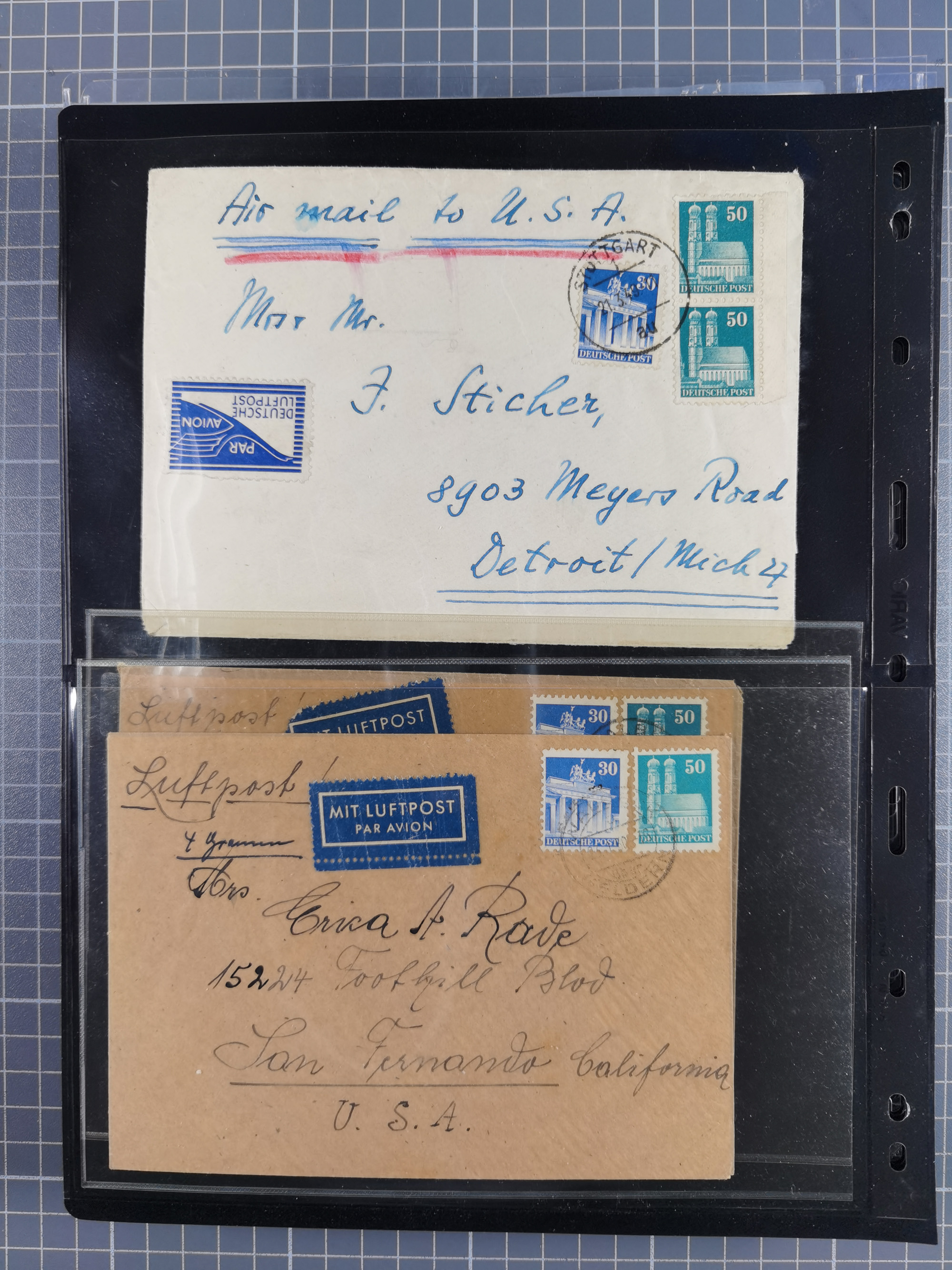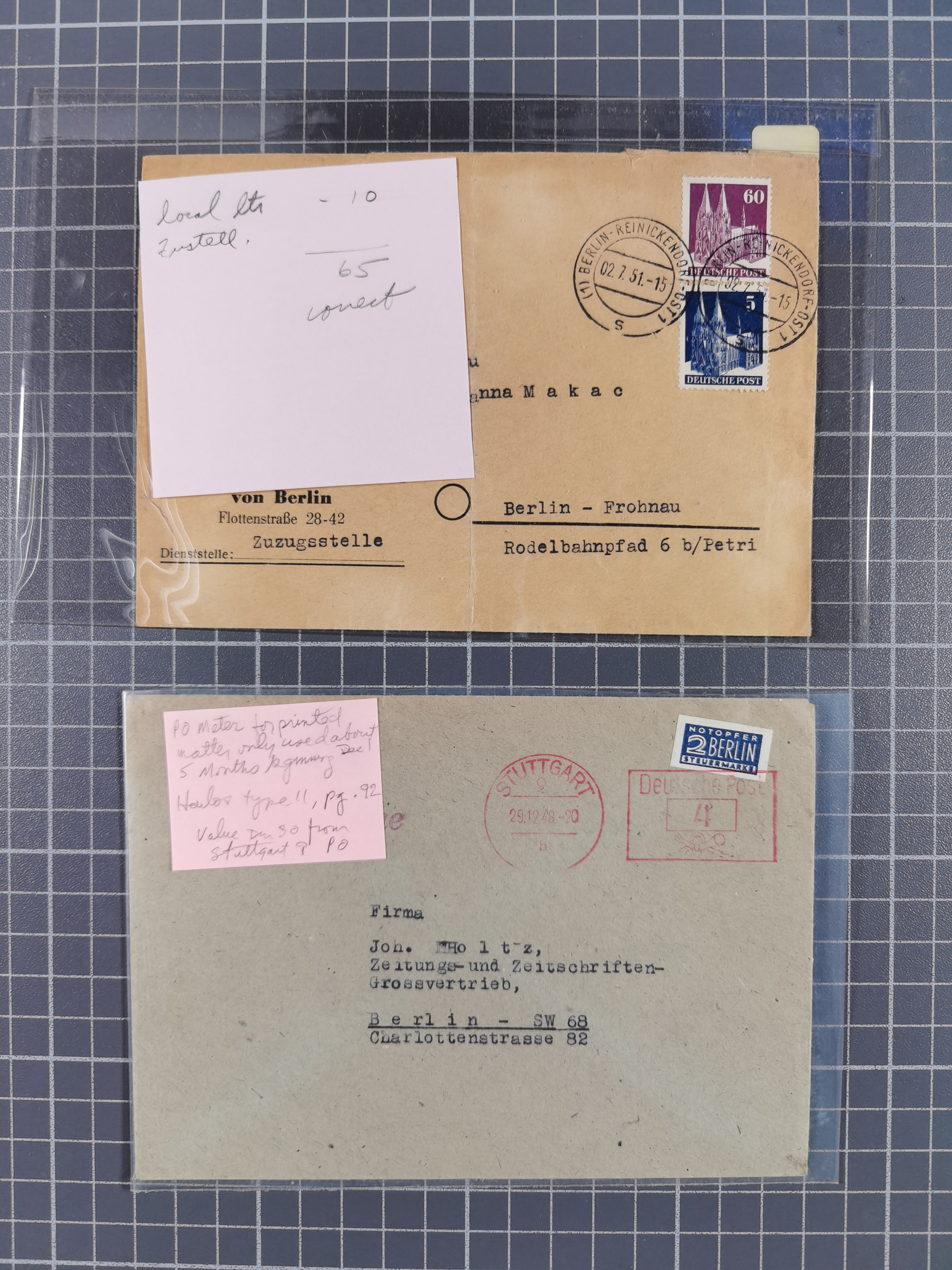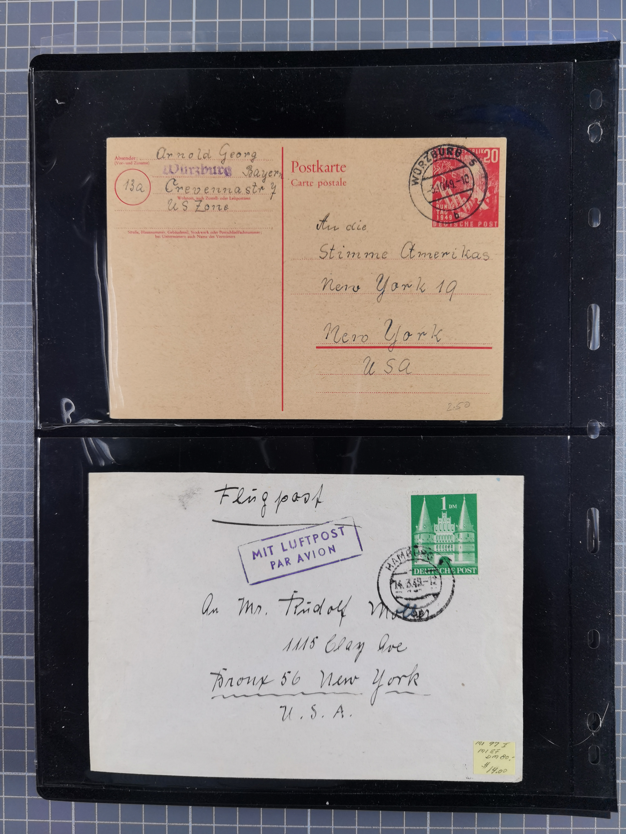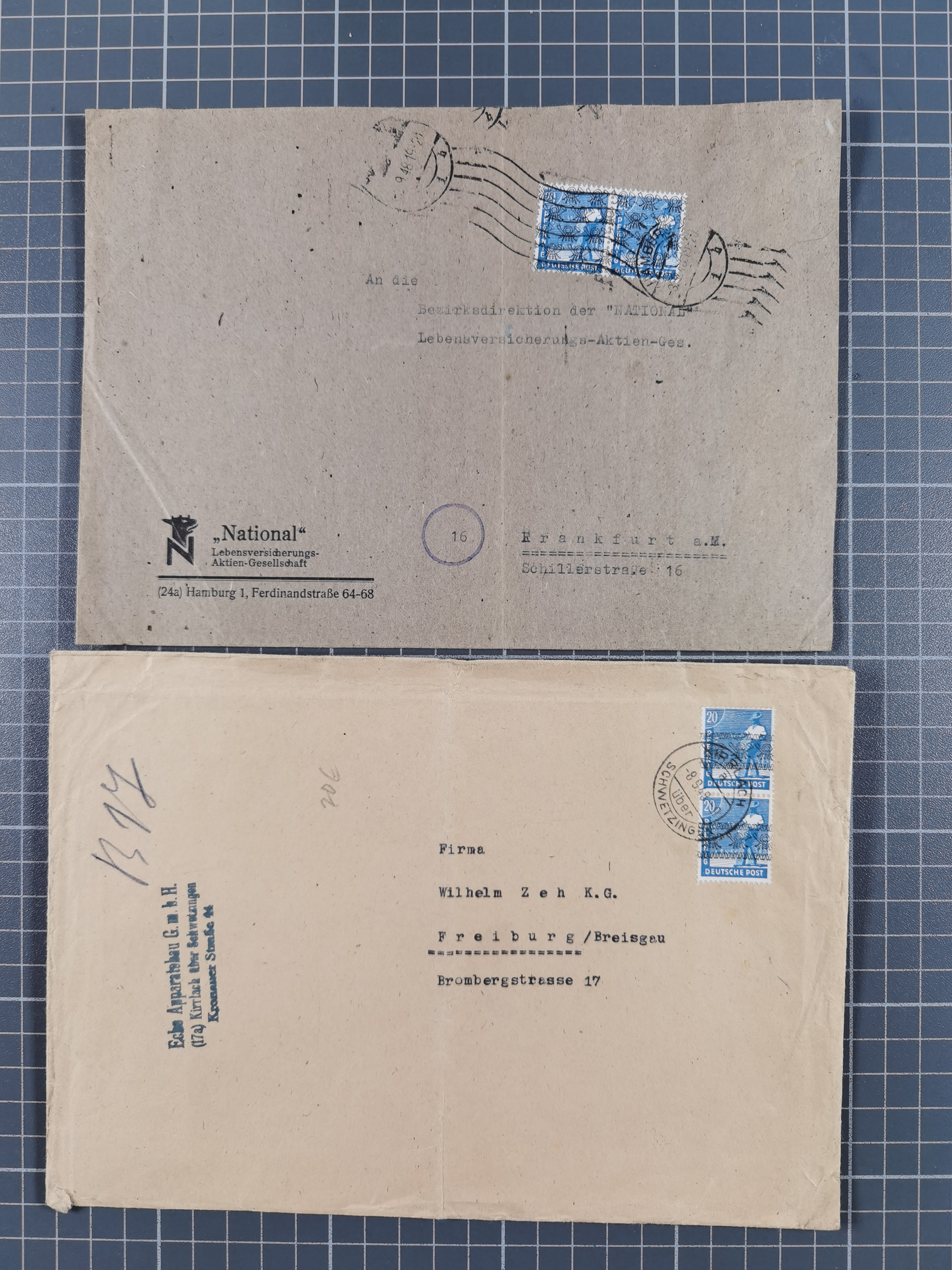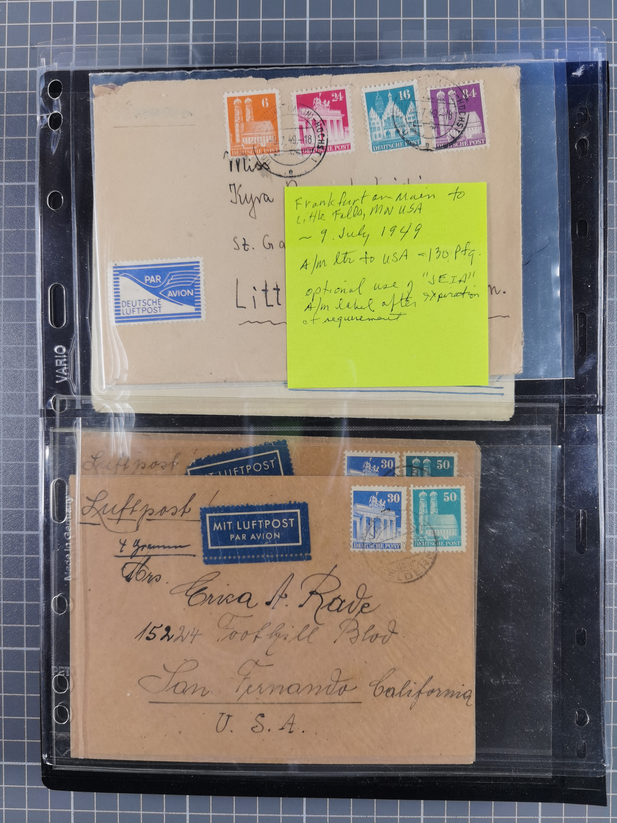 1948/49, ca. 80 Briefe,Karten und Ganzsachen mit Bauten-Frankaturen, dabei oft Auslandspost mit vielen Luftpost-Frankaturen in die USA mit u.a. Mi.-Nr. 97wg im waagerechten Paar auf Luftpost-Brief, senkrechtes Paar Mi.-Nr. 98+90 auf großformatigem Luftpostbrief und Mi.-Nr. 100+93 auf großformatigem Luftpostbrief in die USA. Zum Teil die Briefe mit Randfehlern, vieles aus dem Bedarf