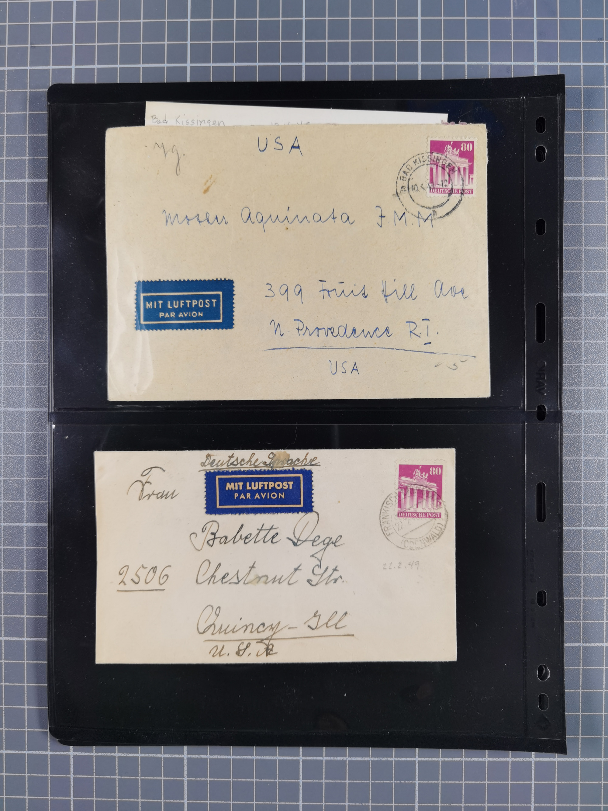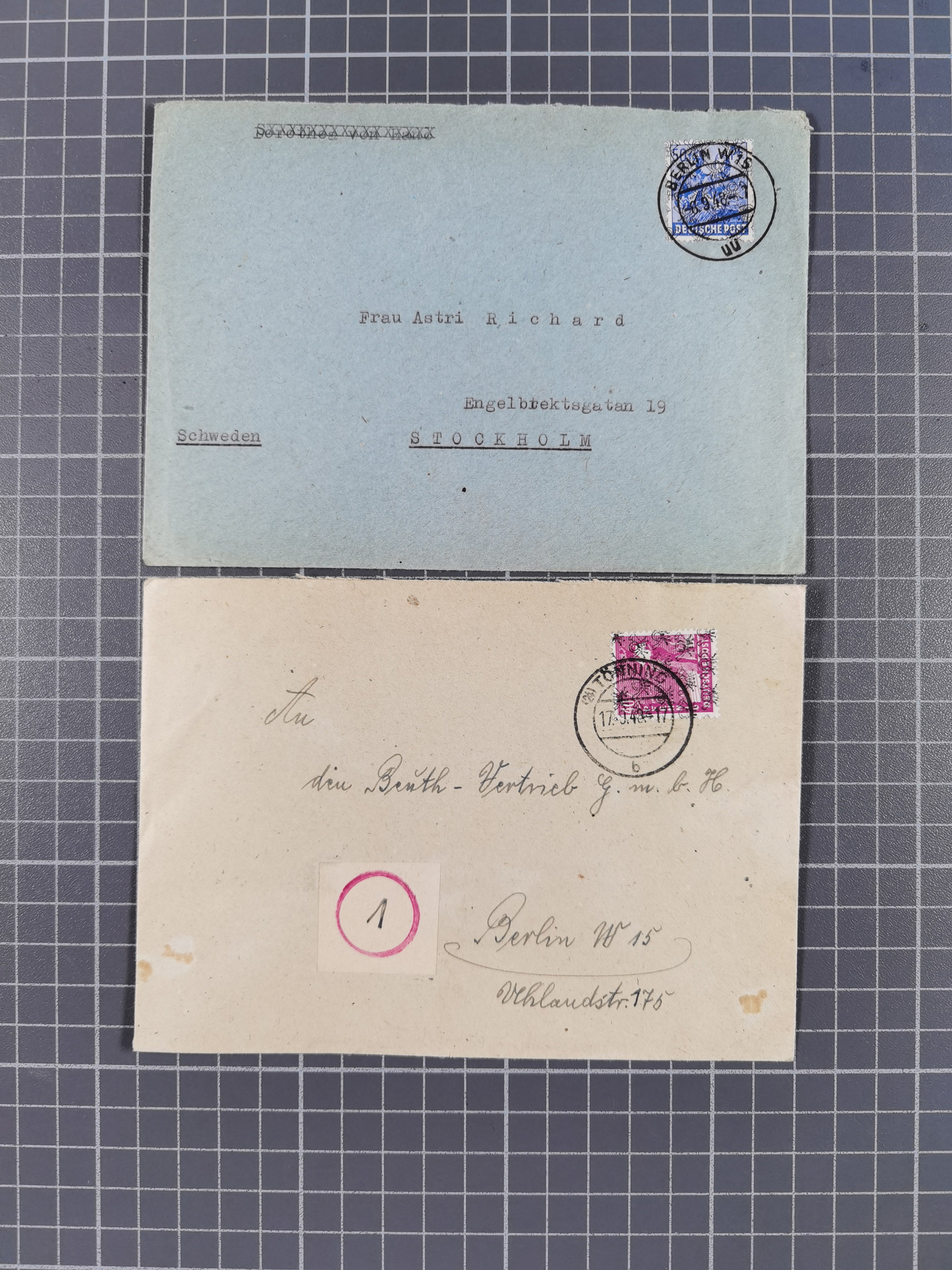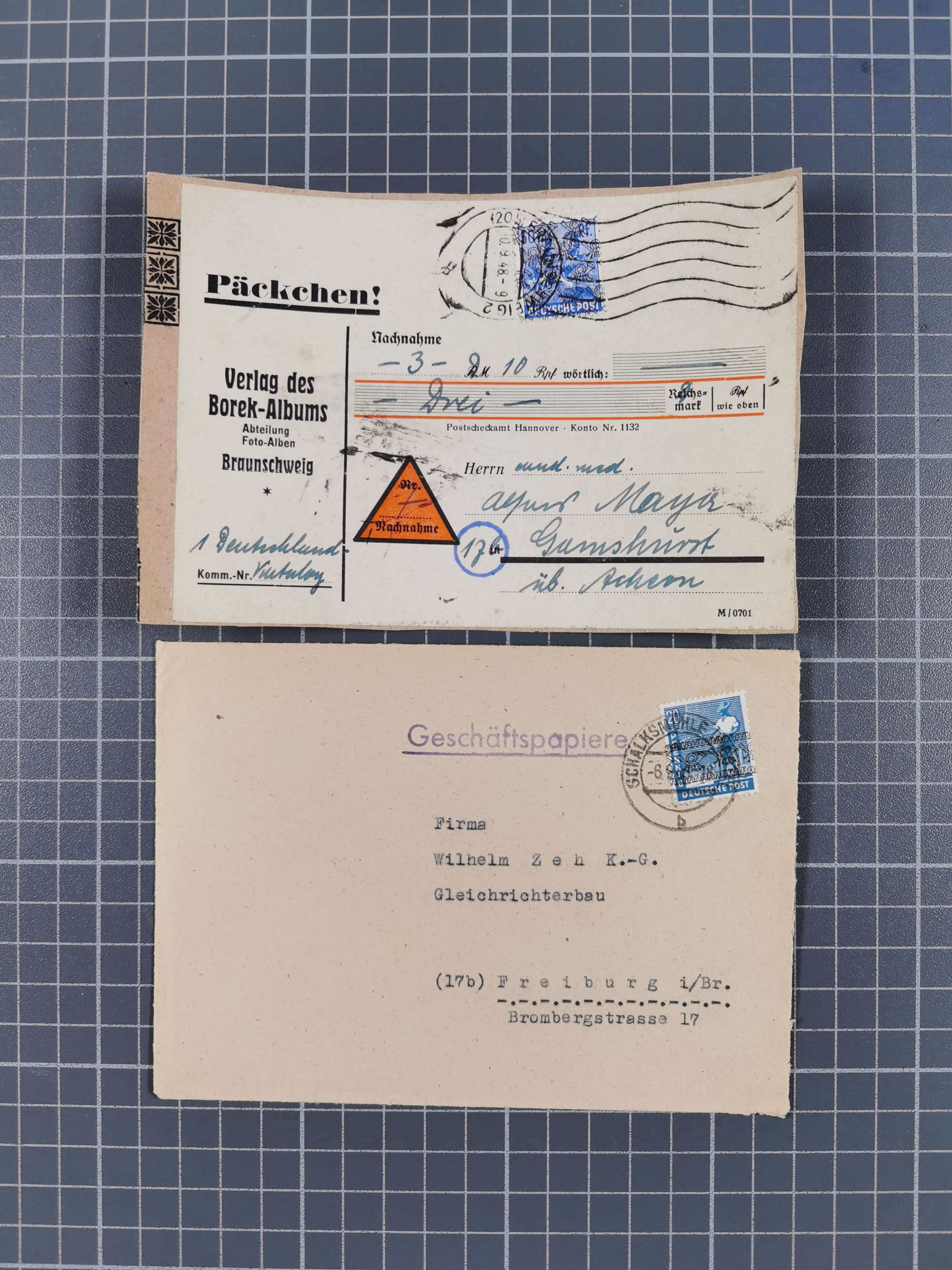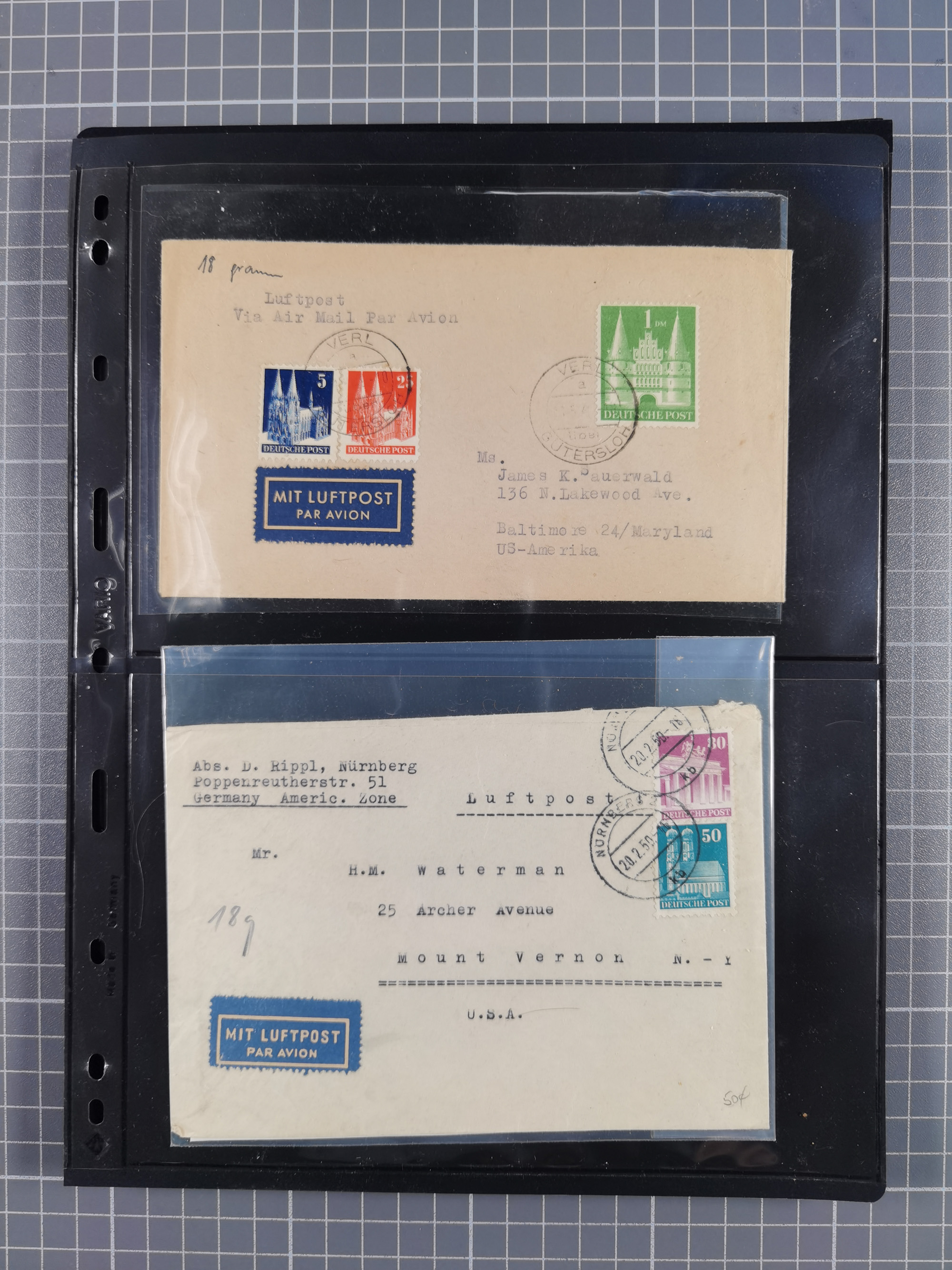 1948/49, ca. 80 Briefe,Karten und Ganzsachen mit Bauten-Frankaturen, dabei oft Auslandspost mit vielen Luftpost-Frankaturen in die USA mit u.a. Mi.-Nr. 97wg im waagerechten Paar auf Luftpost-Brief, senkrechtes Paar Mi.-Nr. 98+90 auf großformatigem Luftpostbrief und Mi.-Nr. 100+93 auf großformatigem Luftpostbrief in die USA. Zum Teil die Briefe mit Randfehlern, vieles aus dem Bedarf