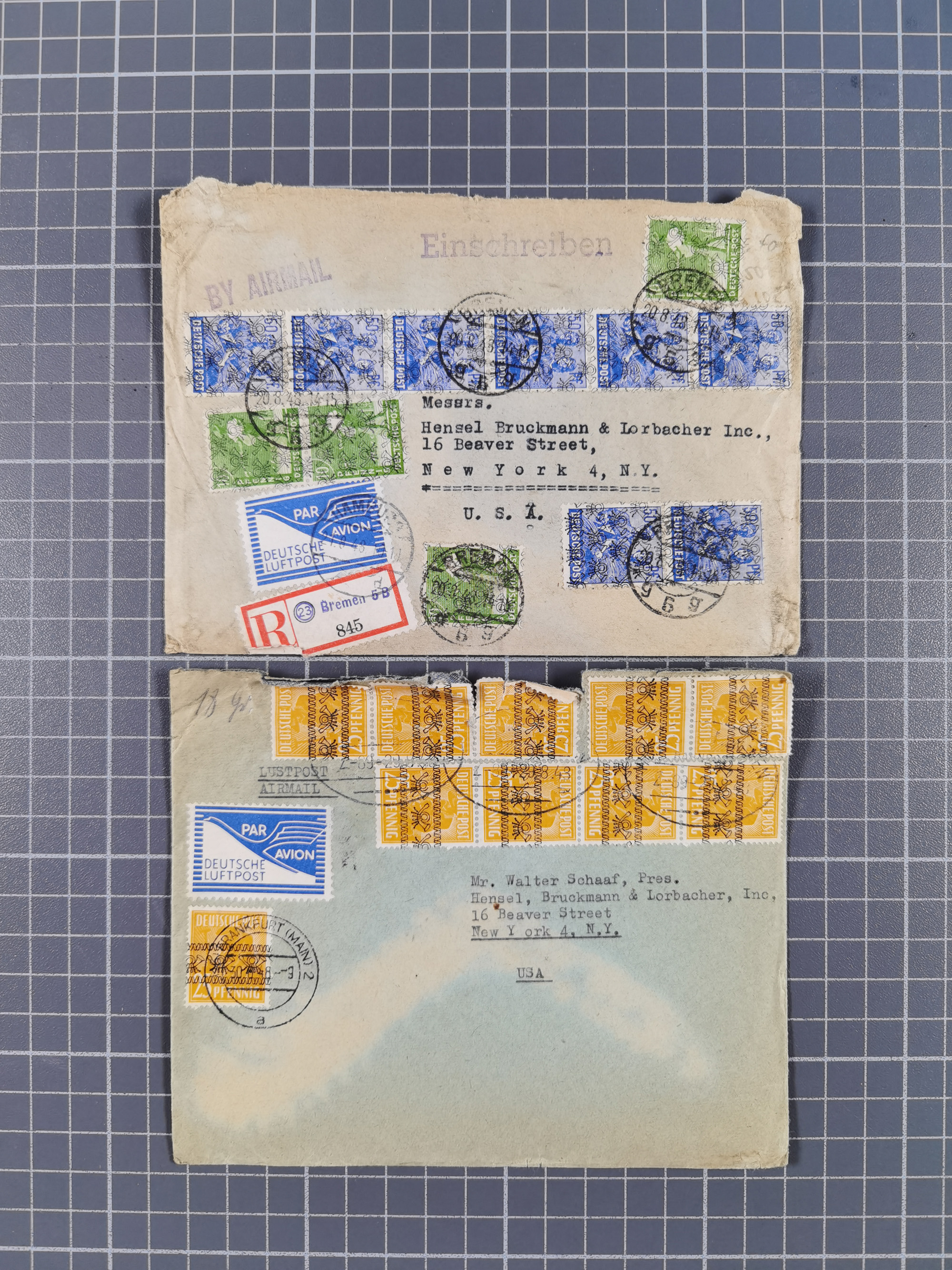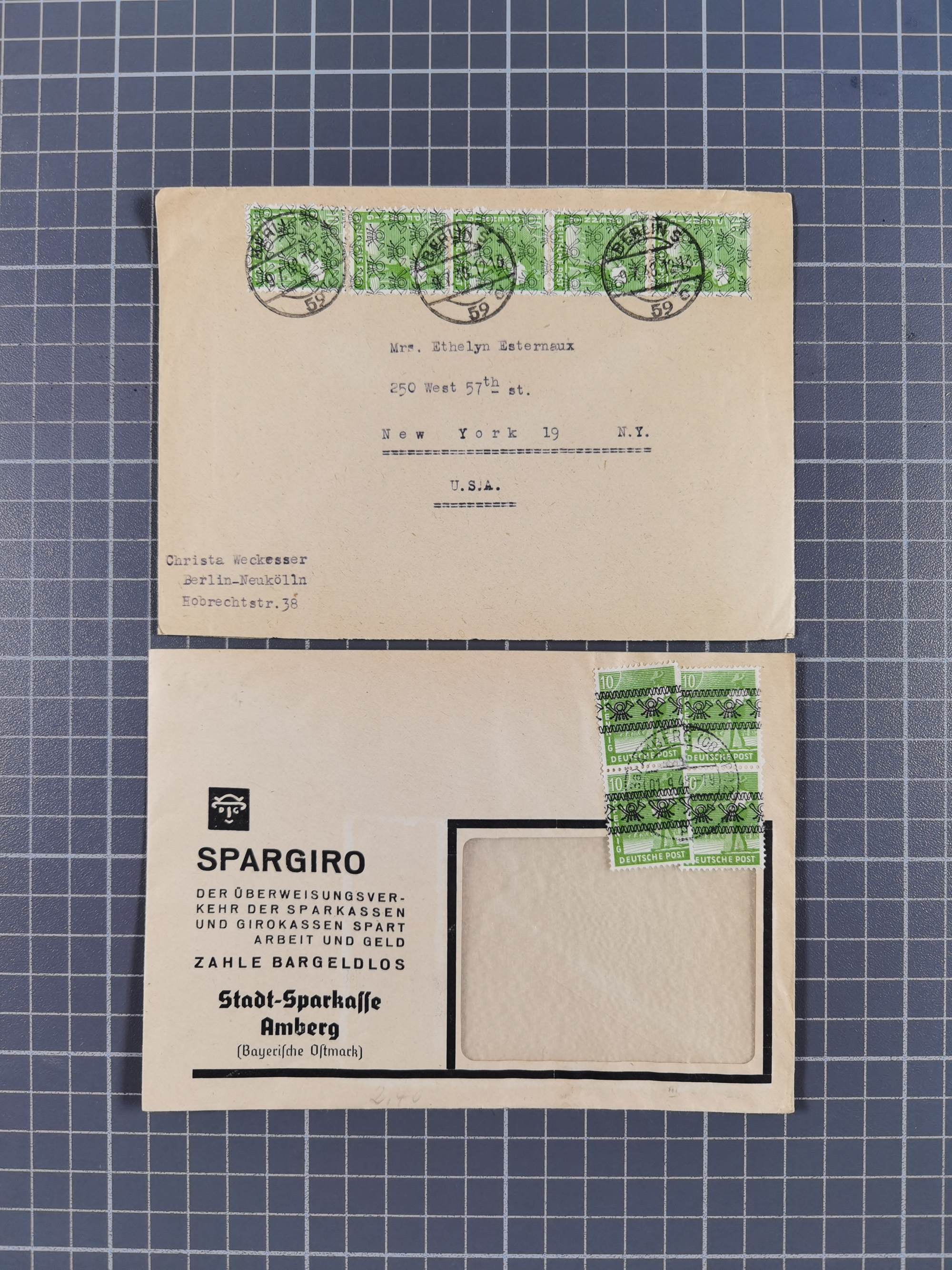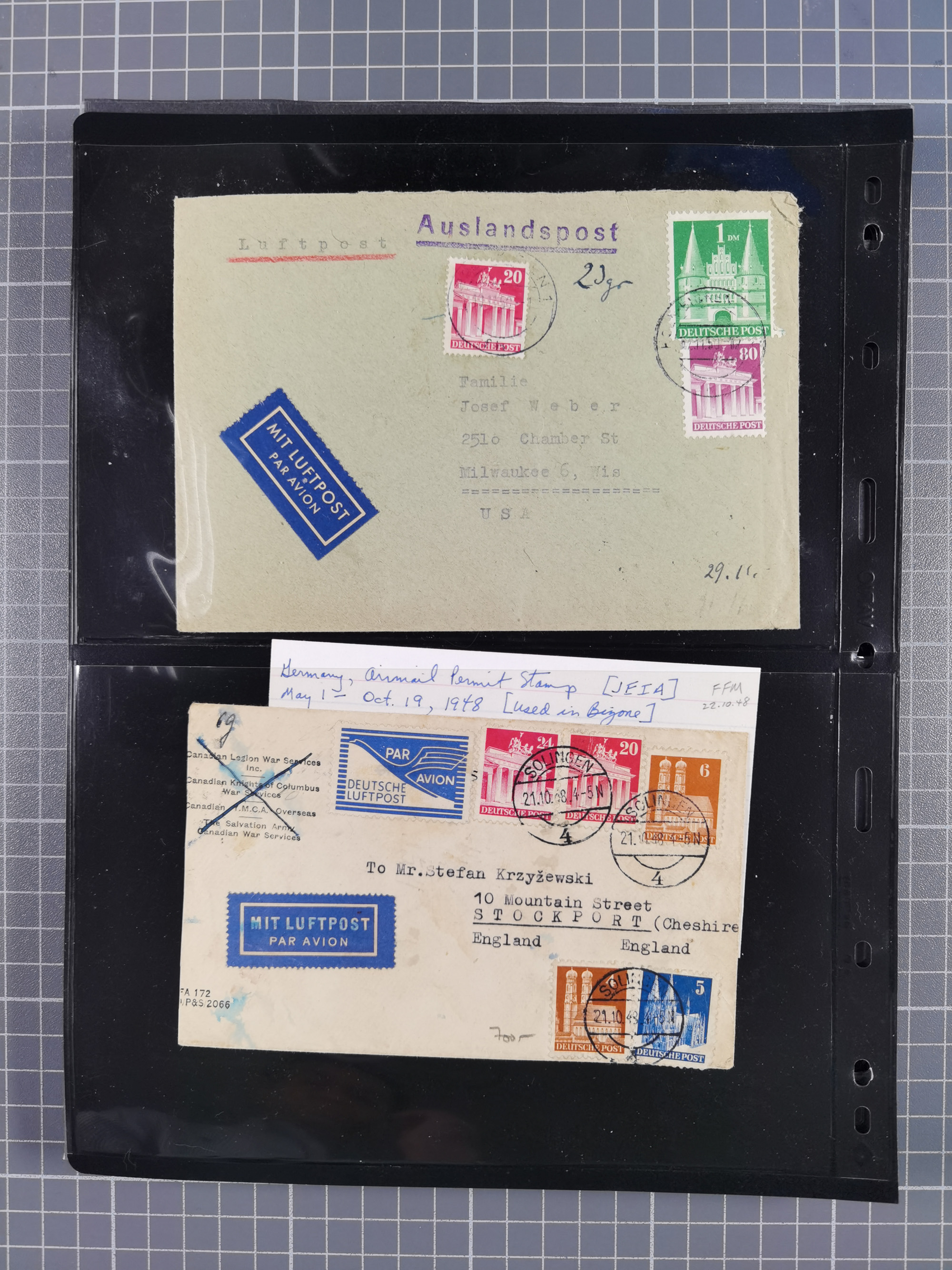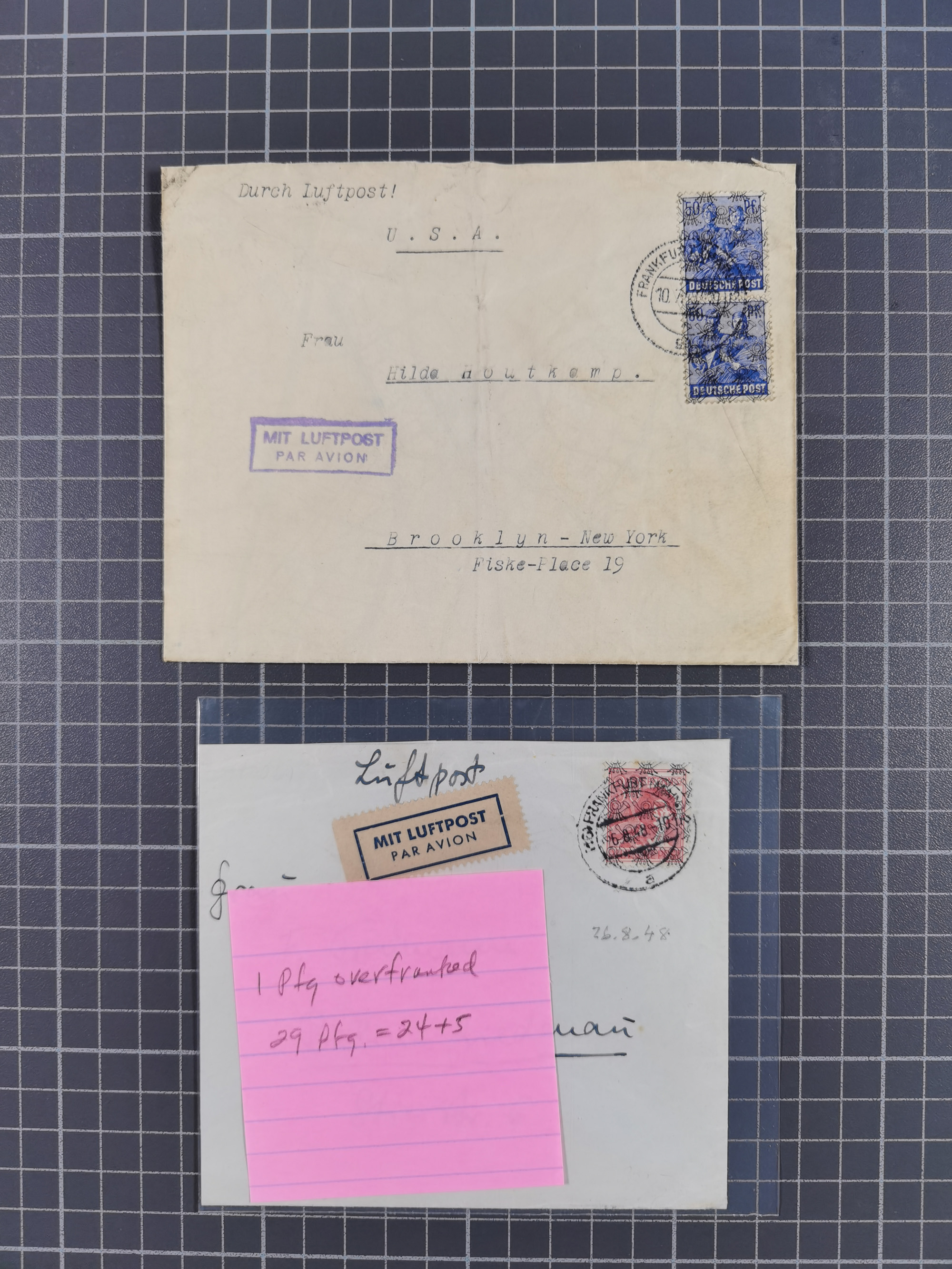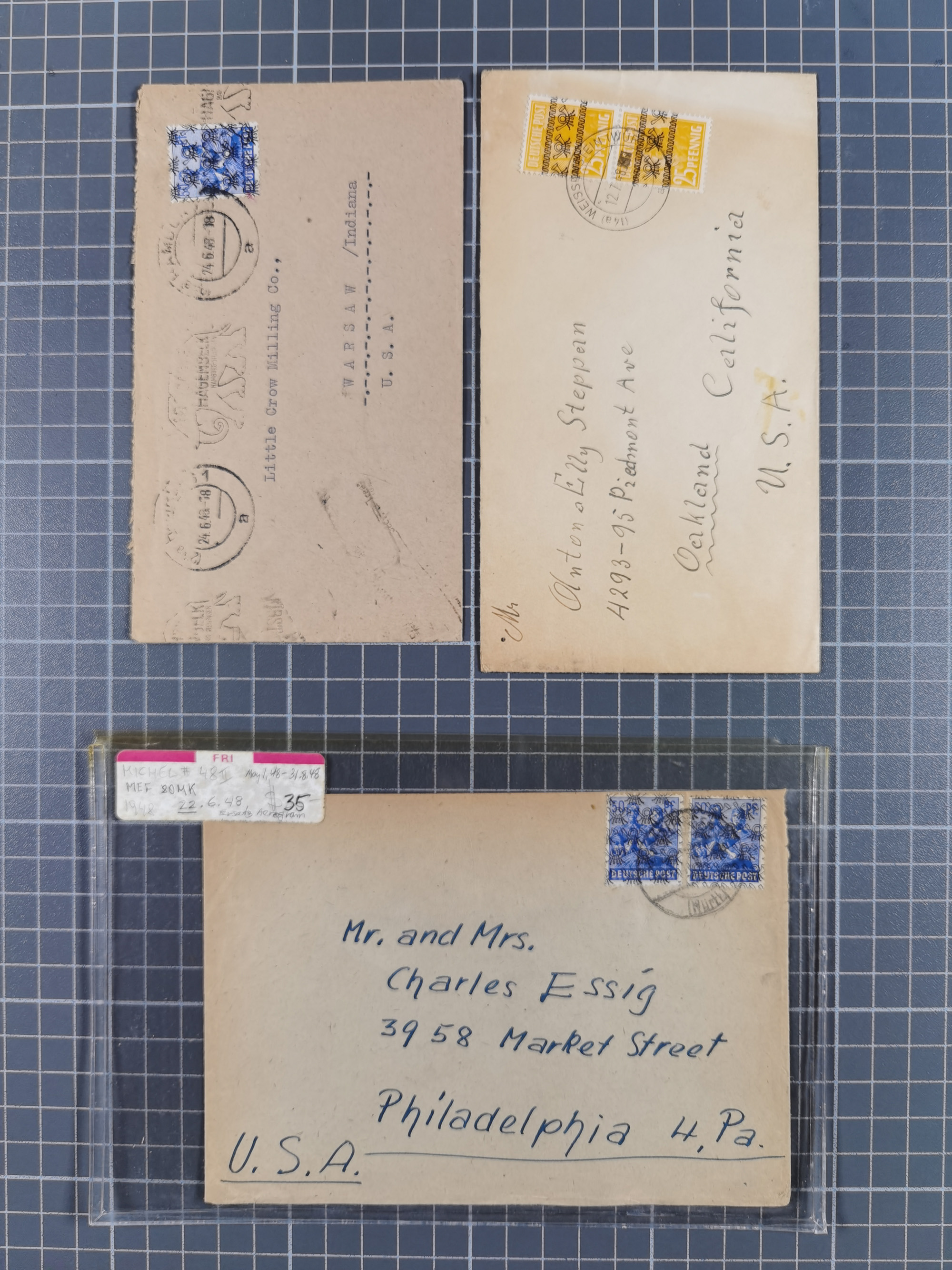 1948, fast 30 Briefe und Karten mit Band/Netz-Frankaturen, dabei meist Briefe in die USA mit u.a. sieben Luftpost-Ersatz-Aerogrammen und ein JEIA-Brief