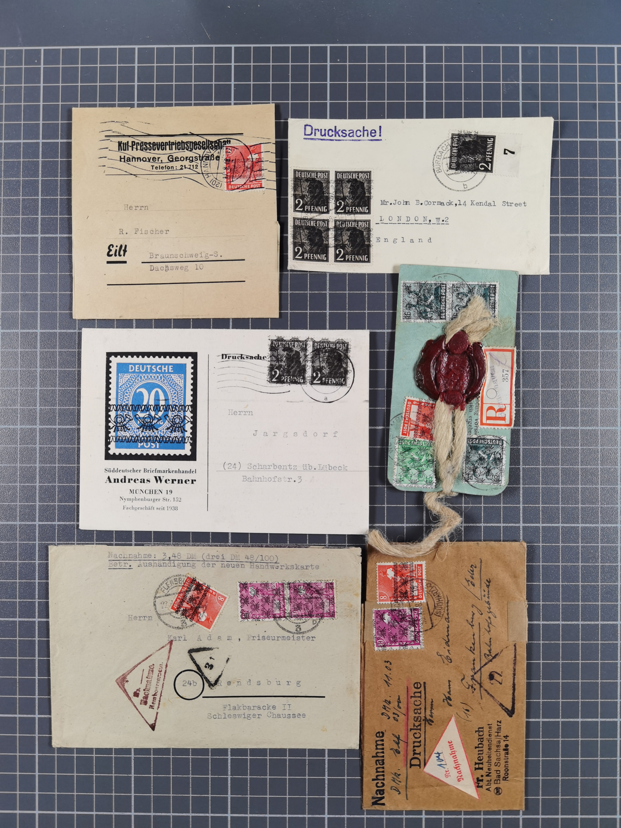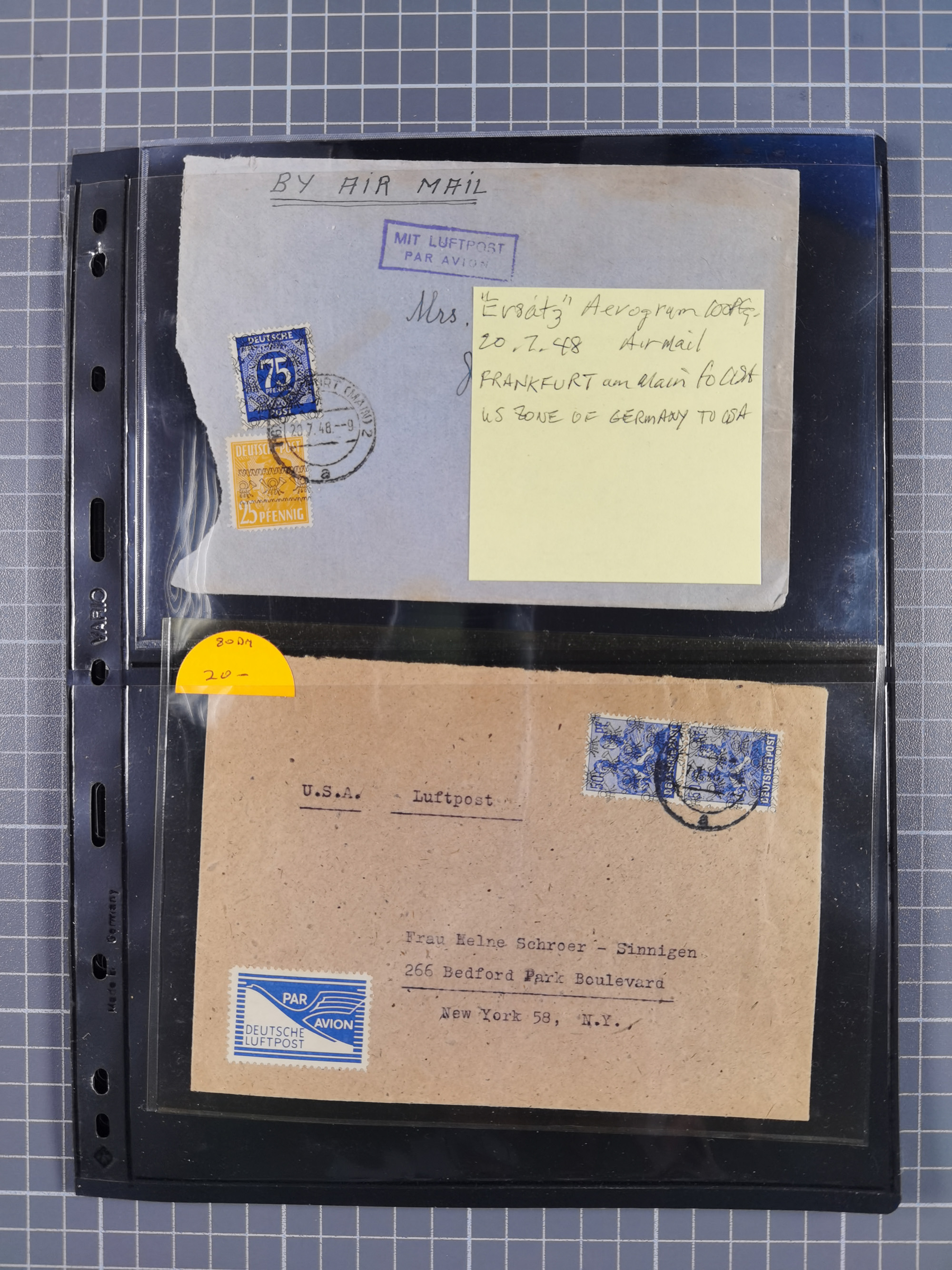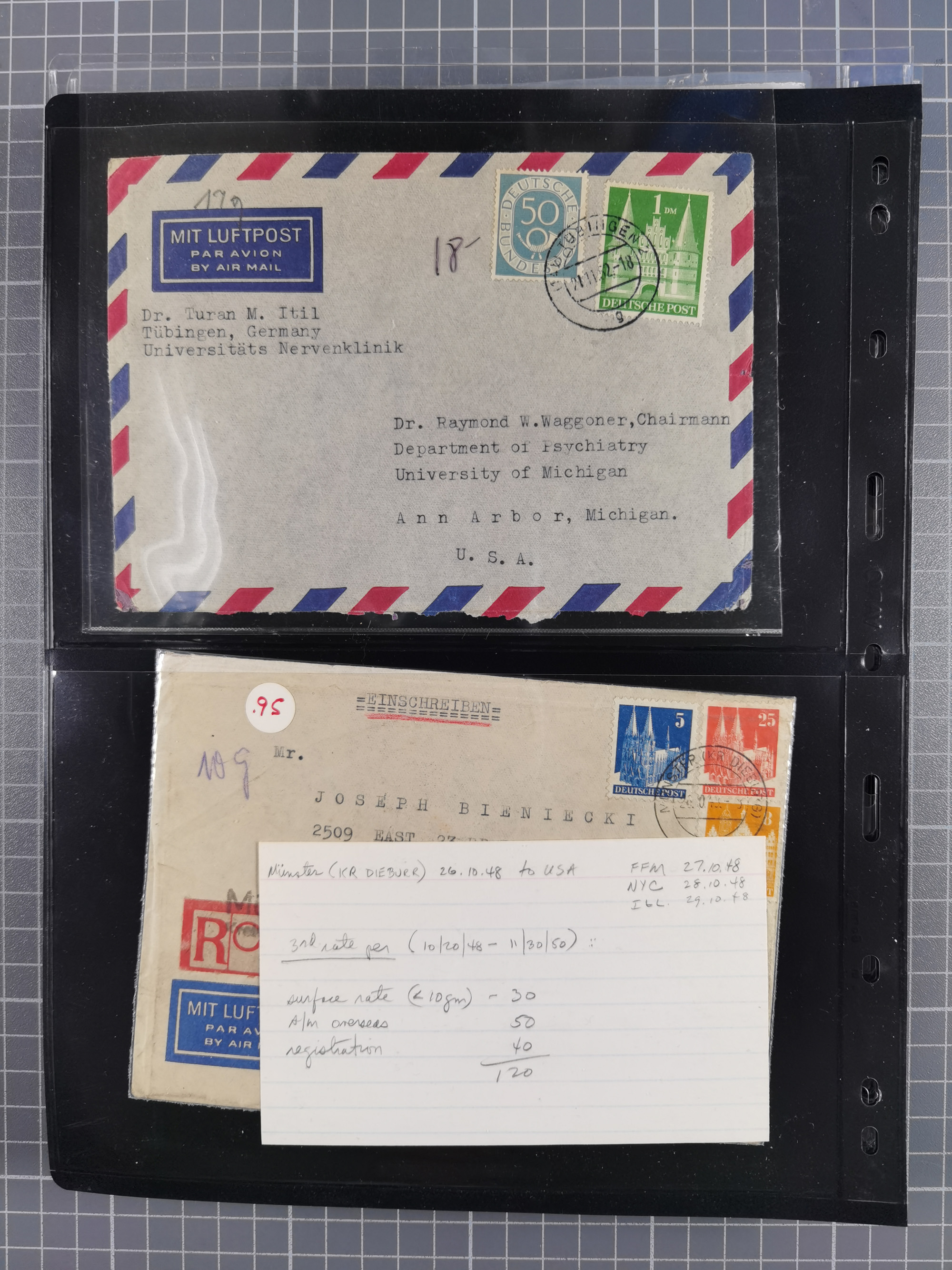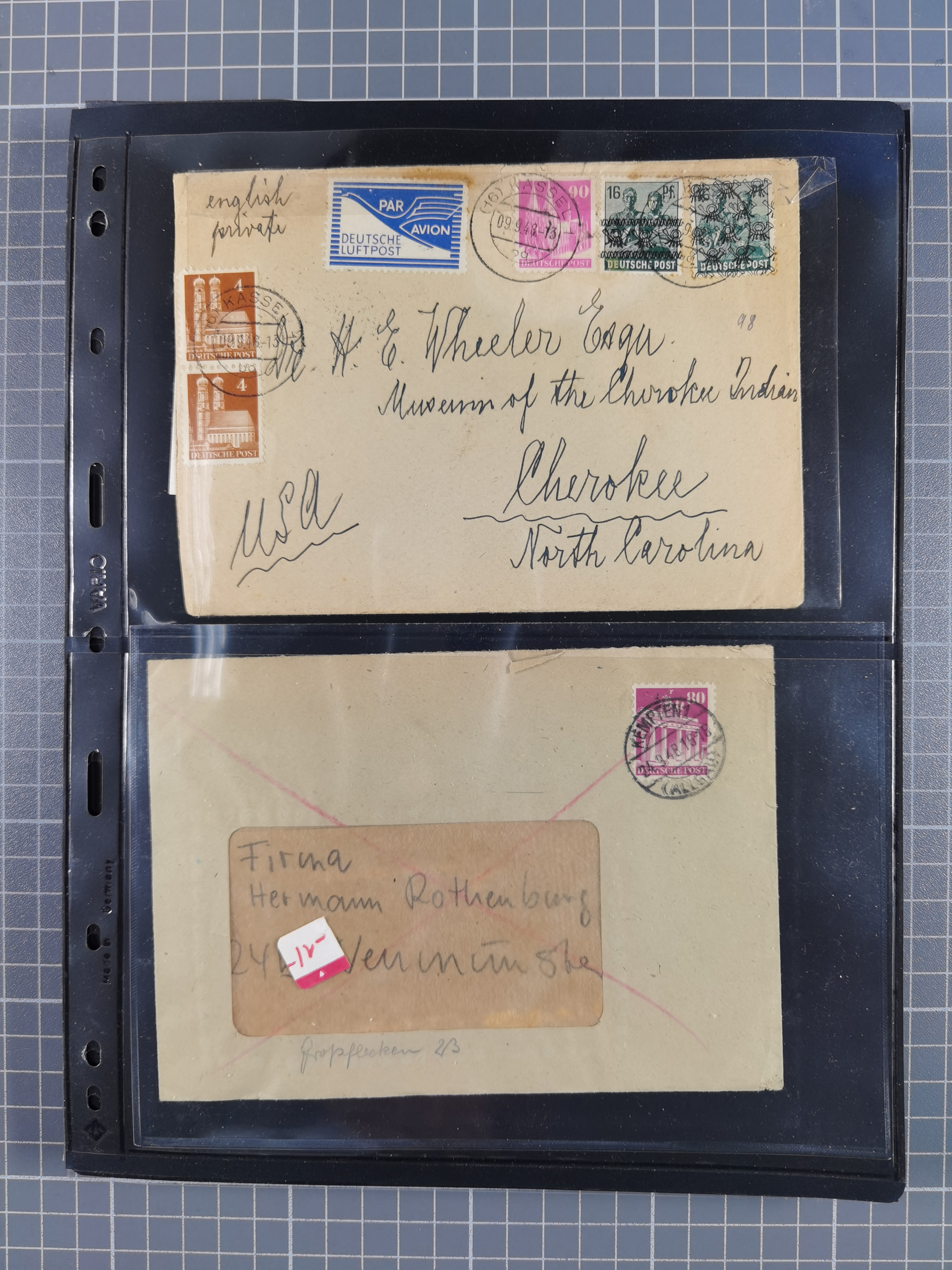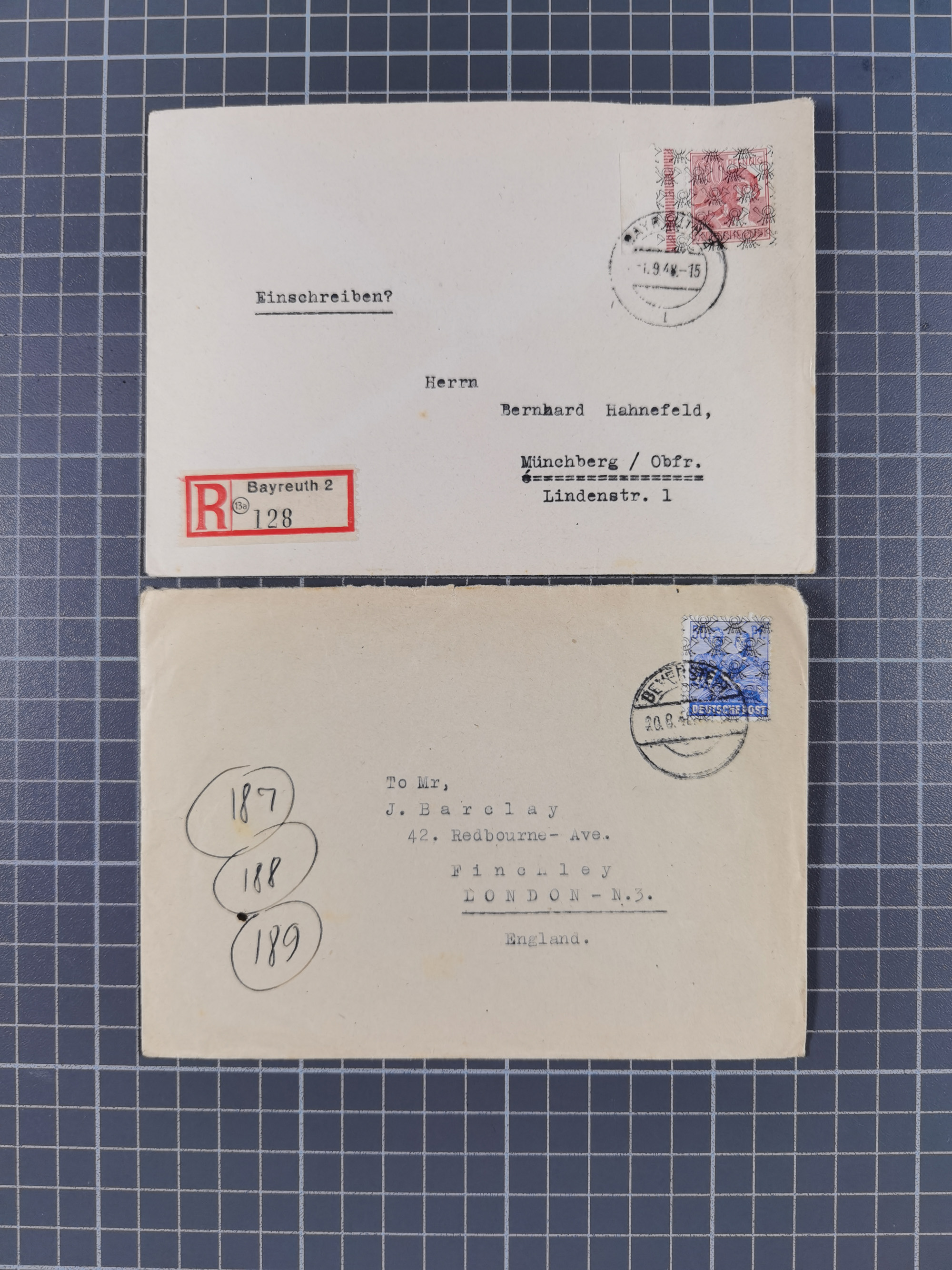 1948, fast 30 Briefe und Karten mit Band/Netz-Frankaturen, dabei meist Briefe in die USA mit u.a. sieben Luftpost-Ersatz-Aerogrammen und ein JEIA-Brief