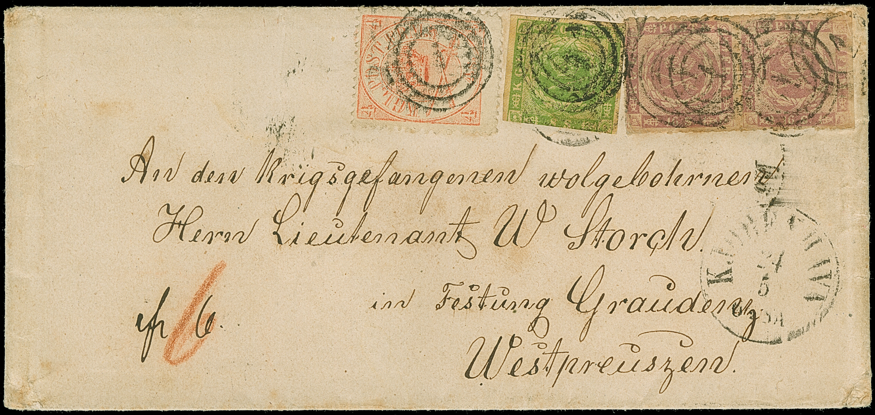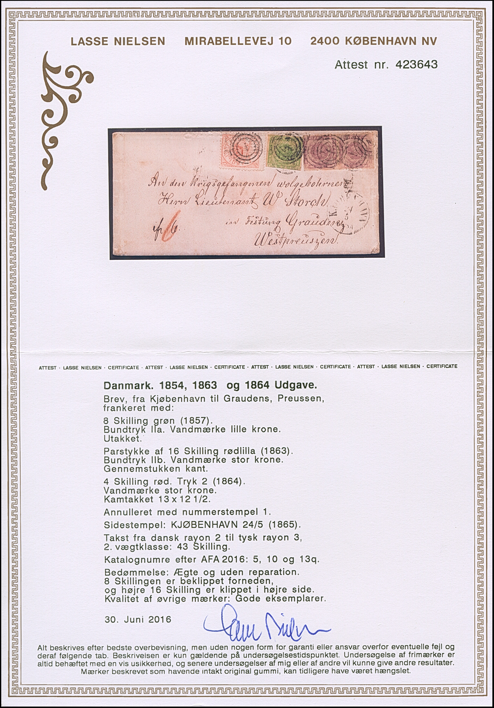 1863, 16 sk. lilac in horizontal pair, with 1857, 8 sk. green and 1864, oval issue 4 sk. red, tied by no. "1" with adjacent c.d.s. "KJOBENHAVN 24 5 1864" to 2nd rate lettersheet to a prisoner of war in the fortress of Graudenz in Western Prussia. The right stamp of the pair with scissors cut at right, some minor transportation faults, still very fine and attractive. A very rare franking and interesting document of the Second Schleswig War. Certificate Nielsen (2016)