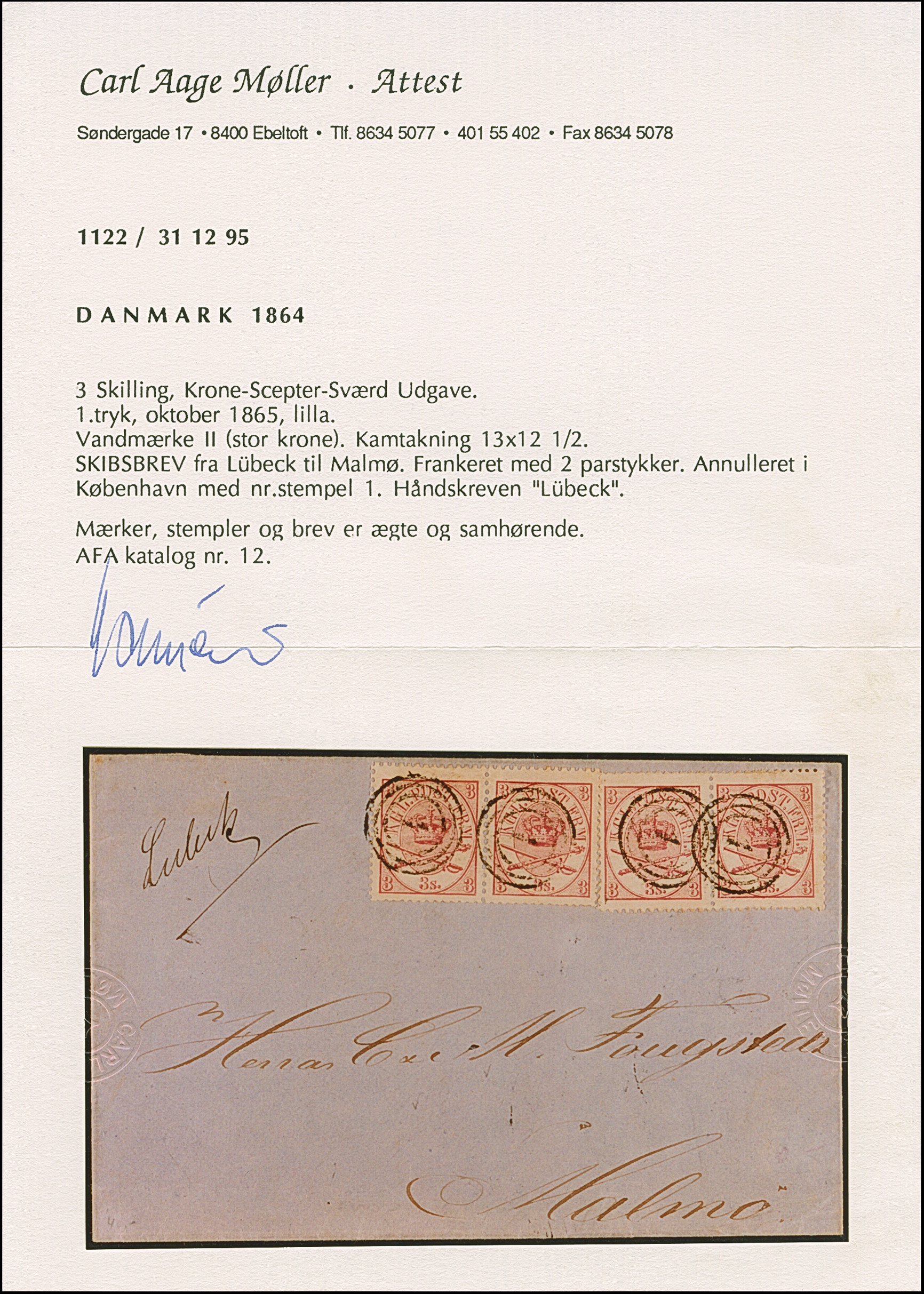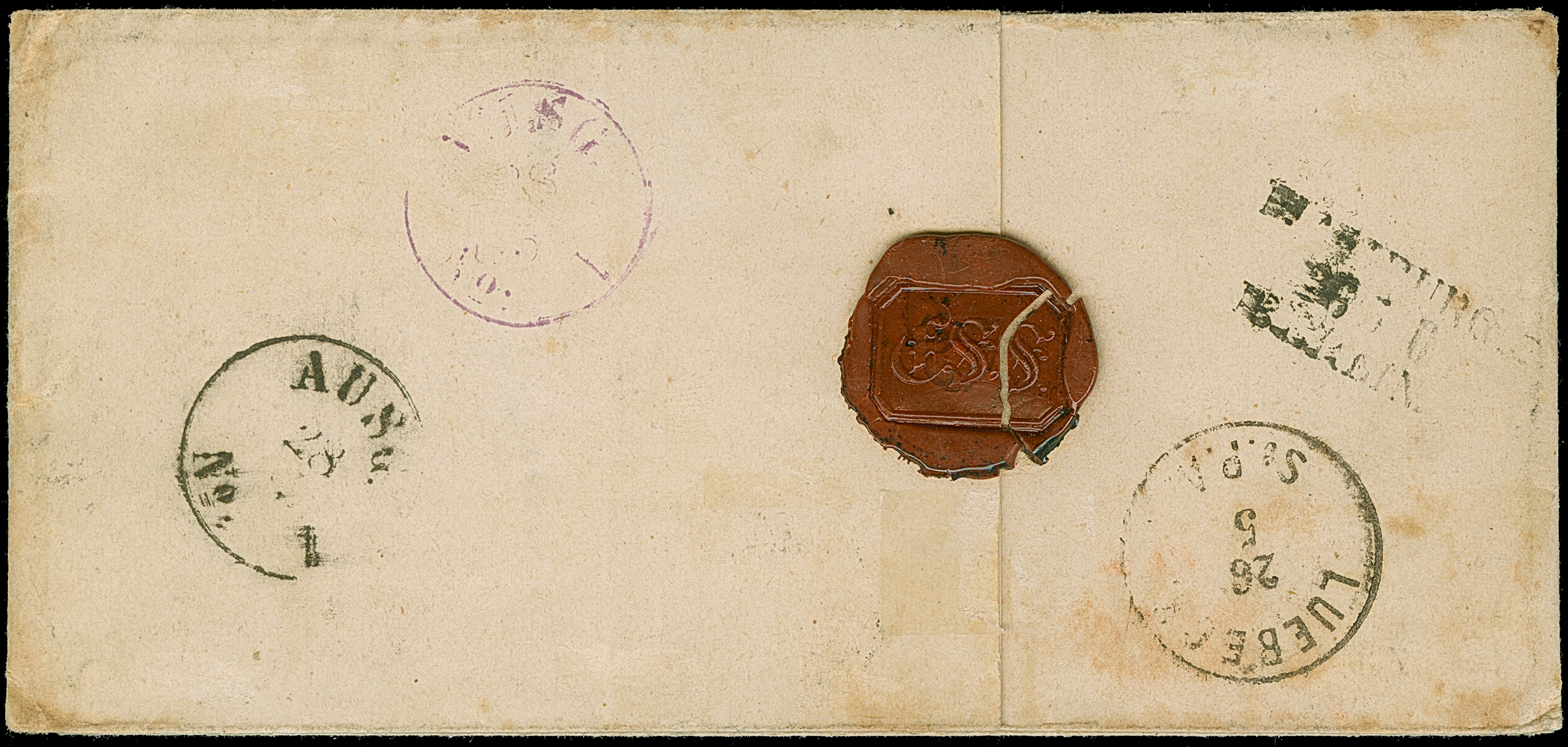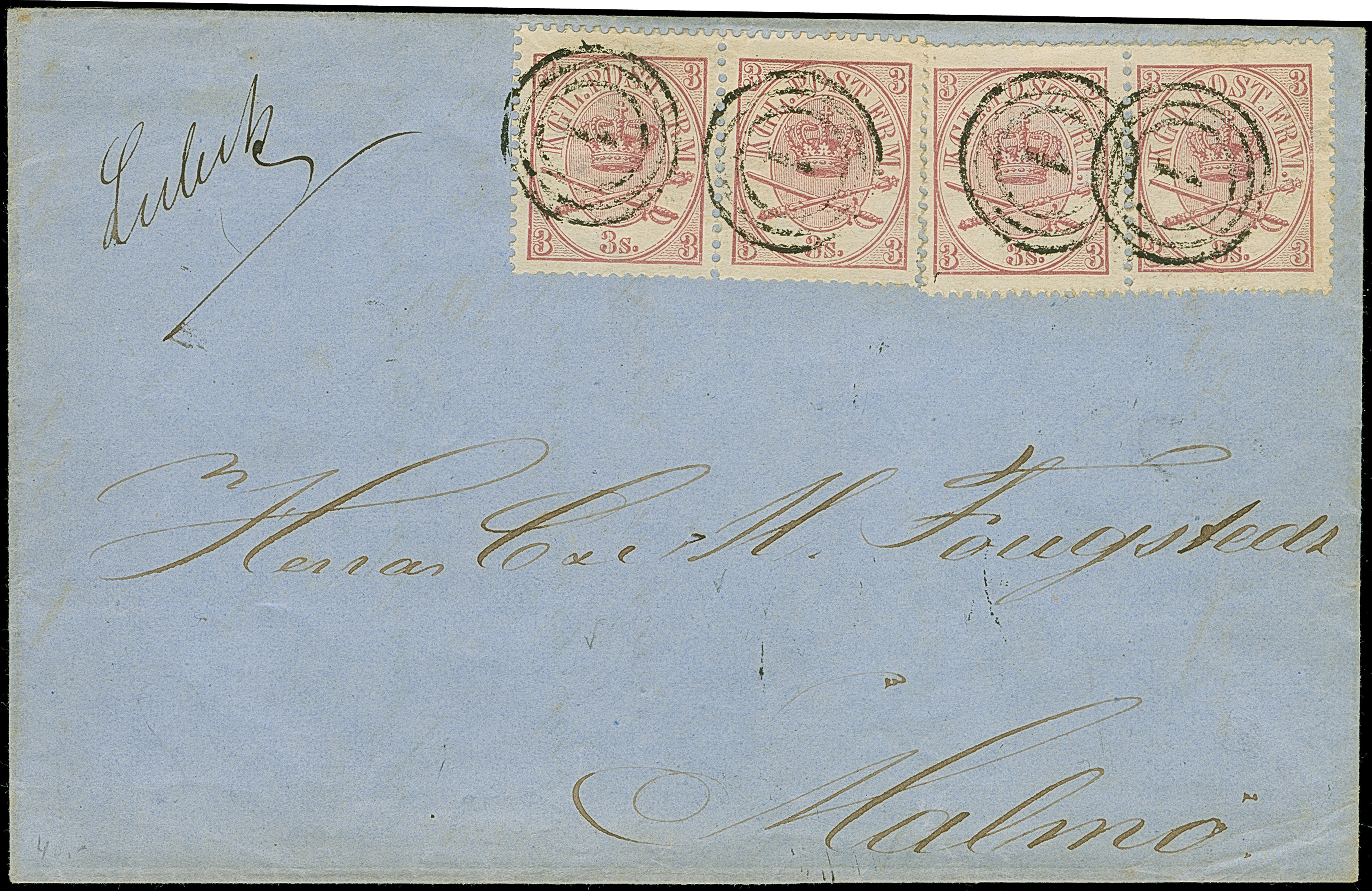 3 sk. lilac, two horizontal pairs, used on ship letter with manuscript indication of origin "Lübeck", the franking cancelled in transit with no. "1" COPENHAGEN. A fine entire with the special Lübeck-Sweden rate.