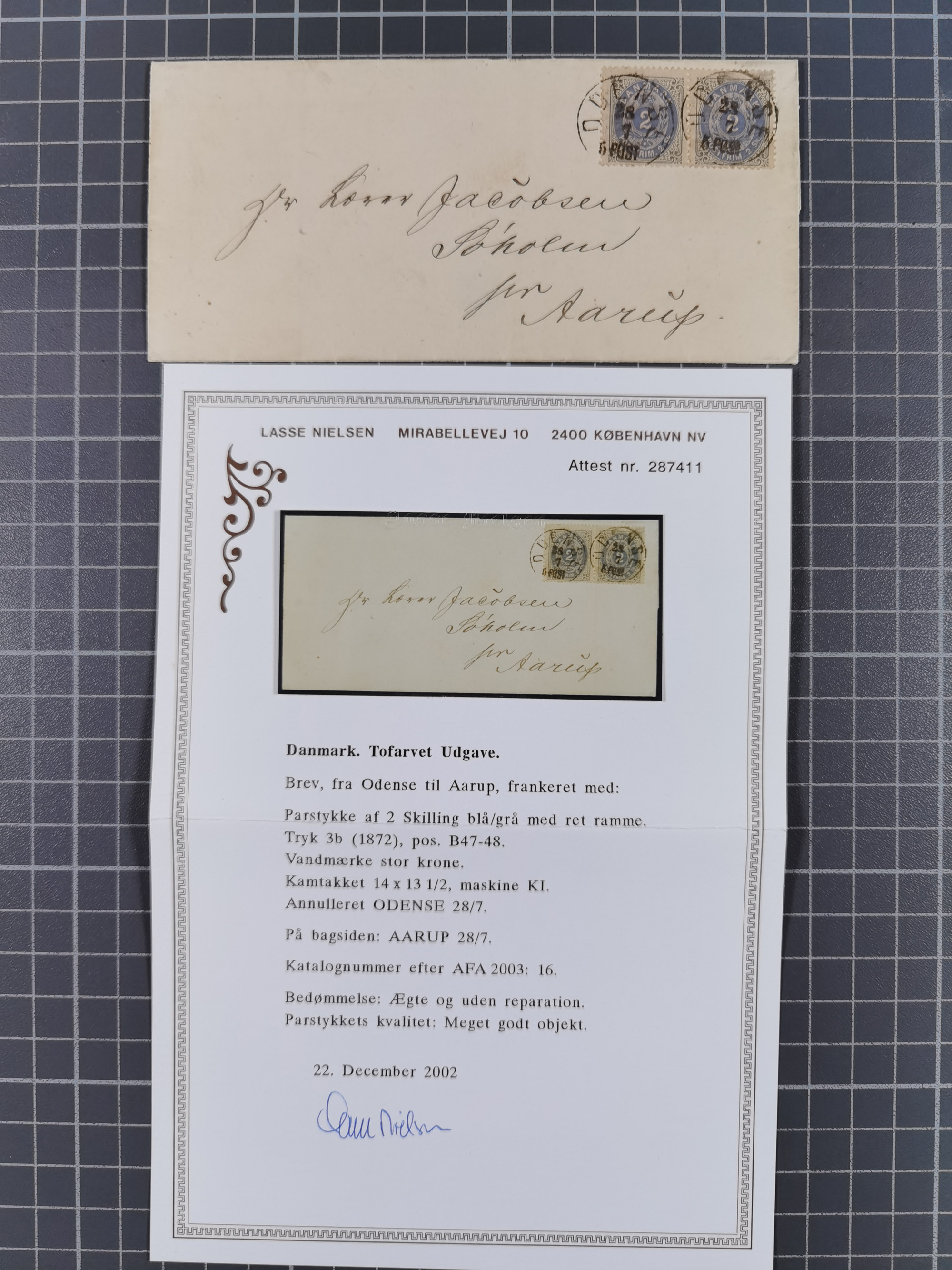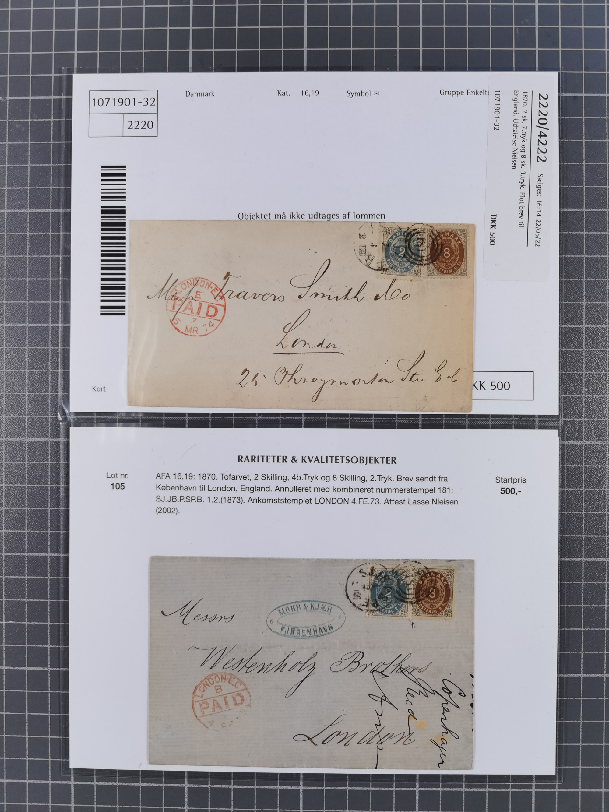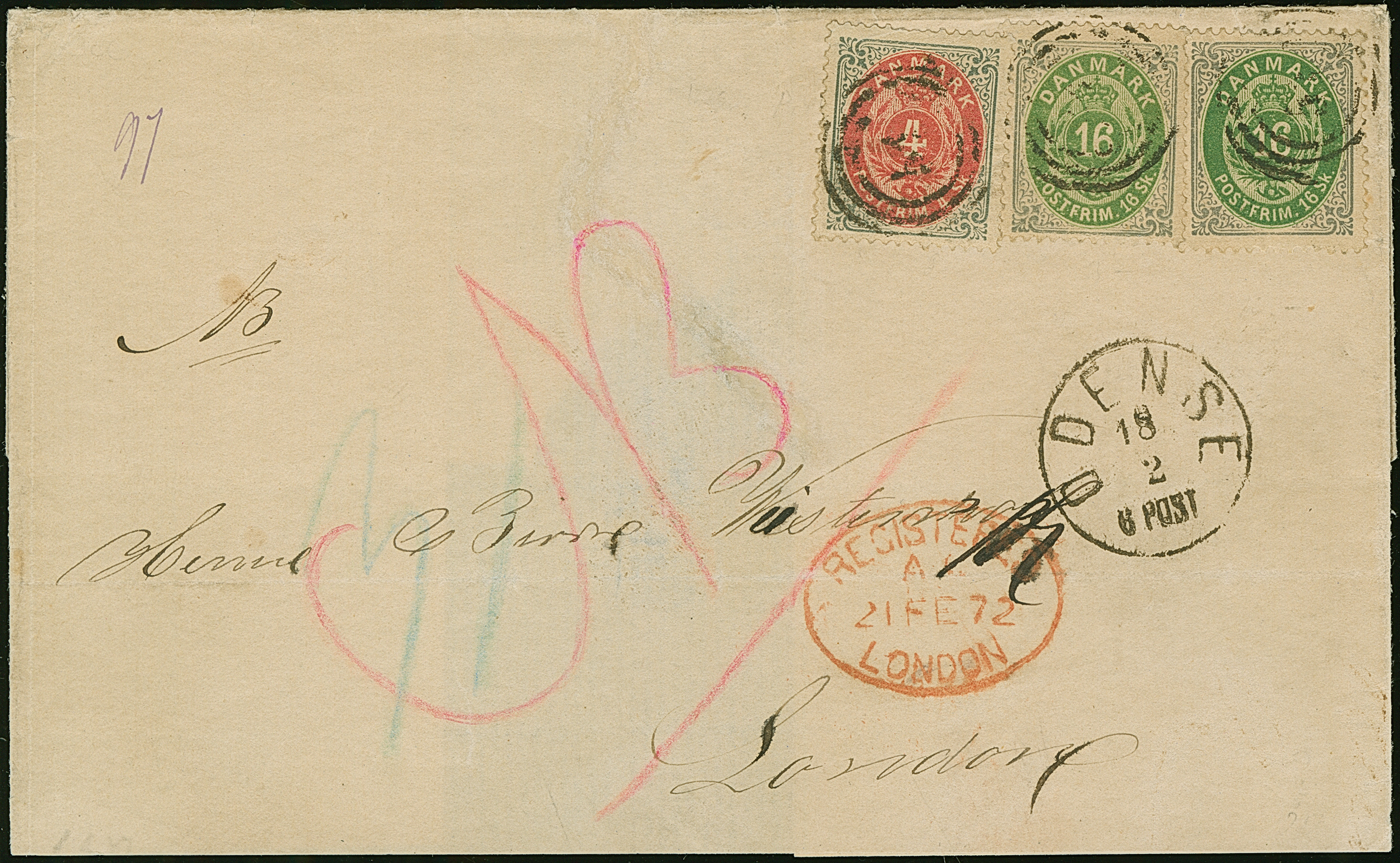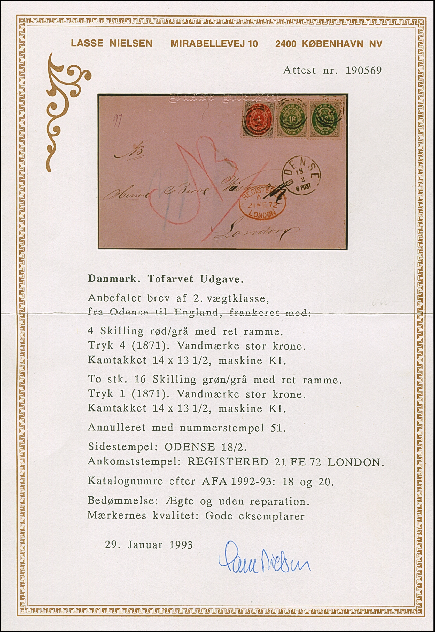 1870/74, 16 sk. green/grey, two copies, with 4 sk. red/grey, tied by no. "51" with adjacent c.d.s. "ODENSE 18 2" (1872) to 2nd rate registered lettersheet (one side flap missing) to London, with frontside arrival mark. Tear in the stationary paper repaired, otherwise very fine. A scarce franking. Certificate Nielsen (1993)