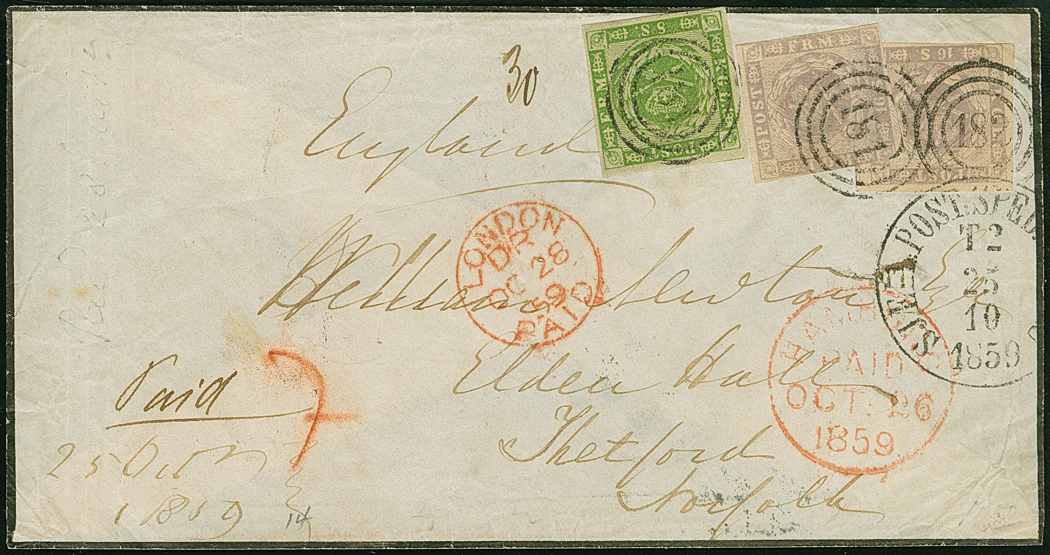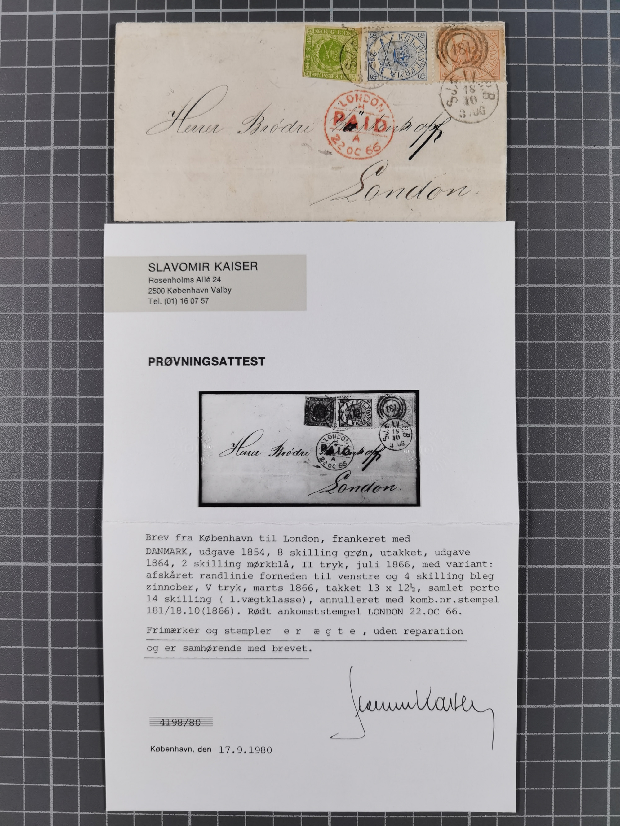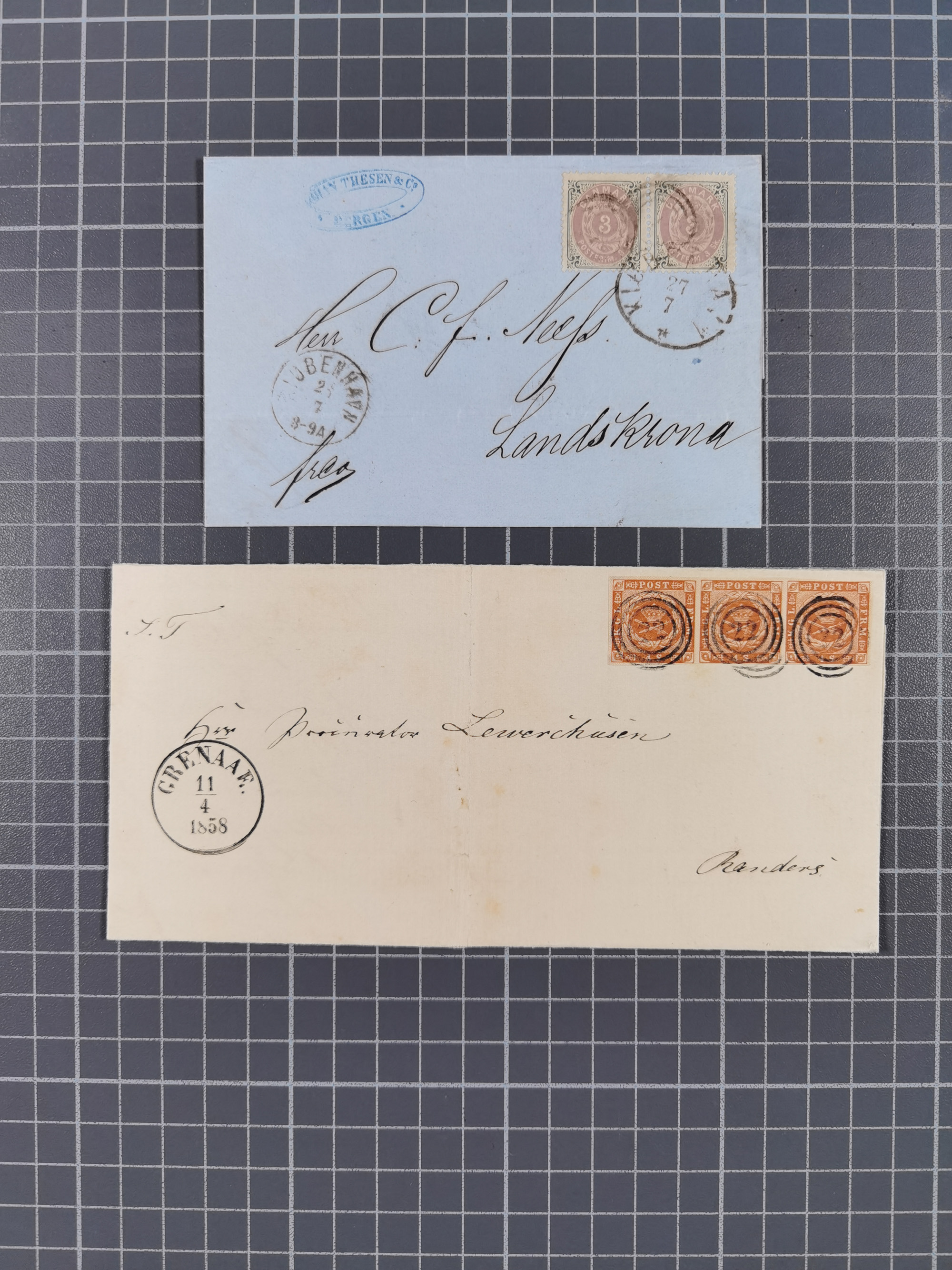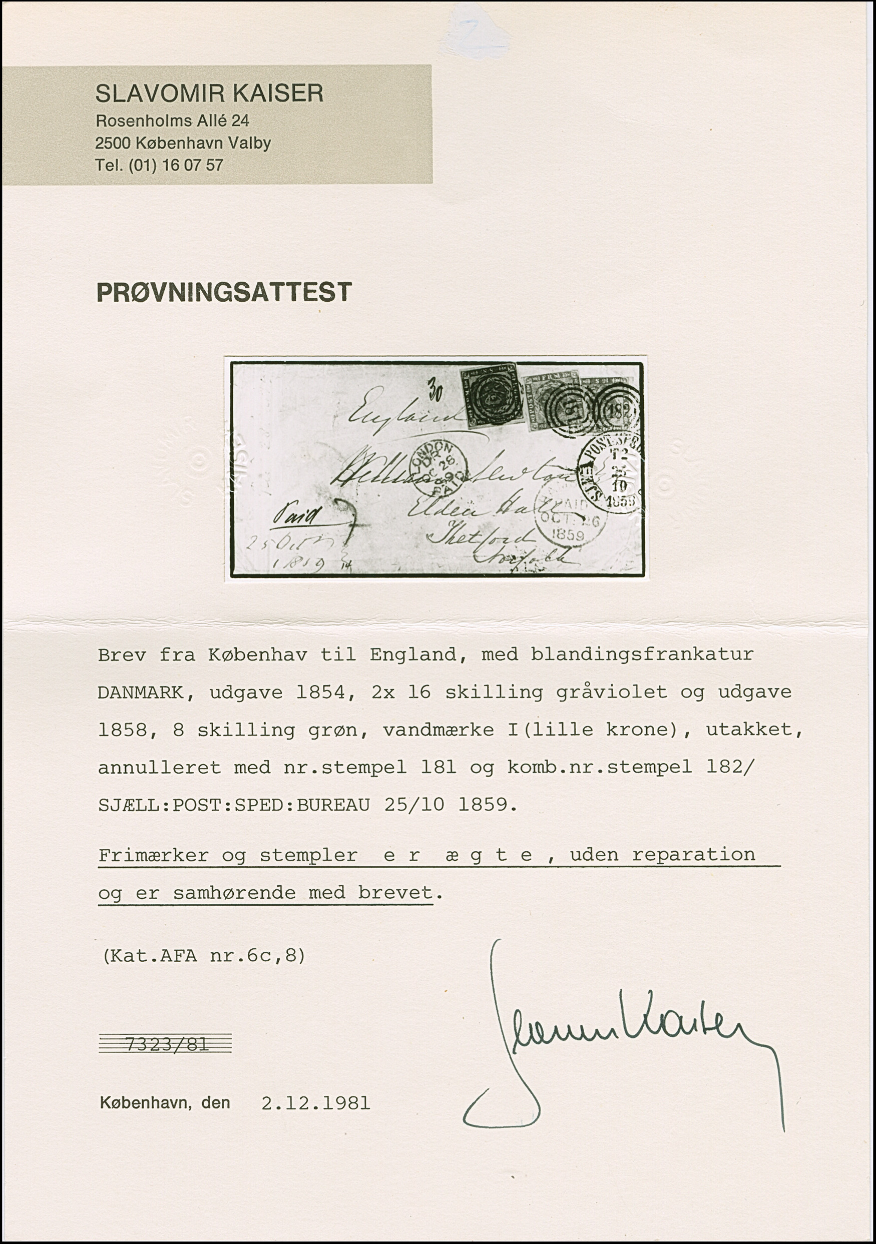 1854, 16 sk. lilac, 2 copies, and 1858, 8 sk. green, one 16 sk. slightly touched, otherwise all clear to large margins and fresh colour, tied by no. "181" and duplex "182/SJAELL.POST.SPED.BUREAU 25/10 1859" to mourning cover to England. A fine and rare franking. Certificate Kaiser (1981)