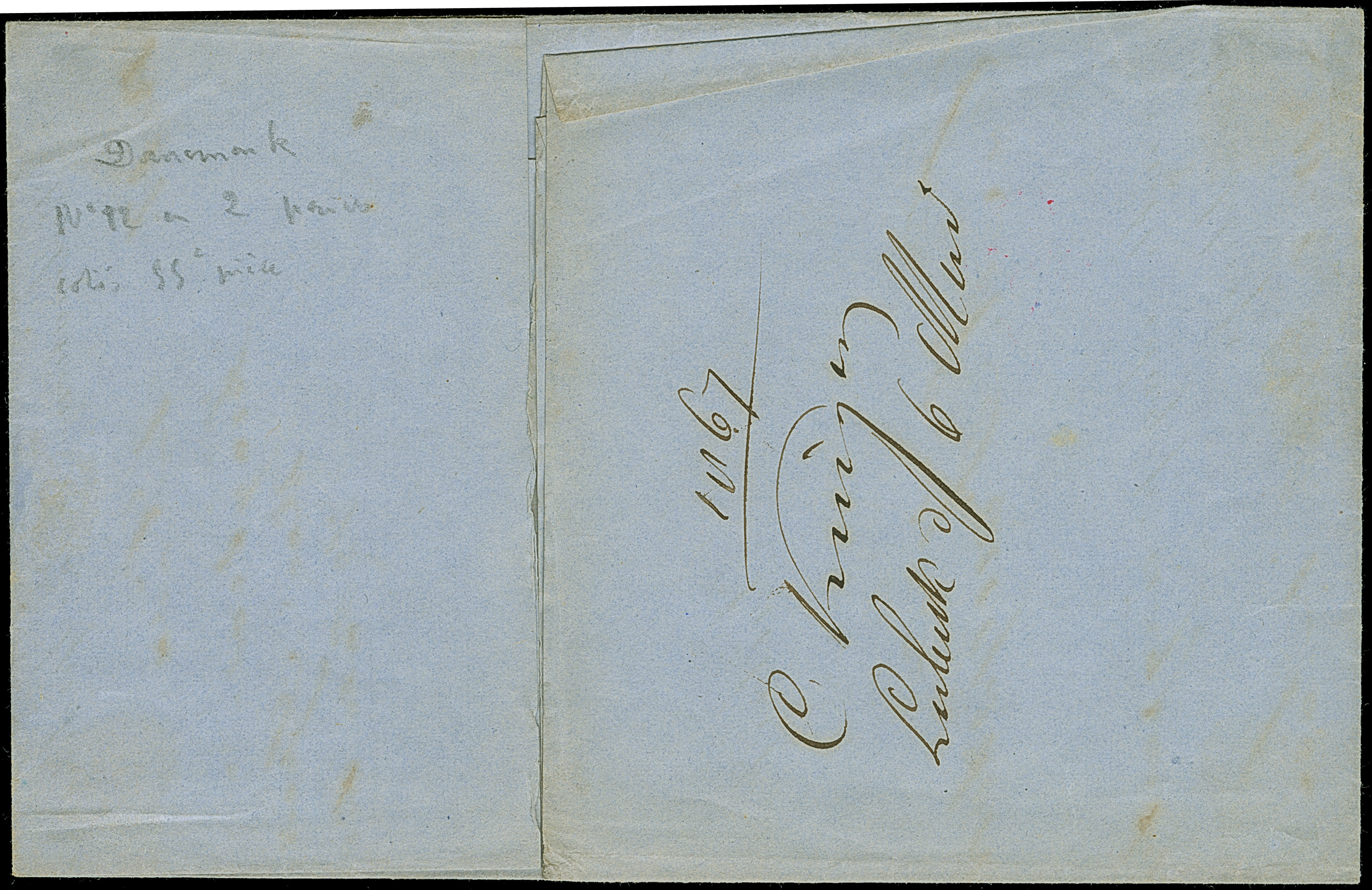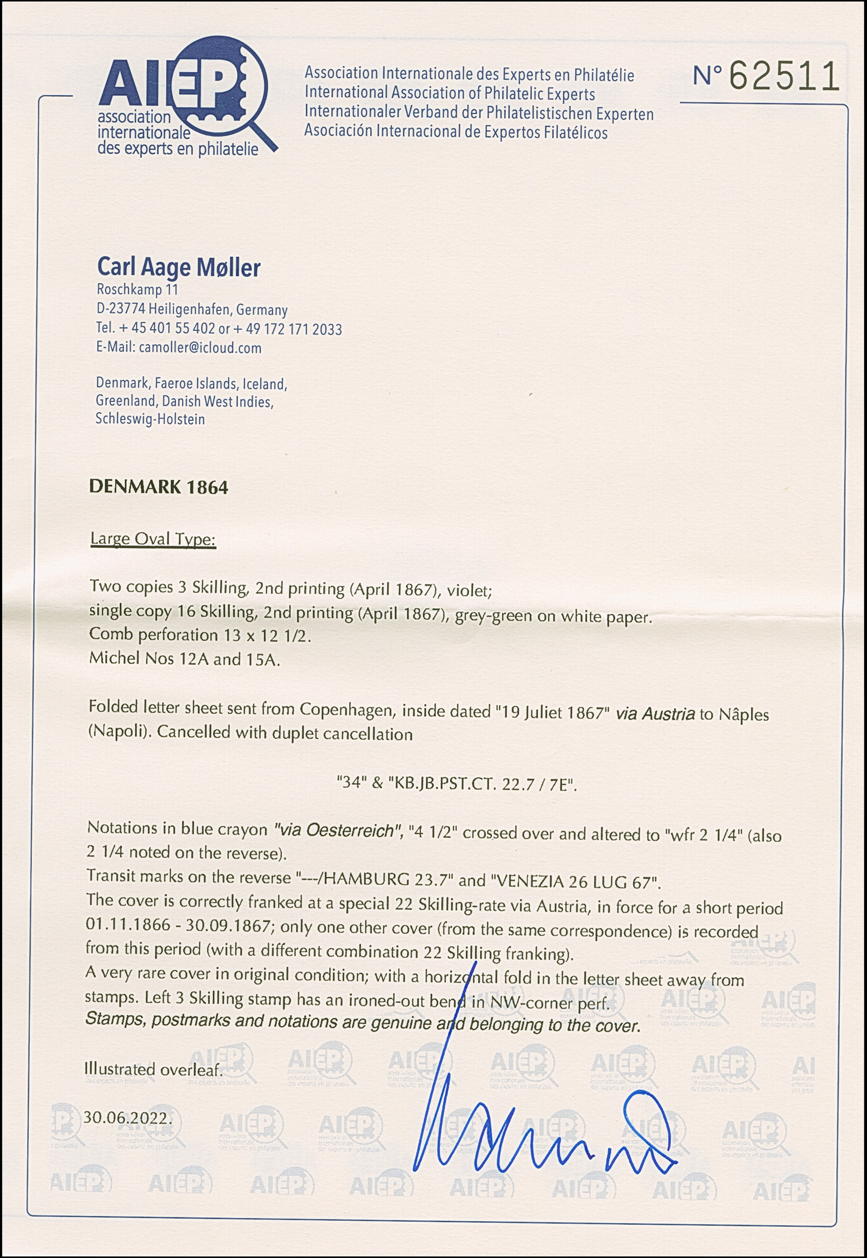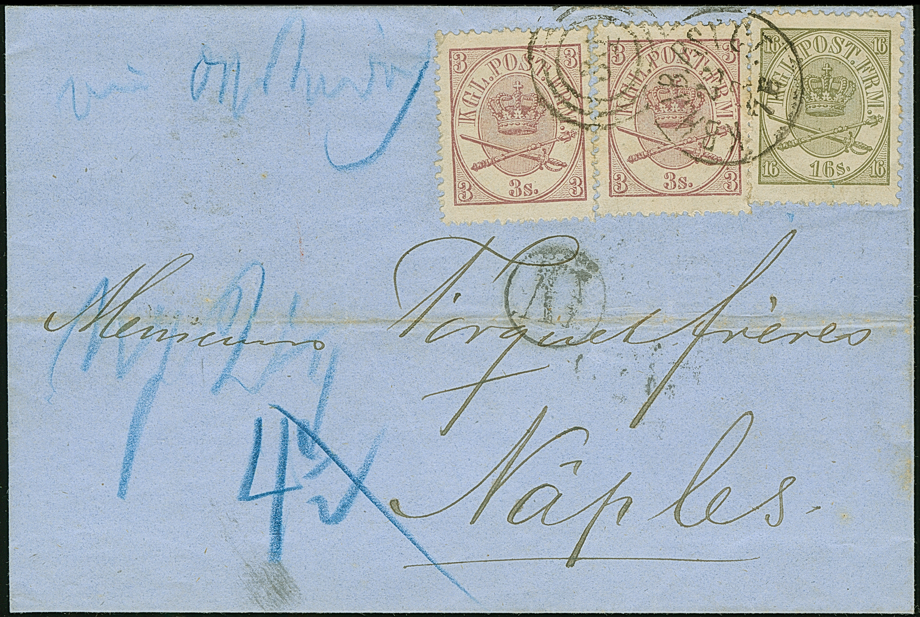 1864, 16 sk. olive and two copies 3 sk. lilac, all nice fresh colour, tied by duplex "39/KBH.JB.PSTCT 22 7" to letter sheet from Kopenhagen via Hamburg and Austria to Naples, Italy, at the special 22 sk. rate, effective September 1867 till September 1868. The left 3 sk. tiny crease in the upper left corner, otherwise very fine and fresh. A very fine and rare cover, according to certificate Moeller AIEP (2022) just one other letter at this rate has been recorded (with different franking) combination