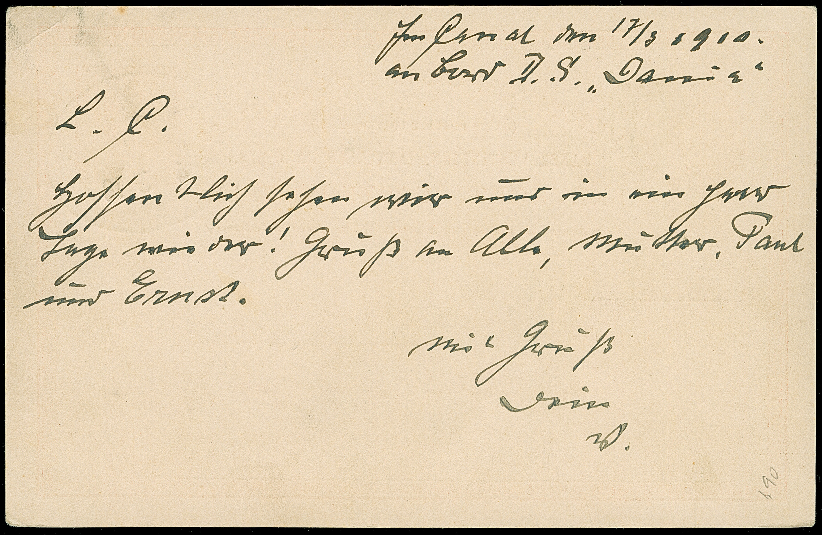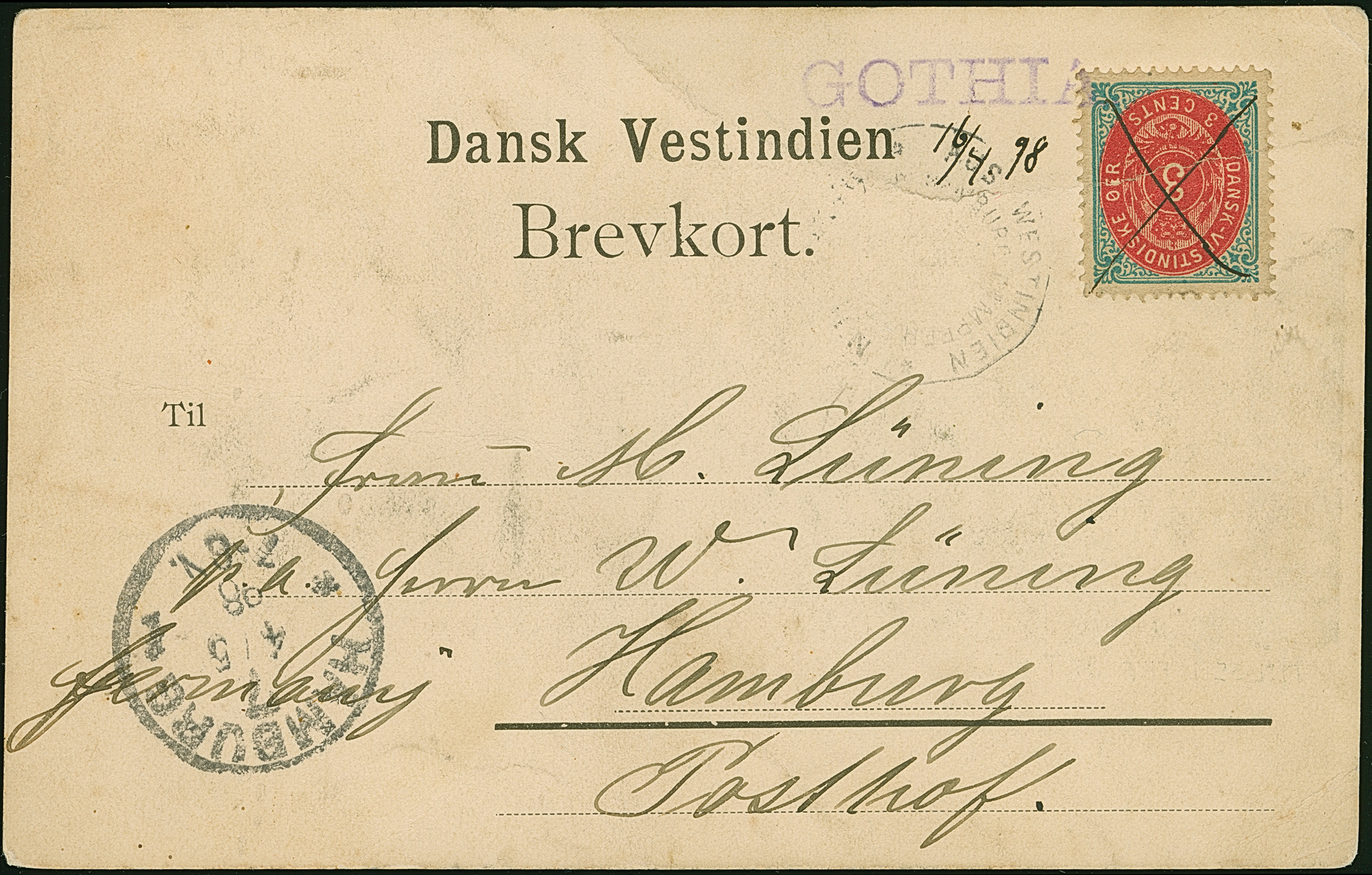 “GOTHIA” violetter L2 mit handschriftlichem Datum “16/4.98” auf Ansichtskarte mit Ziffer 3 C. mit Federstrich-Entwertung und nebengesetztem EKr. “AUS WESTINDIEN P.HAMBURG. DAMPFER ÜBER CÖLN” nach Hamburg mit Ankunftsstempel. Die Karte und die Marke mit Bug, ansonsten in guter Erhaltung