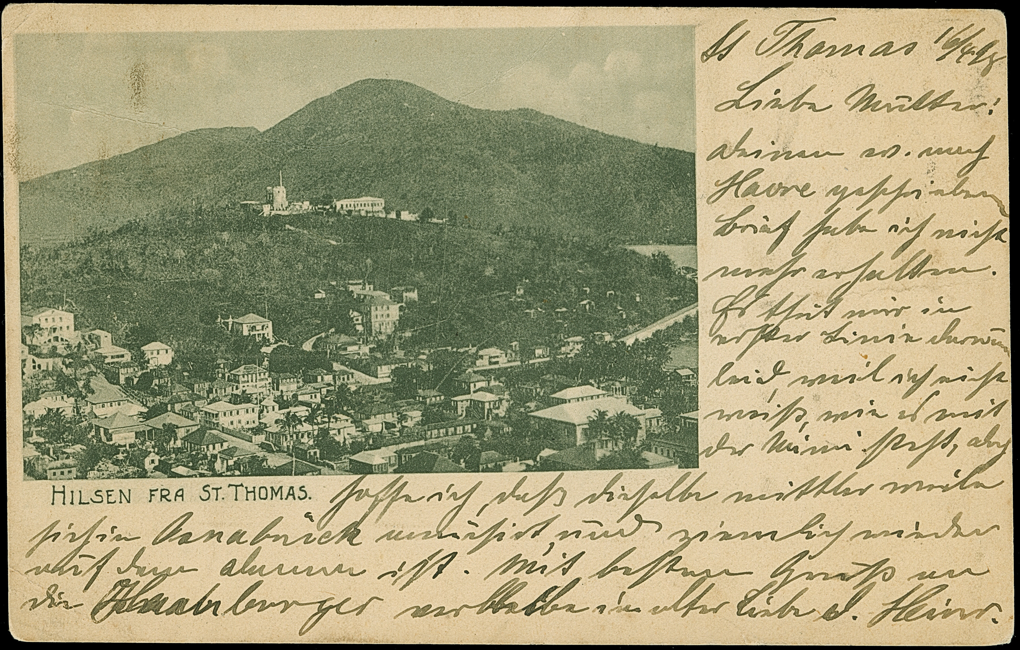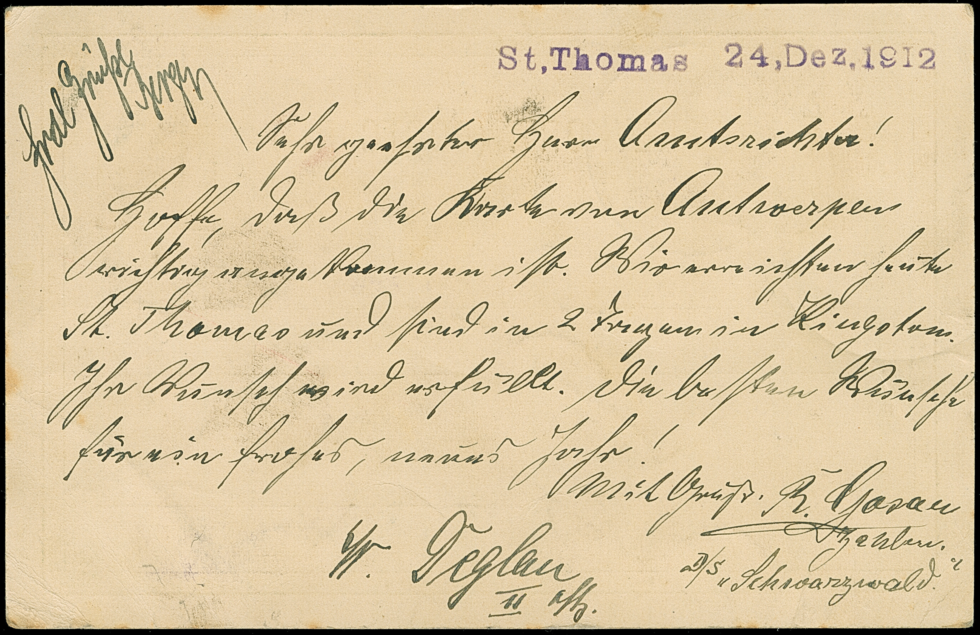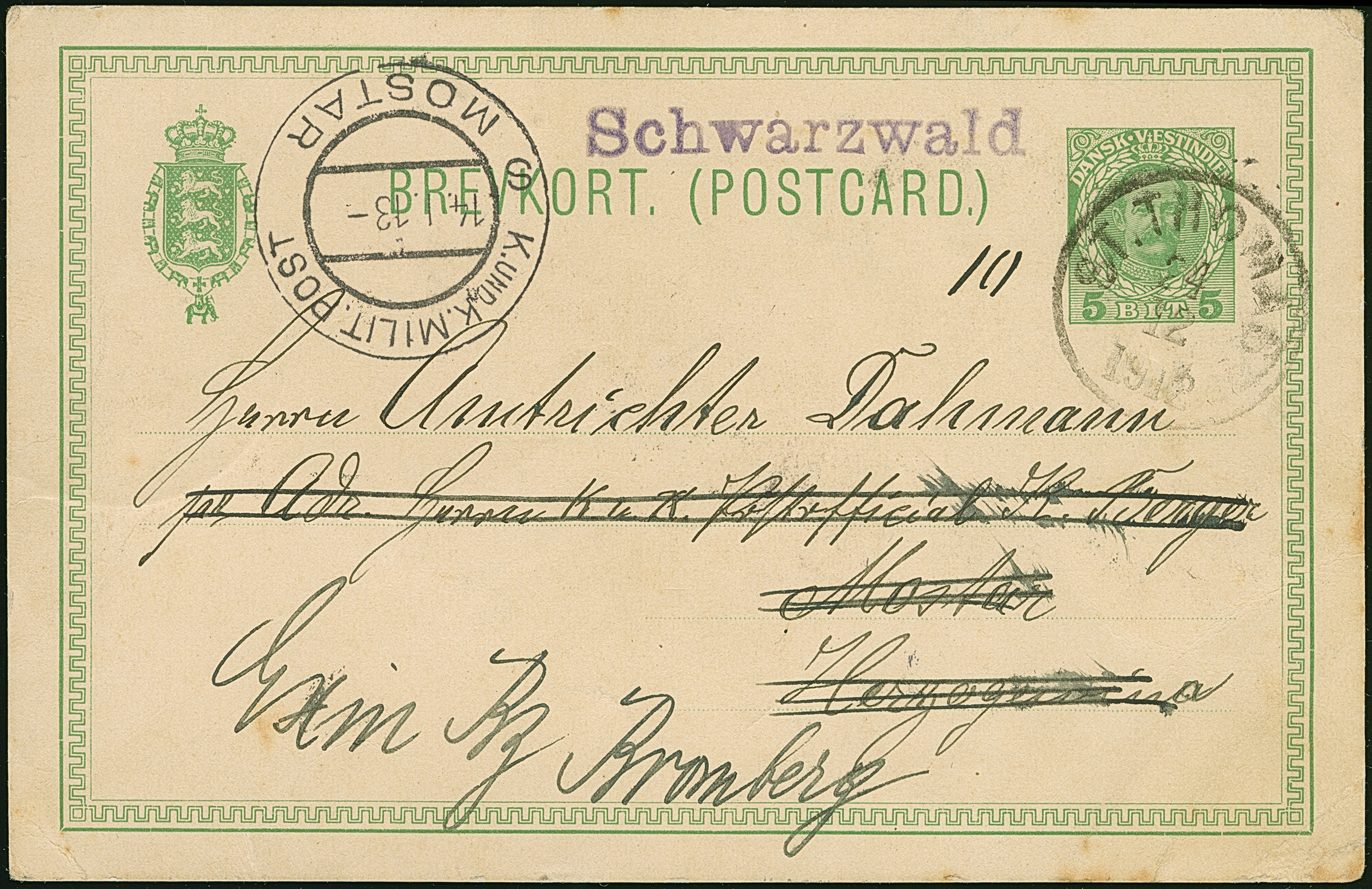 “Schwarzwald” violetter L1 klar auf Ganzsachenkarte 5 BIT mit Stempel “ST. THOMAS 24,12,1912” mit viel Text nach Mostar mit vorderseitigem Ankunftsstempel und Nachsendung. Die Karte mit kleinen Randfehlern, sonst in guter Gesamterhaltung