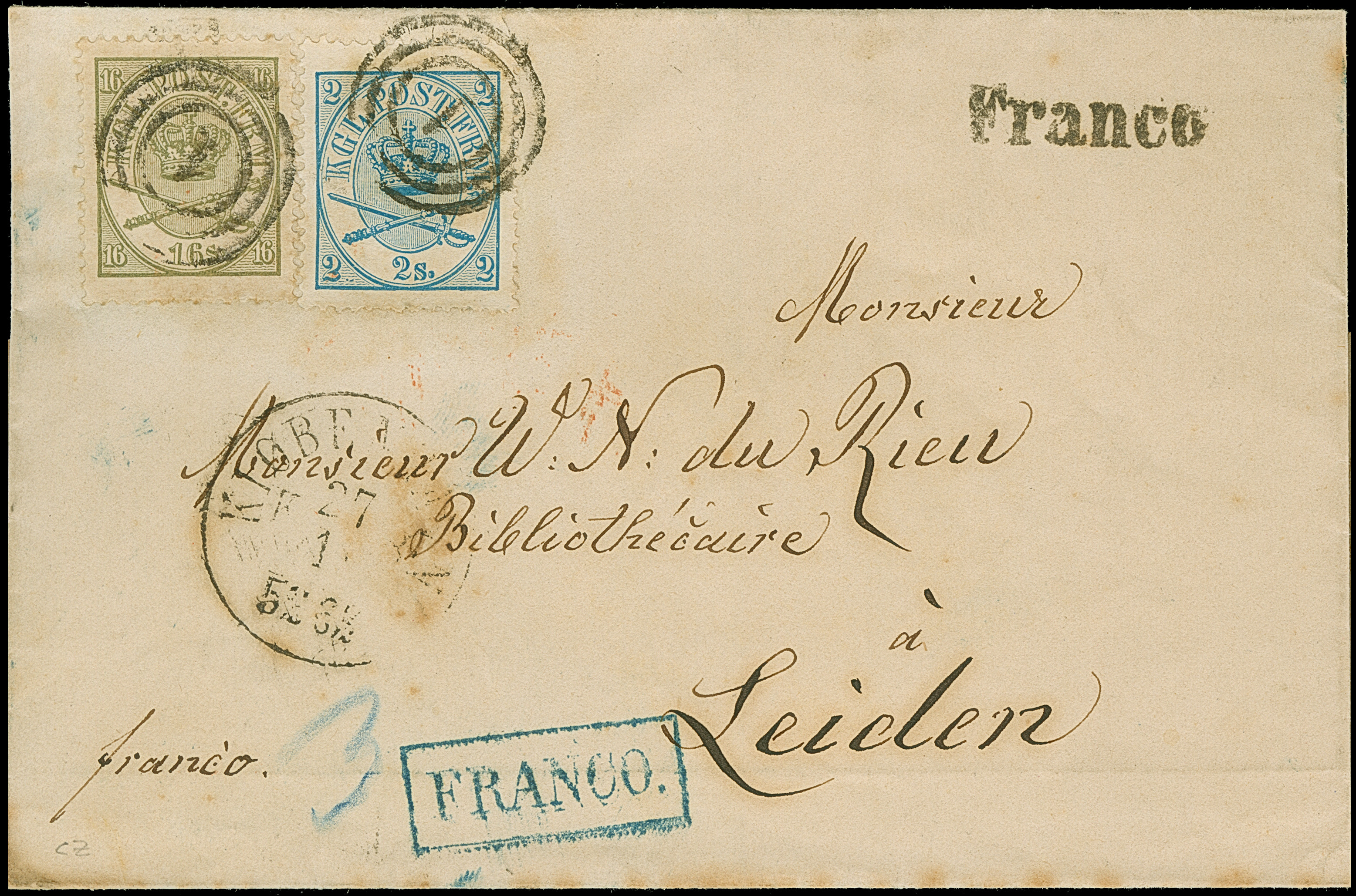 1864, 16 sk. greenish dark grey and 2 sk. blue, tied by no. "1" to lettersheet from "KJOBENHAVN 27 11" to lettersheet to Leiden, Netherlands. Some minor toning, still fine.