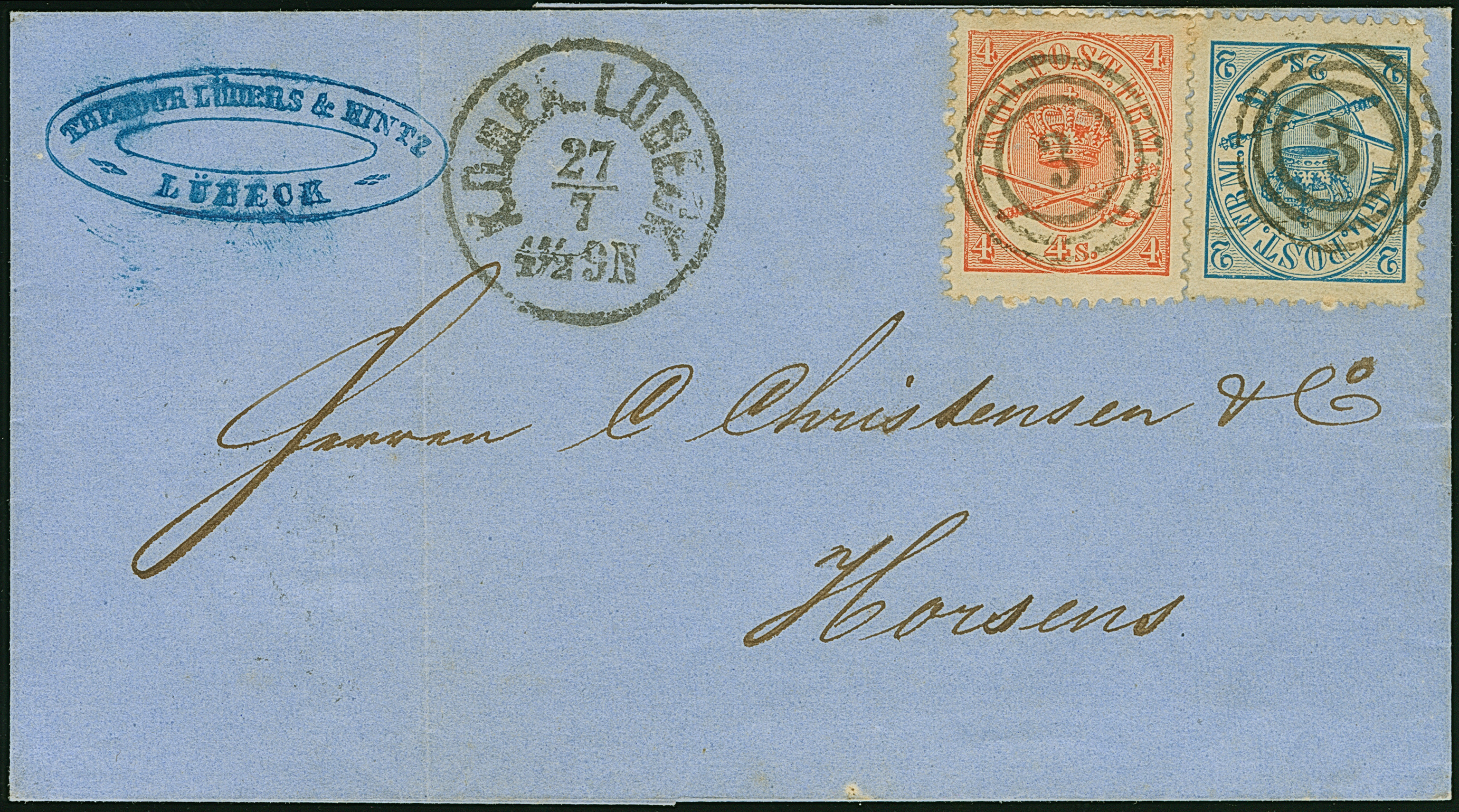 1864, Large oval type, 2 sk. blue and 4 sk. red, tied by no. "3" with adjacent "K.D.P.A. LÜBECK 27/7" to lettersheet to Horsens, Denmark. Some minor toning, otherwise very fine.