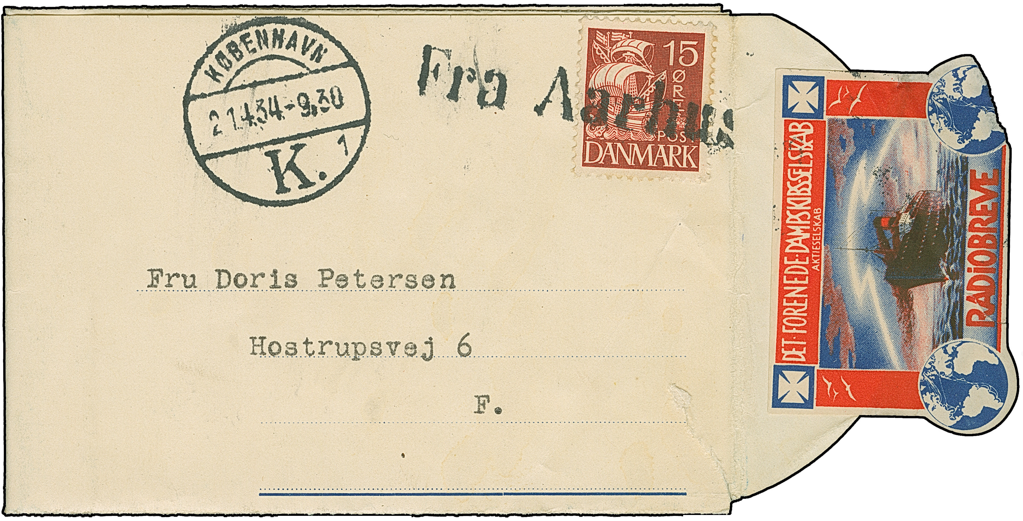 1934, Vordruck-Kartenbrief “RADIOBREVE” mit Dänemark Karavelle 15 Ö. mit L1 “Fra Aarhus” und nebengesetztem Stempel “KOPENHAVN 21.4.34” für eine Nachricht vom Dampfer “Oregon”, rückseitig mit durch das Öffnen fehlerhafte Verschlussmarke und ein Einriss unten, sonst in guter Erhaltung