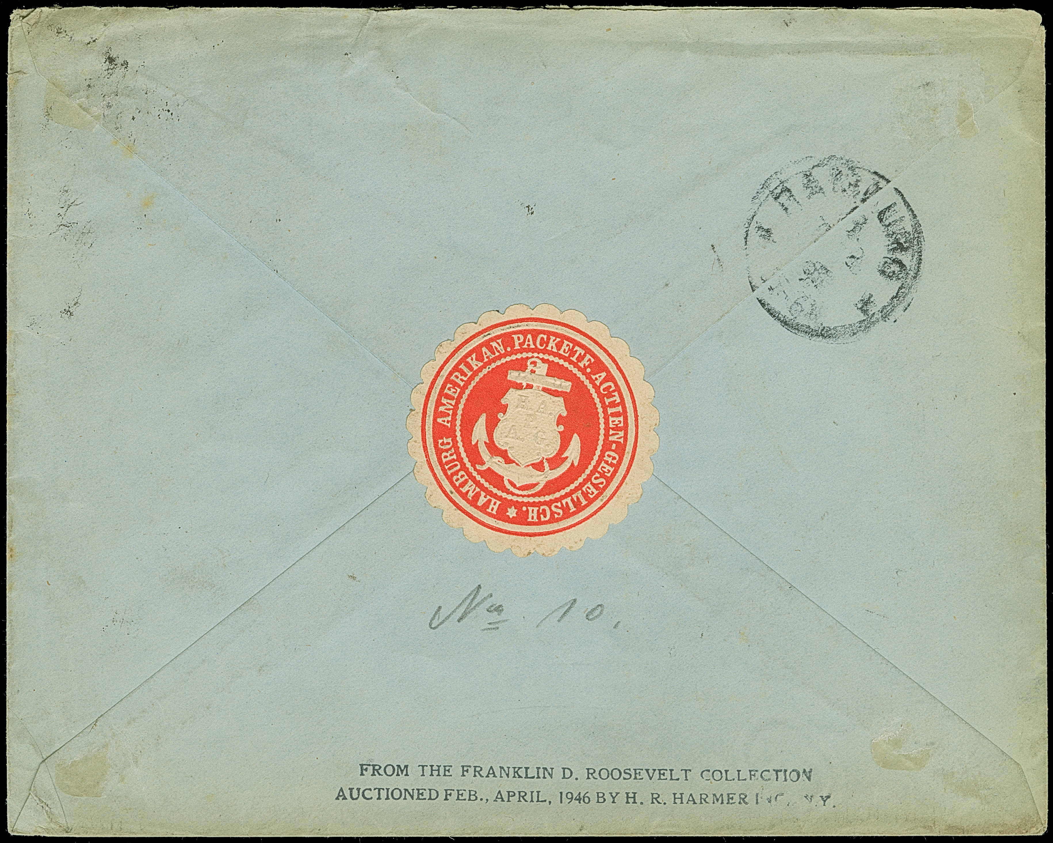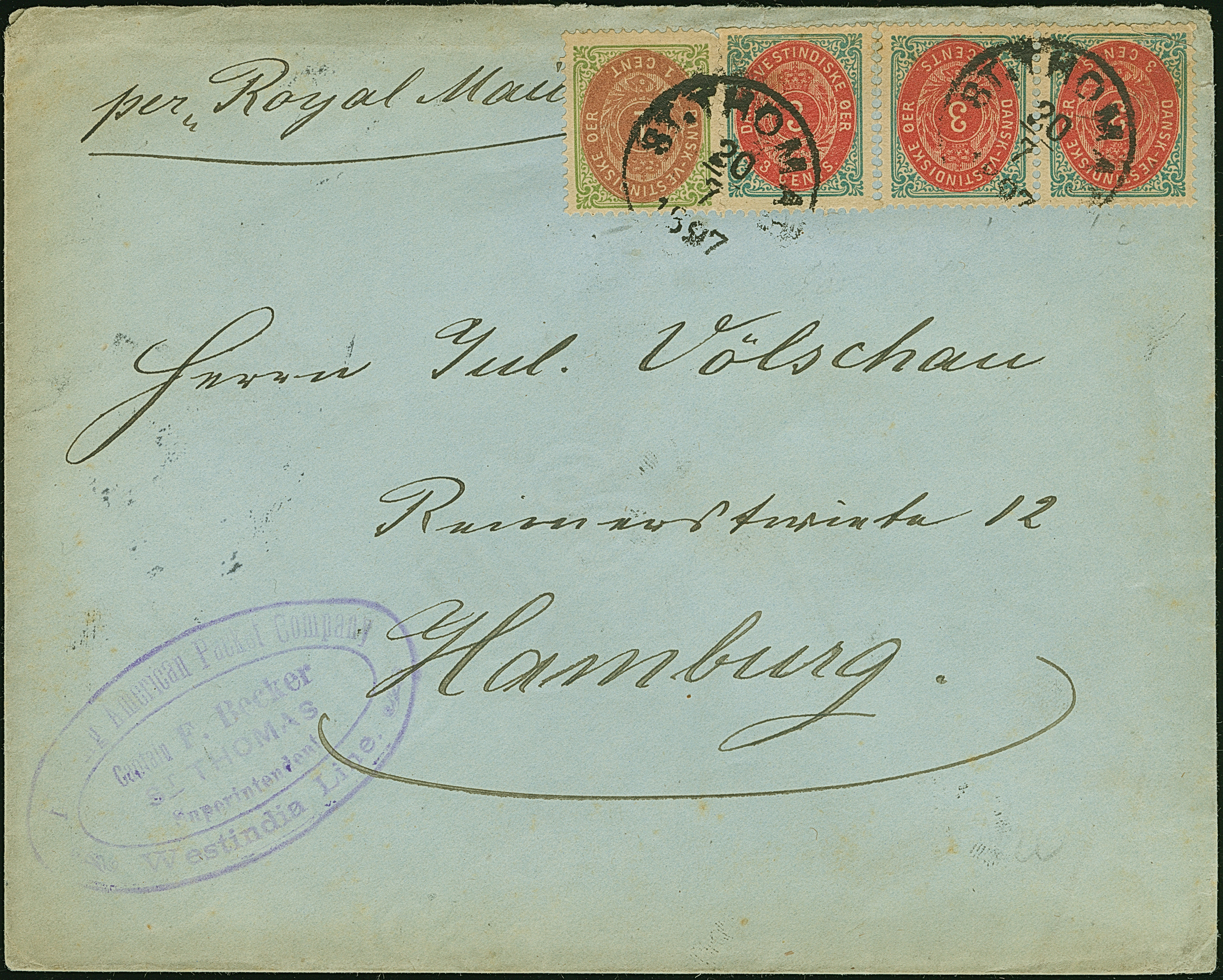 1873, 1 C. helklgrün/braunrot und waagerechtes Paar und Einzelmarke 3 C.blaugrau/rot mit kopfstehendem Rahmen je mit EKr. “ST. THOMAS 20.7.1897” auf Briefkuvert mit Absenderstempel “Hamburg American Packet Companay Westindia Line” und handschriftlichem Leitvermerk “per Royal Mail” sowie rückseitig mit Verschlussmarke der Gesellschaft nach Hamburg mit Ankunftsstempel. Die Marken haben zum Teil kleine Zahnfehler bzw. sind eckrund, die rechte Marke mit Eckfehler rechts oben. Trotz der Einschränkungen eine nicht häufige Frankatur-Kombination, rückseitig mit Stempel "From the Franklin D. Roosevelt Collection…."