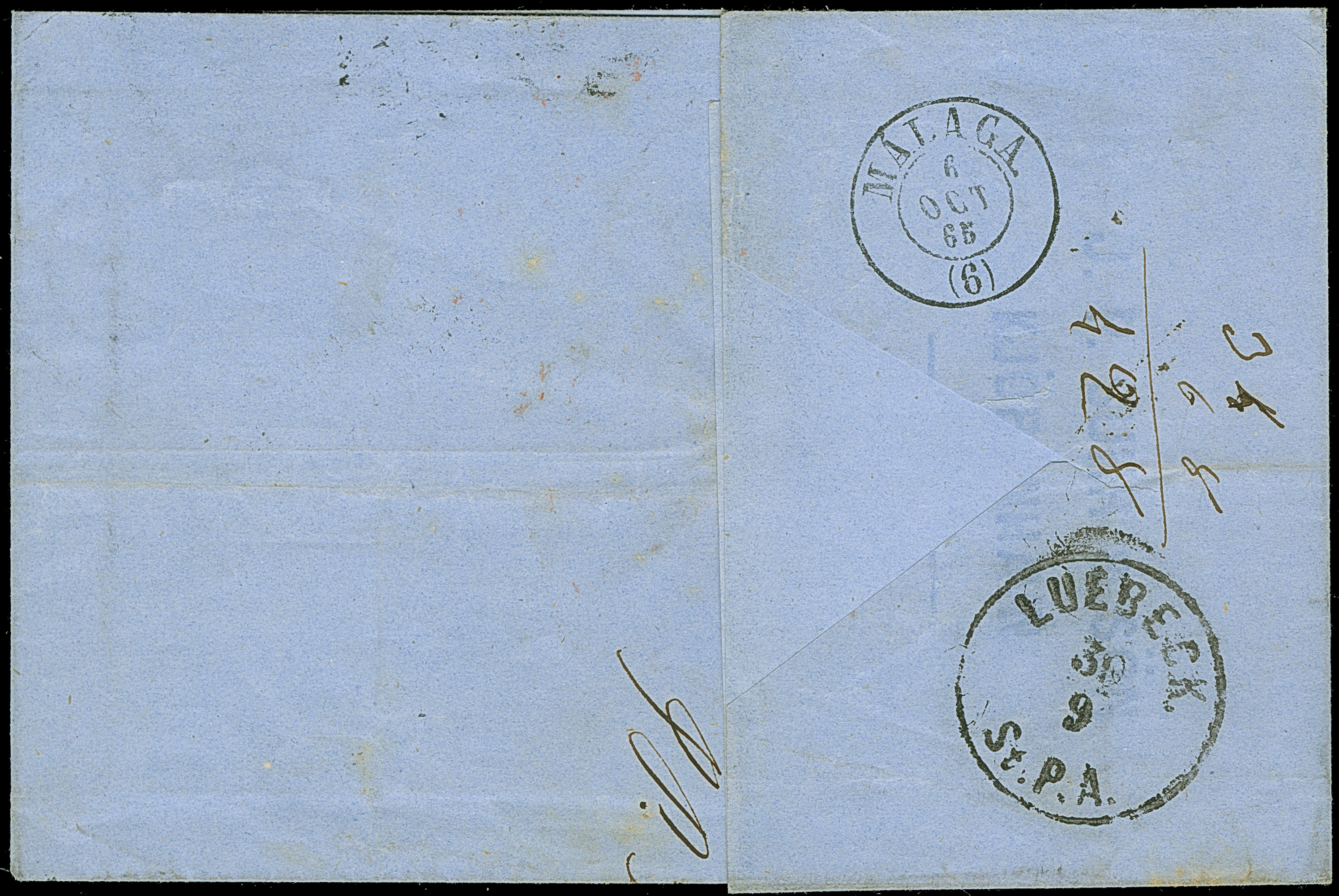 “SPAN./PREUS./PORT./T.T.”, Ra.2, sauber auf Briefhülle 1865 von Kopenhagen mit Duplex "181/S.J.JB.P.SP.B."nach Malaga