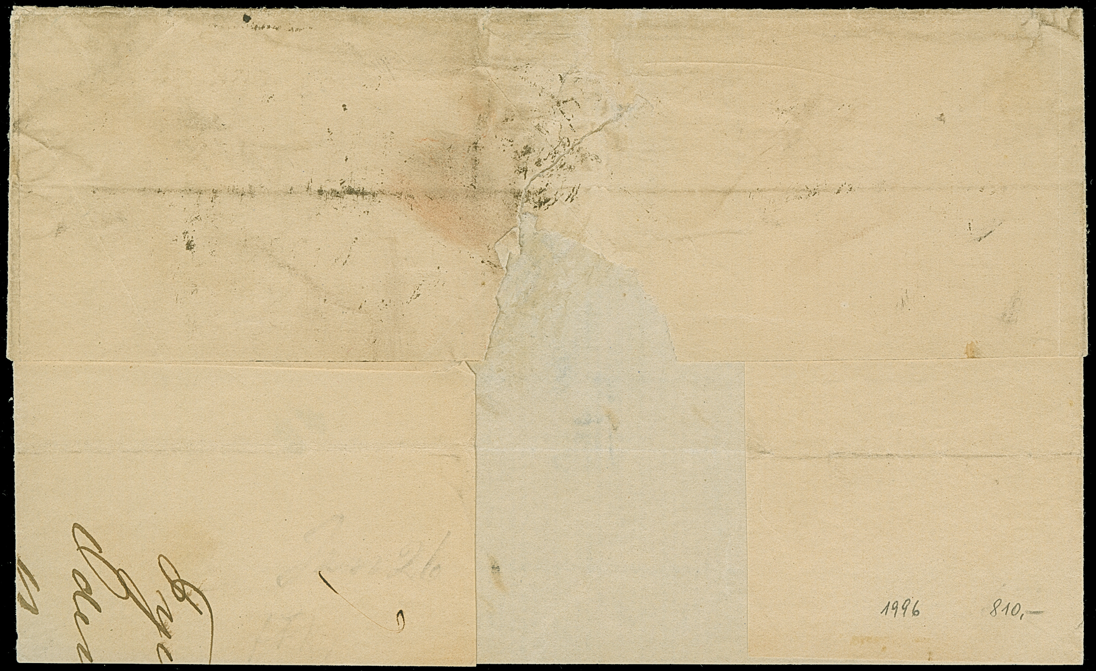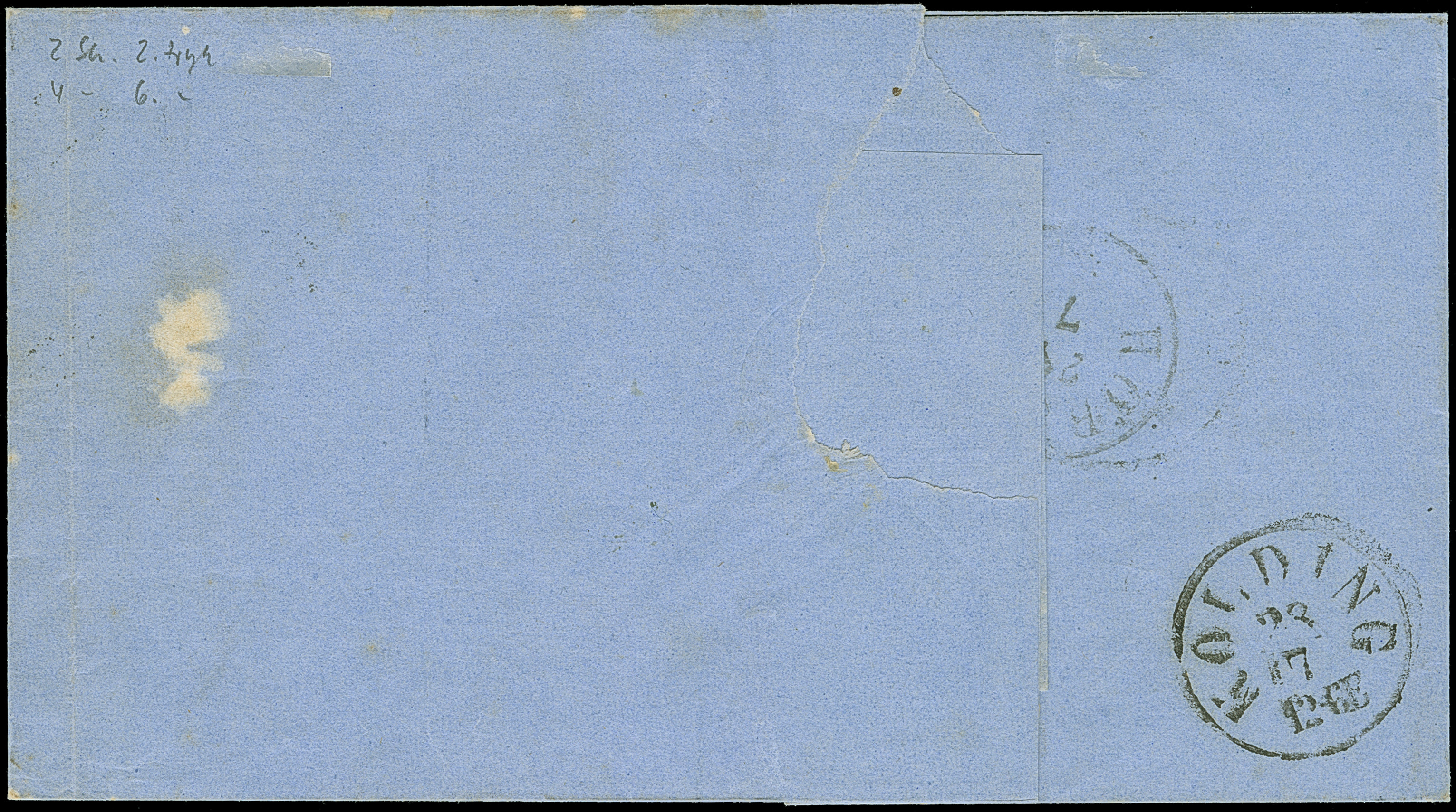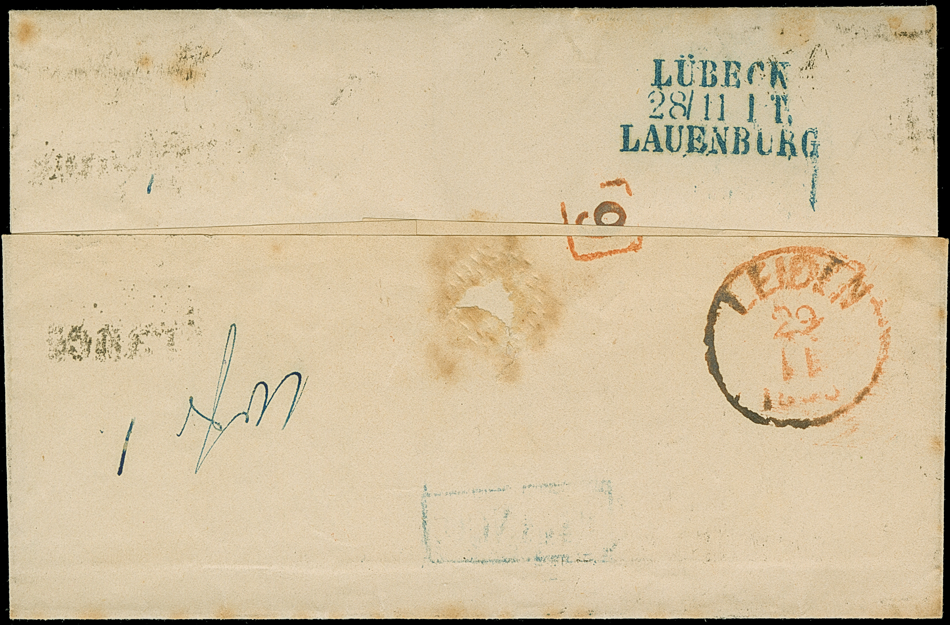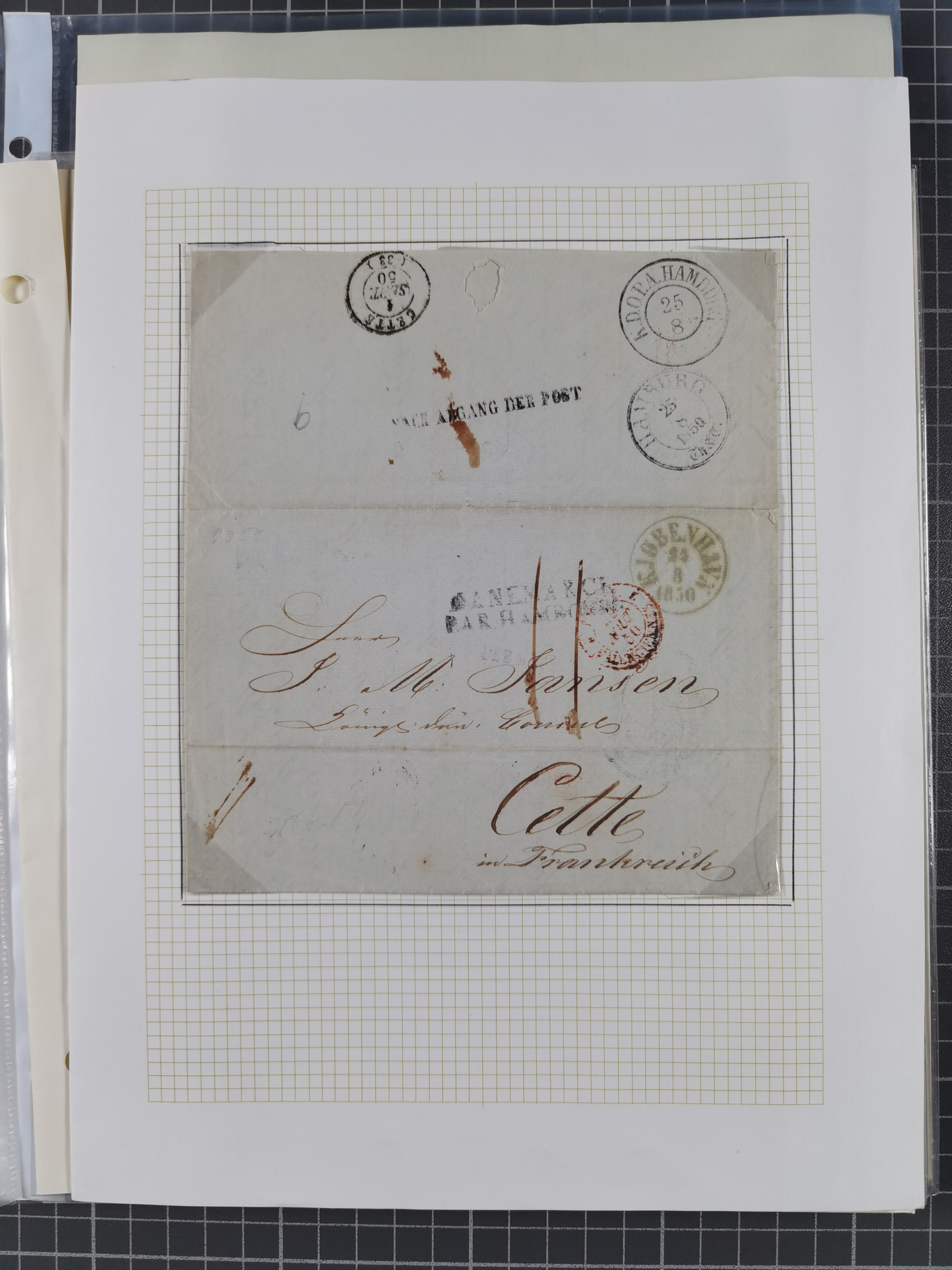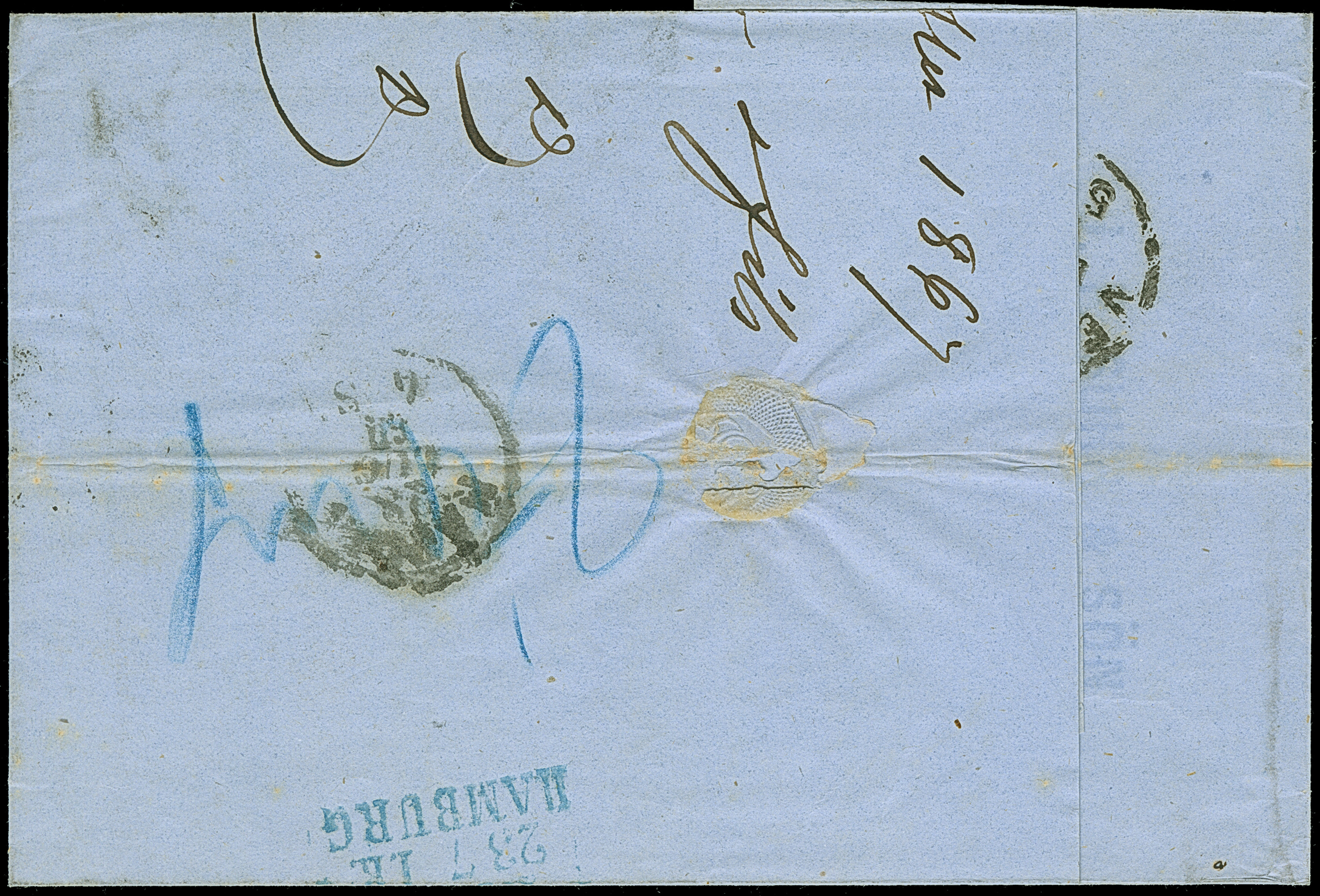 1852, kompletter Faltbrief mit Absenderstempel aus Hamburg und Leitvermerk “via Southampton p W.I.Steamer” sowie rotem Tax-Vermerk “19” (Schillinge) via London mit rotem “PAID 6.MRZ.”-Stempel an den Forwarded-Agent “Schön-Willink & Co.” in St. Thomas, von diesem weiterbefördert nach La Guayra, Venezuela. Ein interessanter Brief in guter Erhaltung nach Übersee