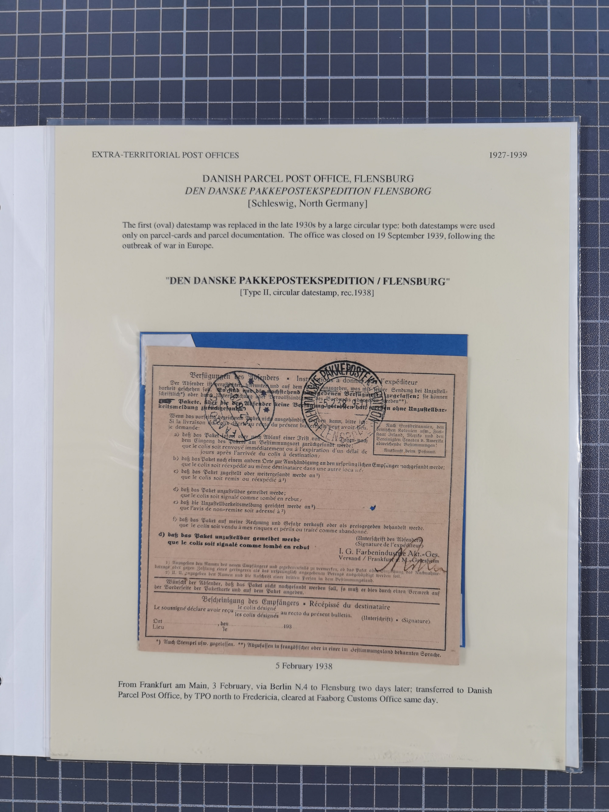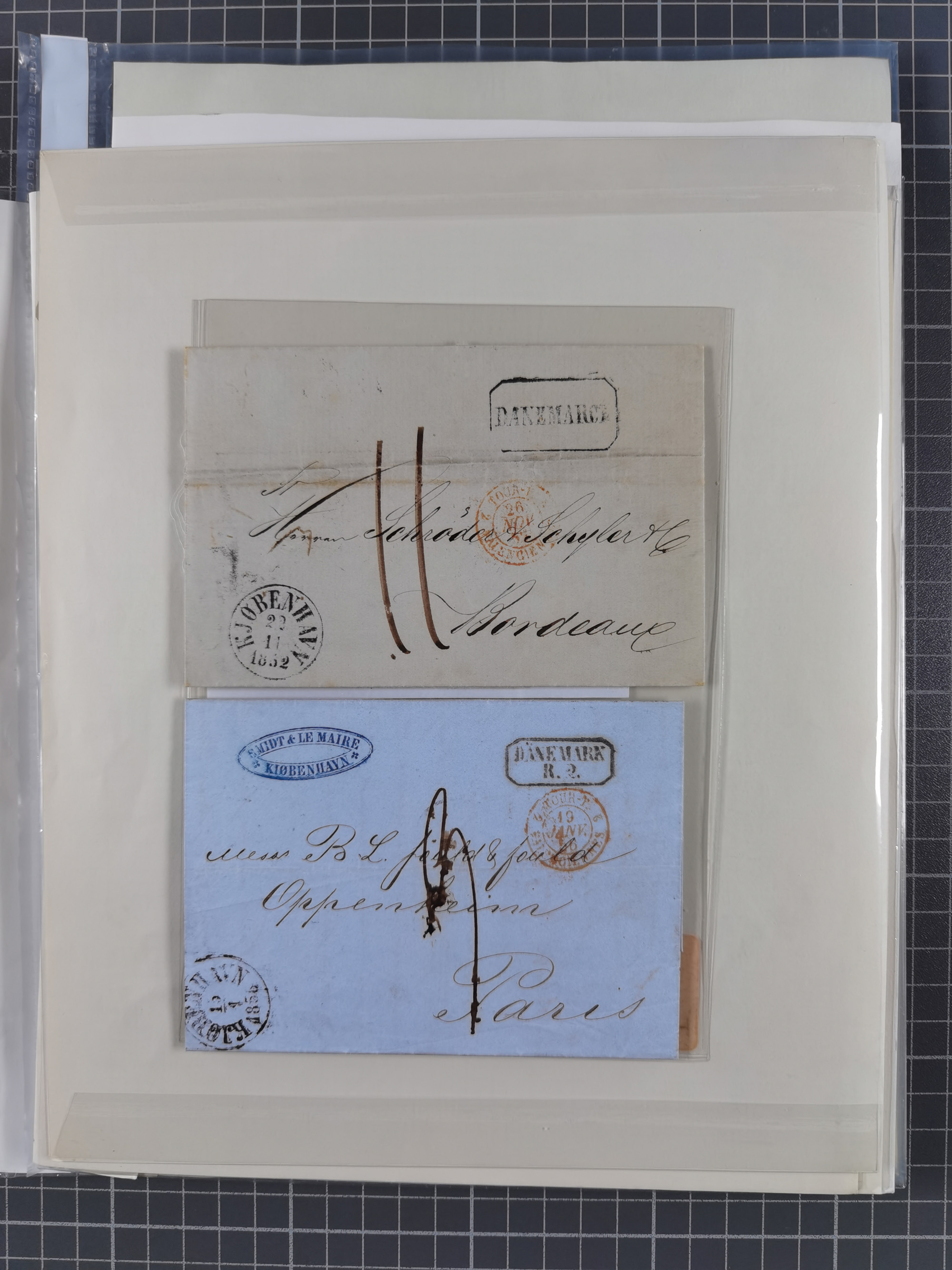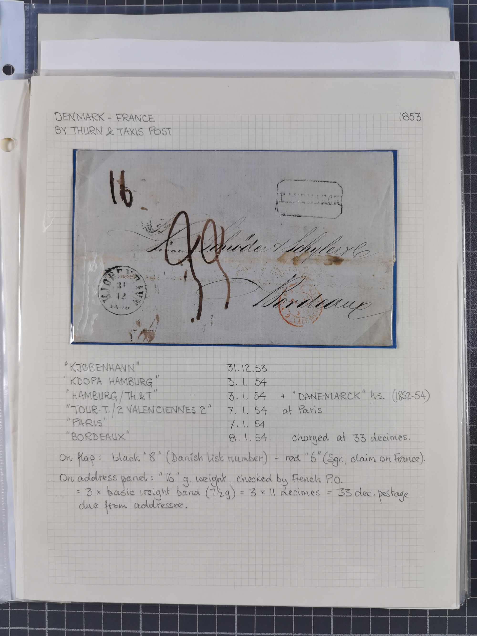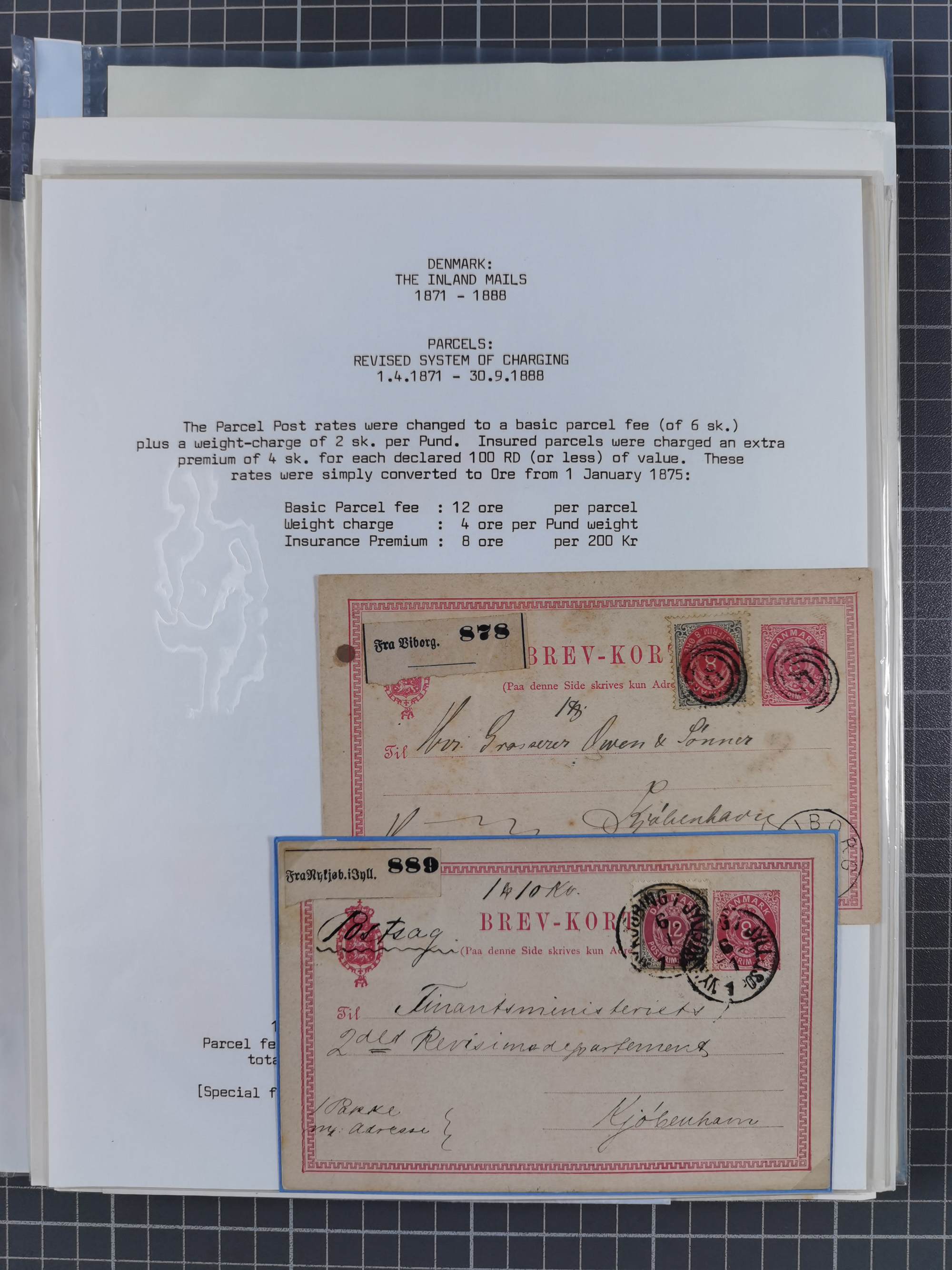 1736/1938, 18 entires, almost all mailed abroad, mostly to France, but also two 10 skilling frankings to London and 3 parcel cards to Denmark with handstamps of the danish PO at Flensburg.