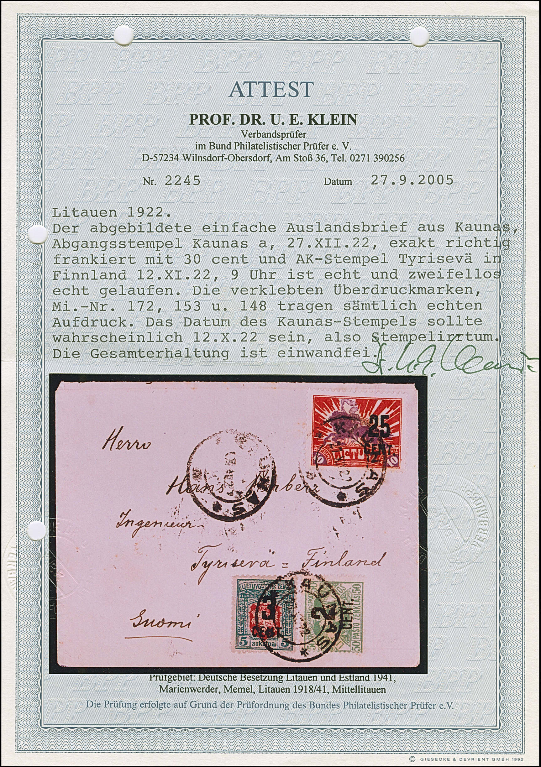 1922, New Currency surcharge 3 cent on 5 auksinai, together with additional franking, tied by cds. “KAUNAS 27.XII.22” to cover to Tyriseva, Finnlad. A very rare cover, only very few registered, the majority being from the Baggo-Correspondence, certificate Klein BPP (2005)