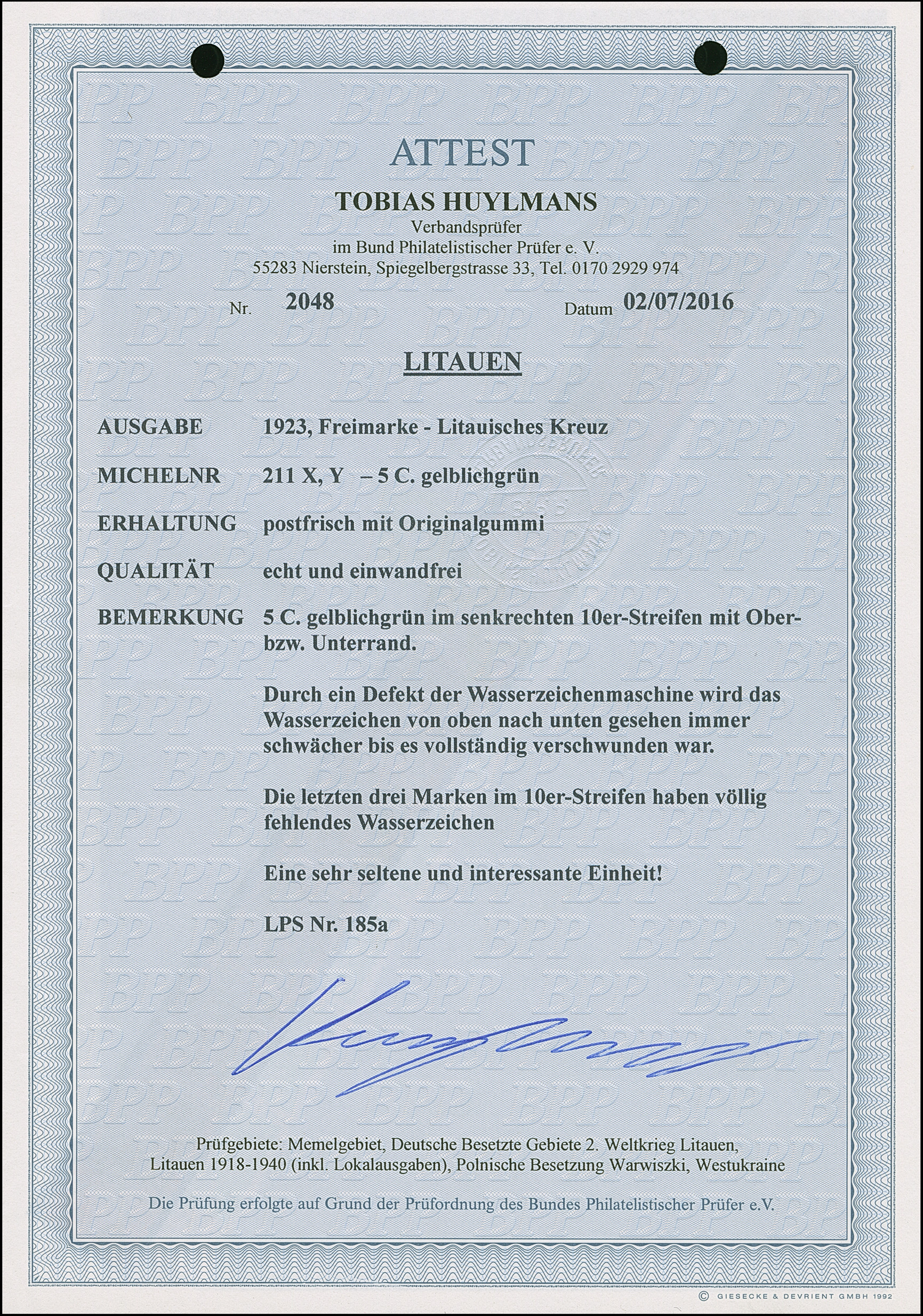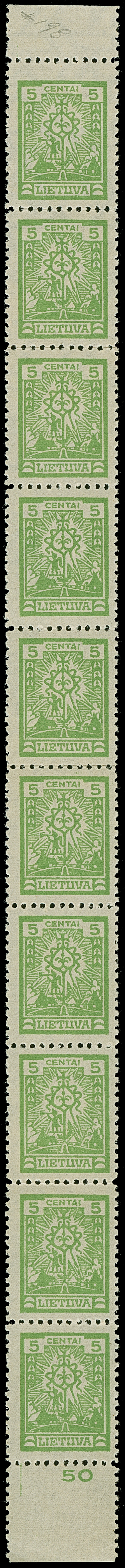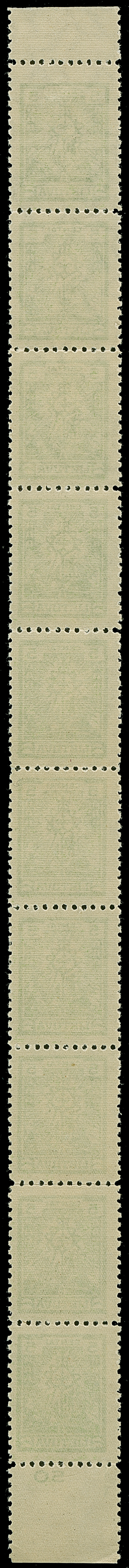 1923, Cross issue 5 centu green, vertical strip of ten with sheet margins, mint never hinged, cleary showing progressive fading of watermark, leaving the last three stamps completly without watermark, a very scarce and interesing multiple clearing showing the process of fading out watermark due to a machine error, certificate Huylmans BPP (2016)