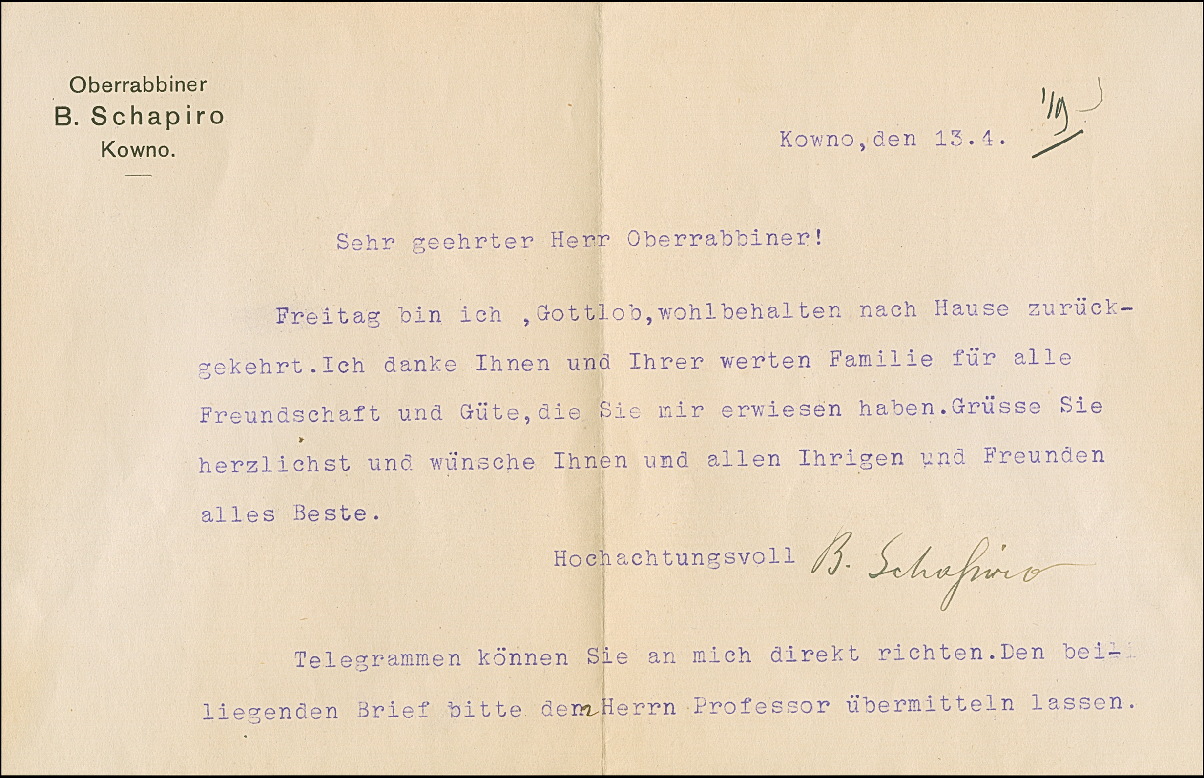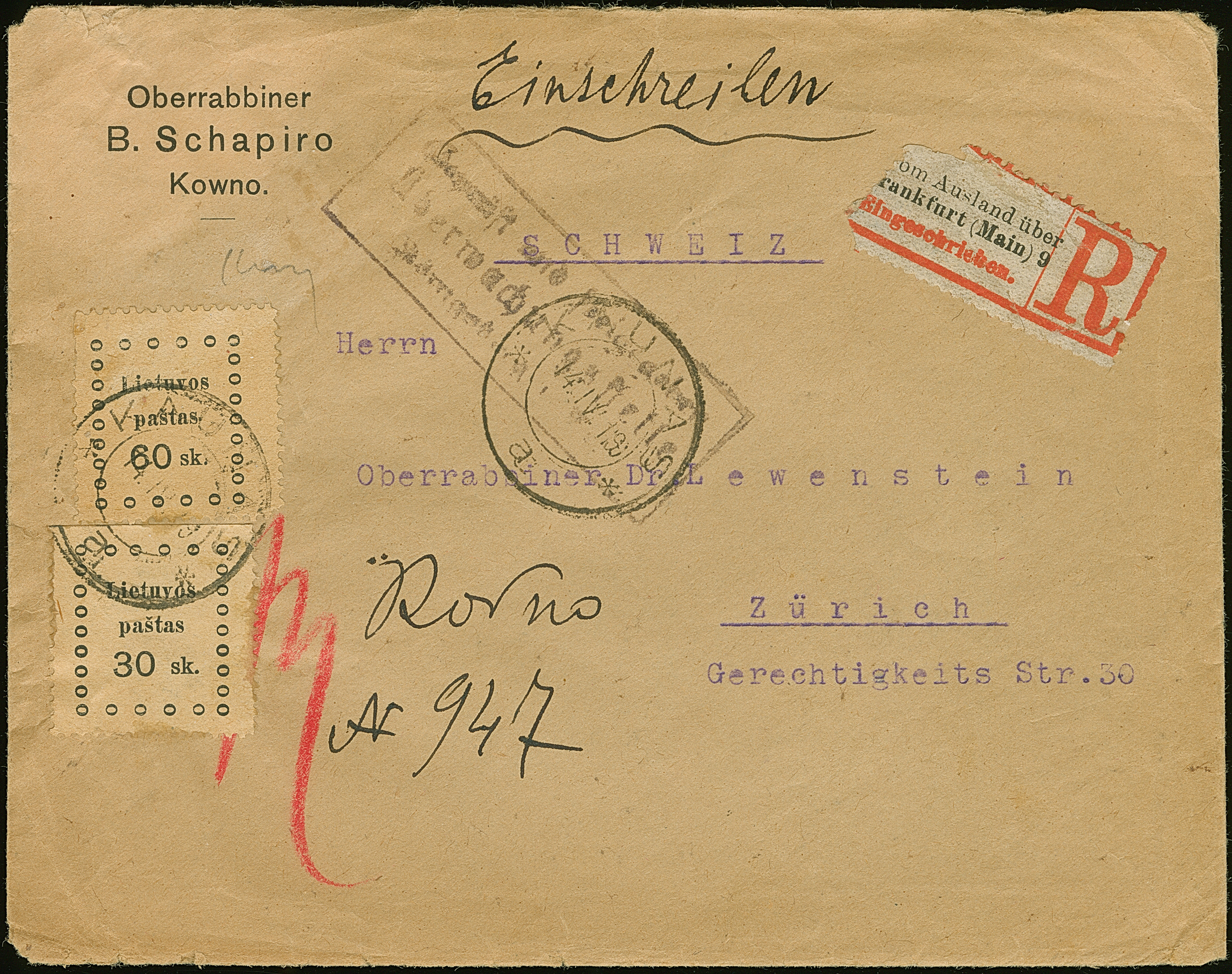 1919, Second Kaunas Issue 30 and 60 skatiku, tied by cds. "KAUNAS 14.IV.19" to registered and censored cover, with pre-printed senders-address “Oberrabbiner B. Schapiro Kowno” with provisional registered “Vom Ausland über…” label to Zürich with full contents, the registered label added with a hinge, some imperfections, a scarce cover, and an attractive entire