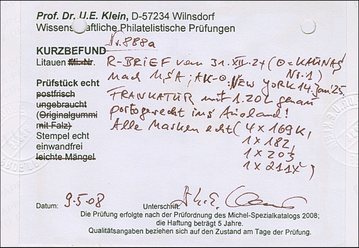 1922, New Currency surcharge 15 centu on 4 auksinas, block of four with bottom sheet margin, inverted surcharge, together with additional franking tied by cds. “KAUNAS N 1 31.XII.24” to registered cover to New York with arrival mark, a scarce and very attractive franking, fine, short-opinion Klein (2008)