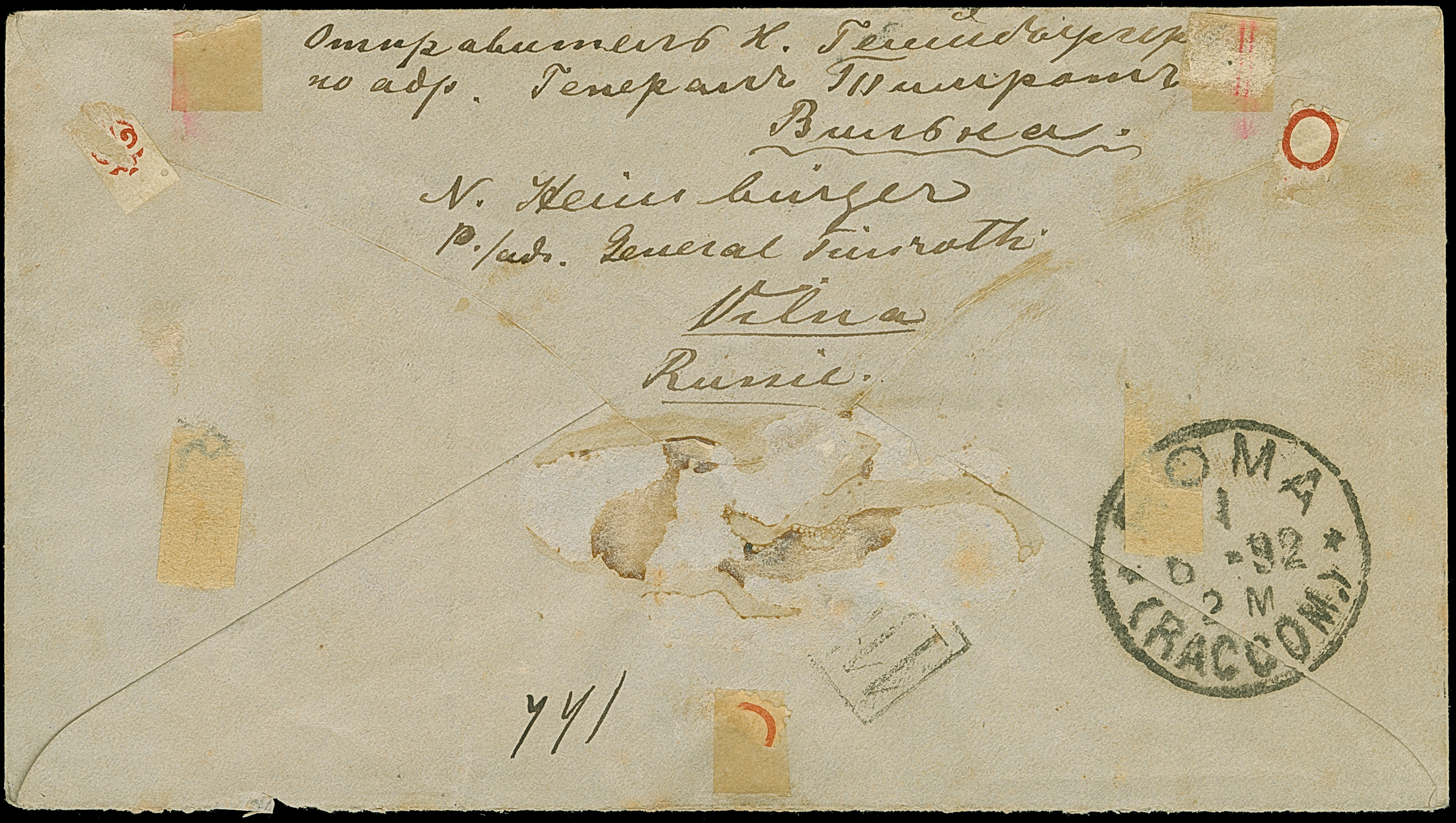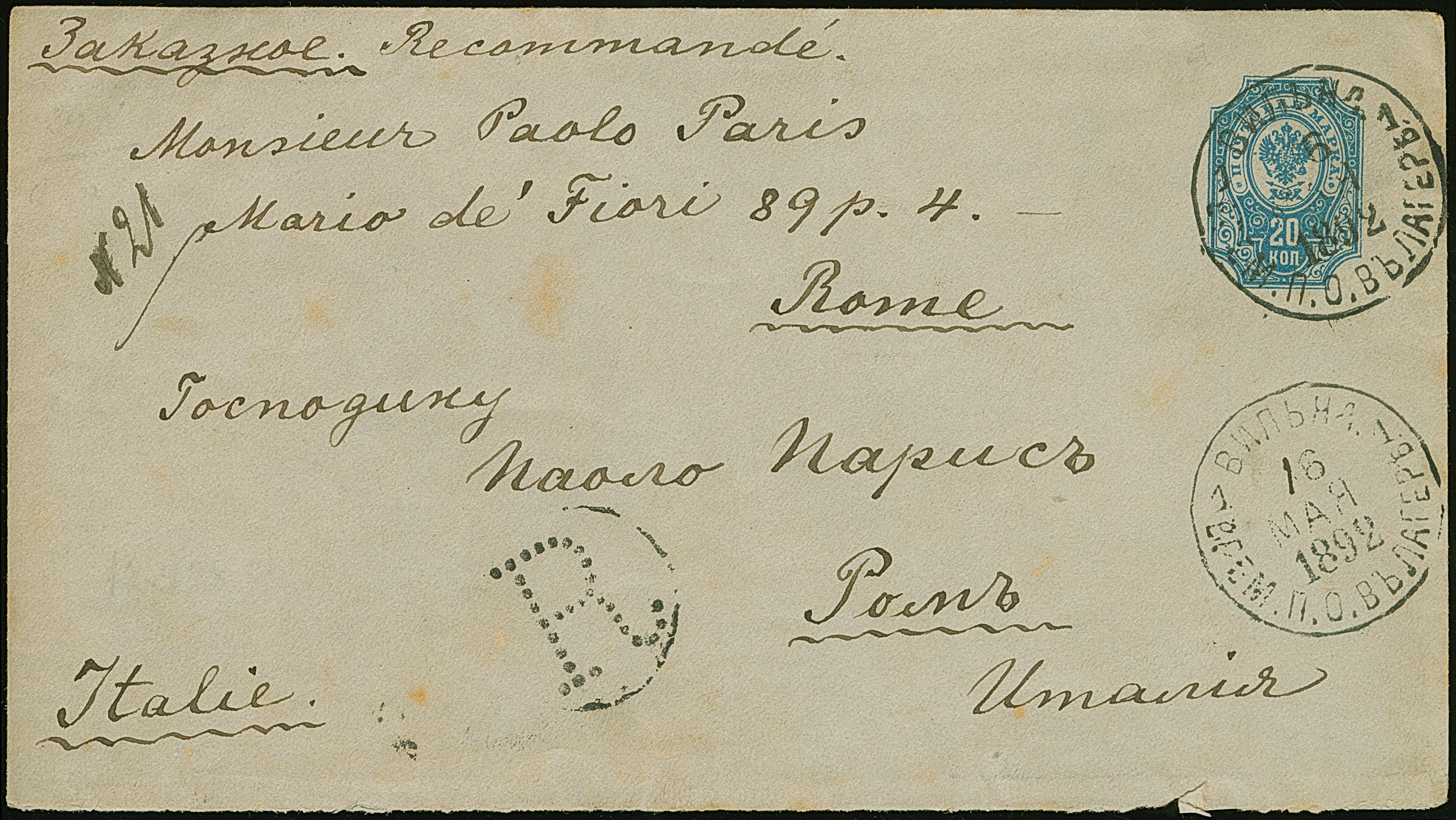 “VILNA TEMP(ERORY) P. O. V LAGER 16 May 1892” VILNA MILITARY CAMP special cds. on 20 k. registered postal stationery envelope to Roma with reverse arrival cds. “ROMA 6 -92”, minor imperfections no detracting, still fine. Extremely rare and the earliest date of usage recorded for this camp