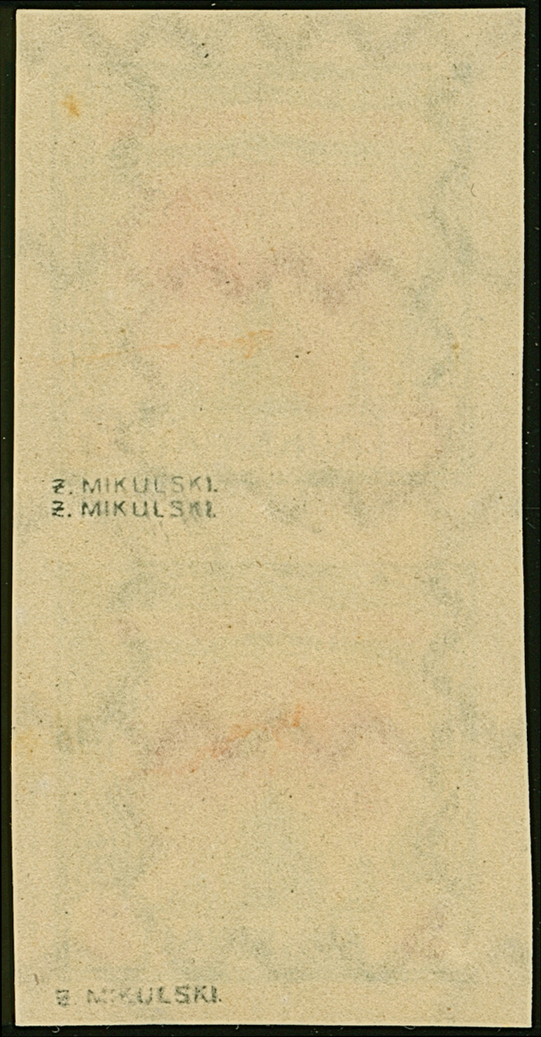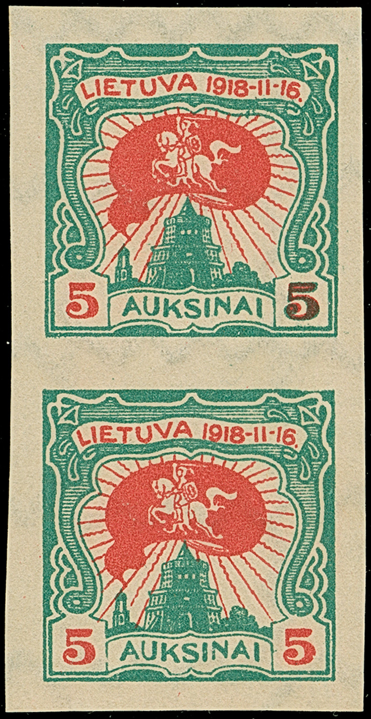 1920, Second Anniversary of Independence 5 auksinas green/red, imperforated vertical pair, upper stamp with "double 5 in red and green", mint never hinged, a very scarce and attractive variety