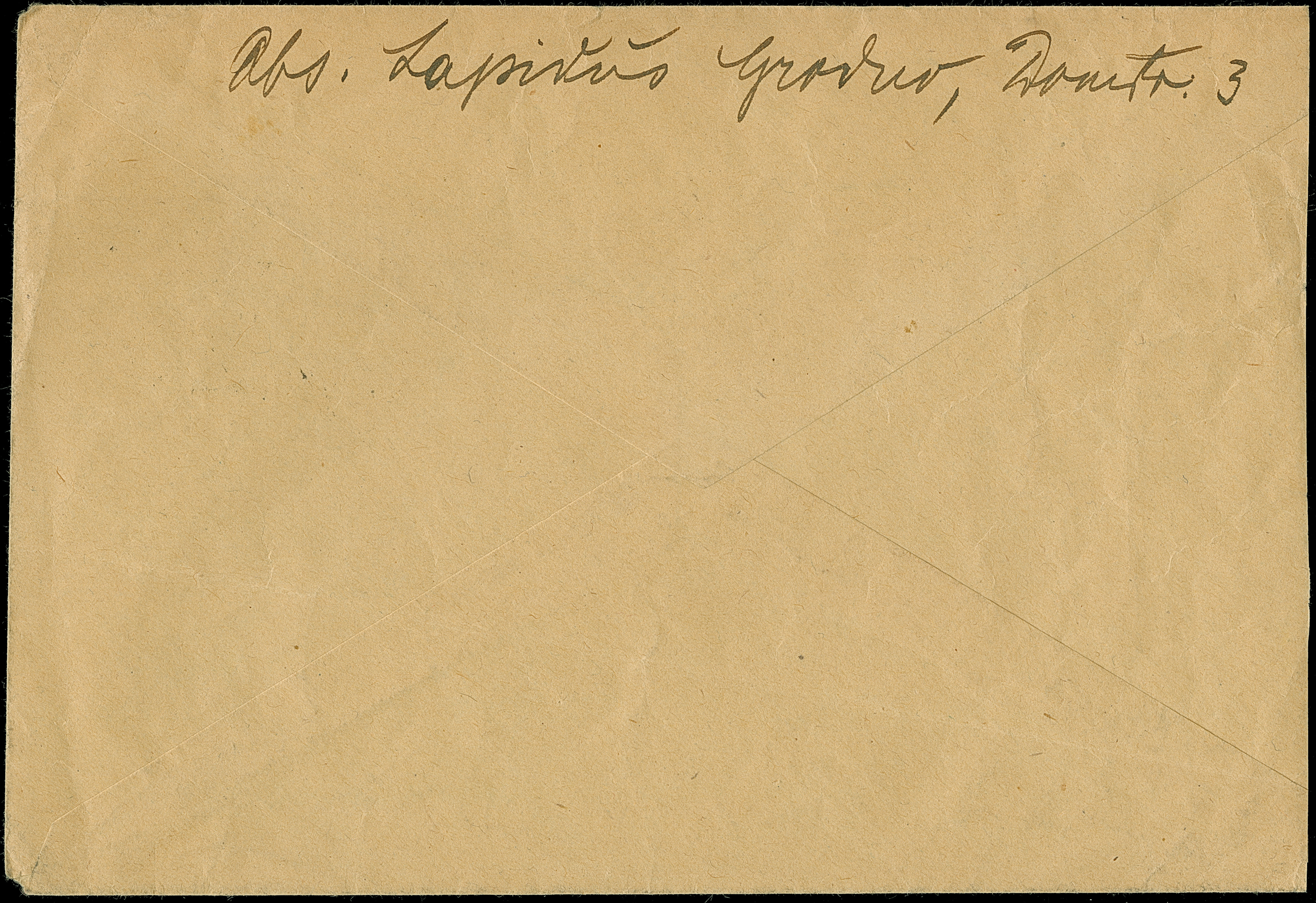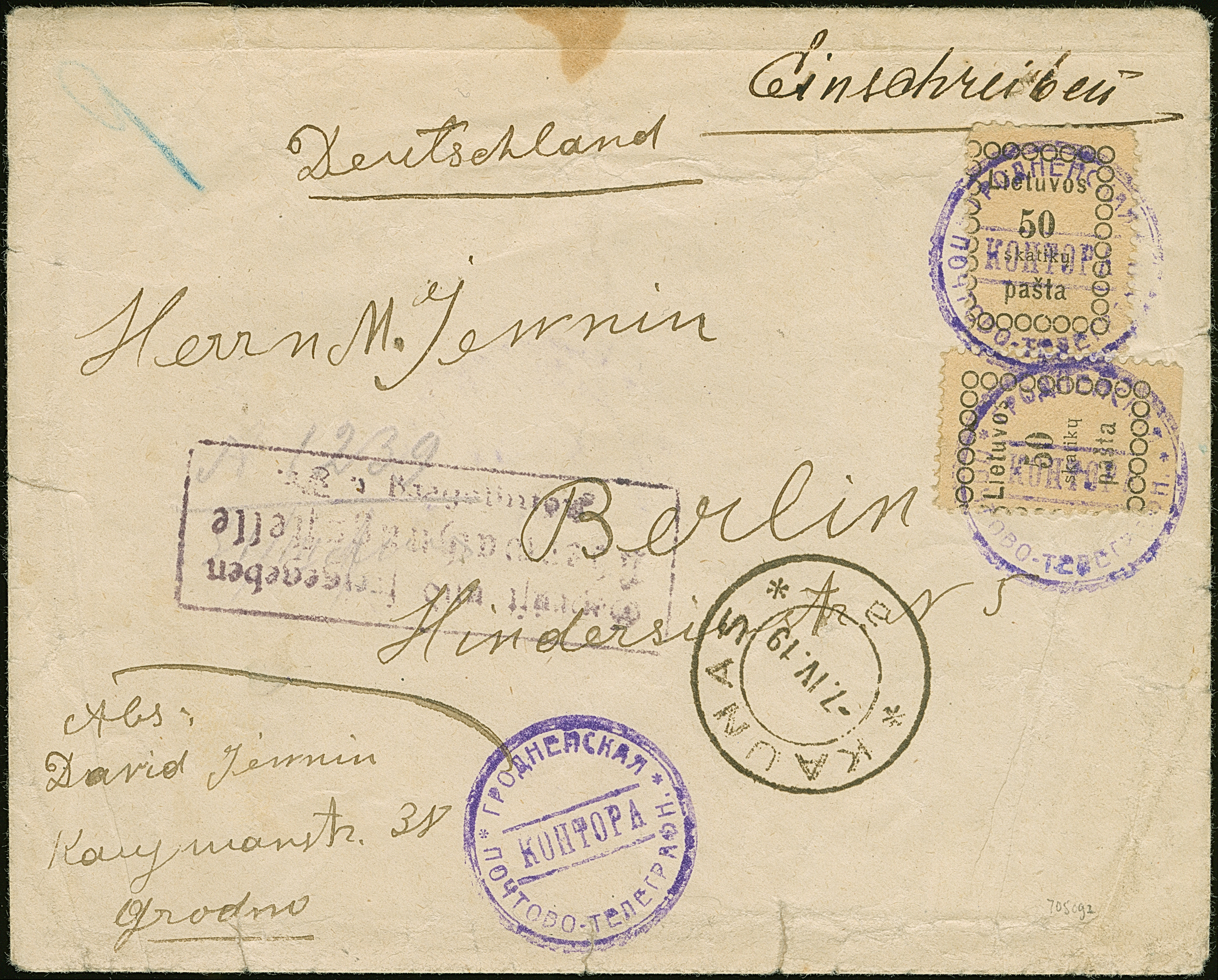 1918, Second Vilnius issue 50 skatiku tied by provisional cancel "GRODNO" to registered cover via "KAUNAS  -7.IV.19" to Berlin with Königsberg censor mark alongside, some wrinkles and tears, otherwise a fine and very rare cover