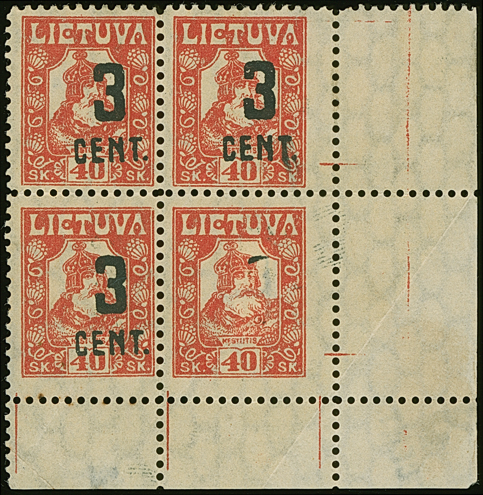 1922, New Currency surcharge 3 cent on 40 skatiku, block of four from the lower right sheet corner, the lower right stamp, due to a paperfold, with surcharge mostly omitted, unused, a fine and striking variety