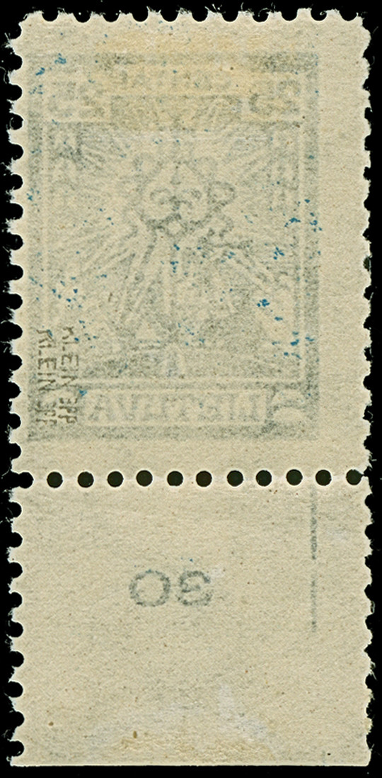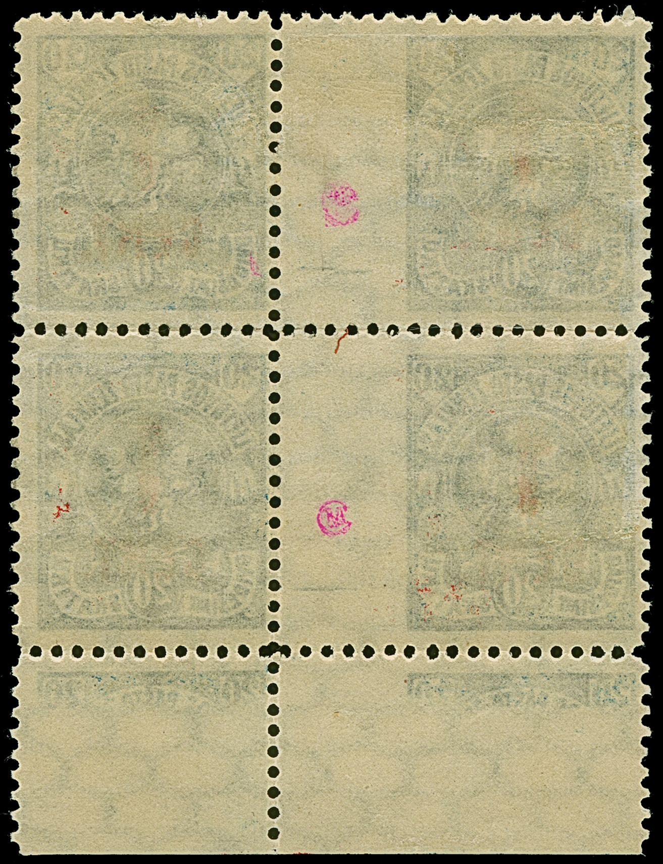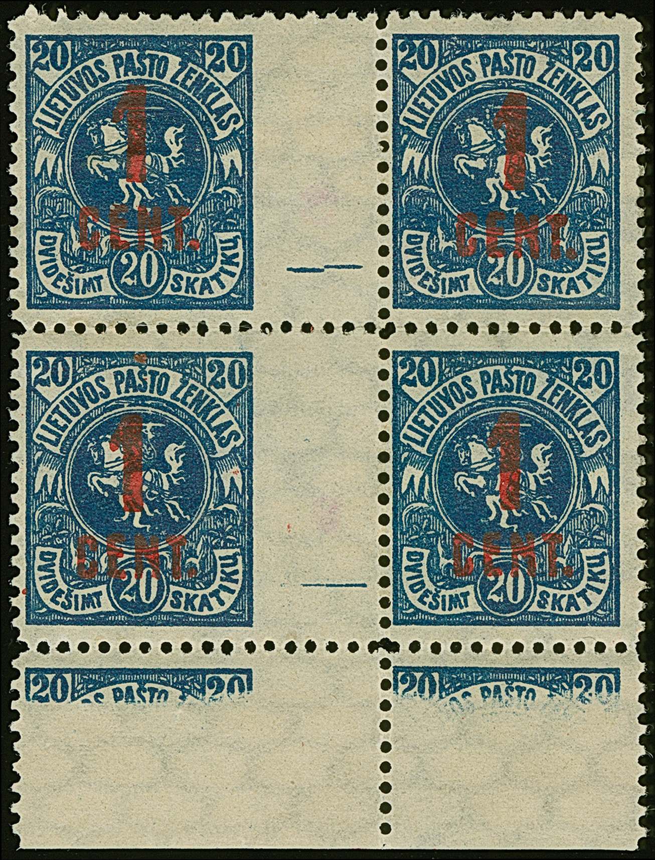 1922, New Currency surcharge 1 cent on 20 skatiku dark blue with horizontal watermark, bottom marginal gutter block of four, the left stamp with imperforated margin, also partly printed stamps on bottom selvage, unused, very fine, signed Matuzas (PSL 139a,b)