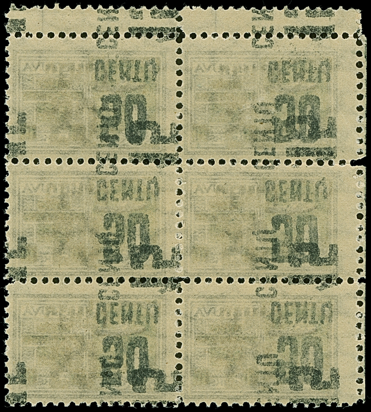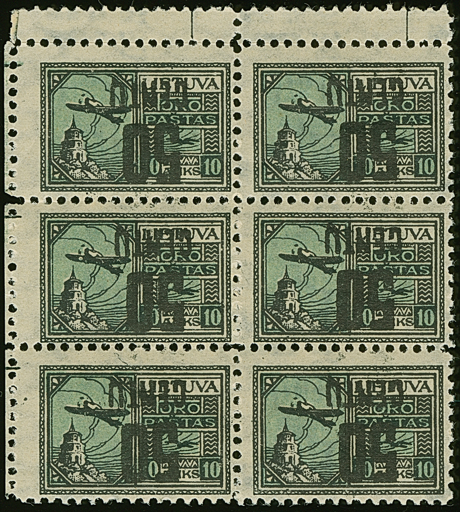 1922, New Currency surcharge Airmail 50 centu on 10 auksinas, block of six with gutter at top, with inverted surcharge, shifted offsett on reverse, mint never hinged, two stamps unused, fine and attractive multiple