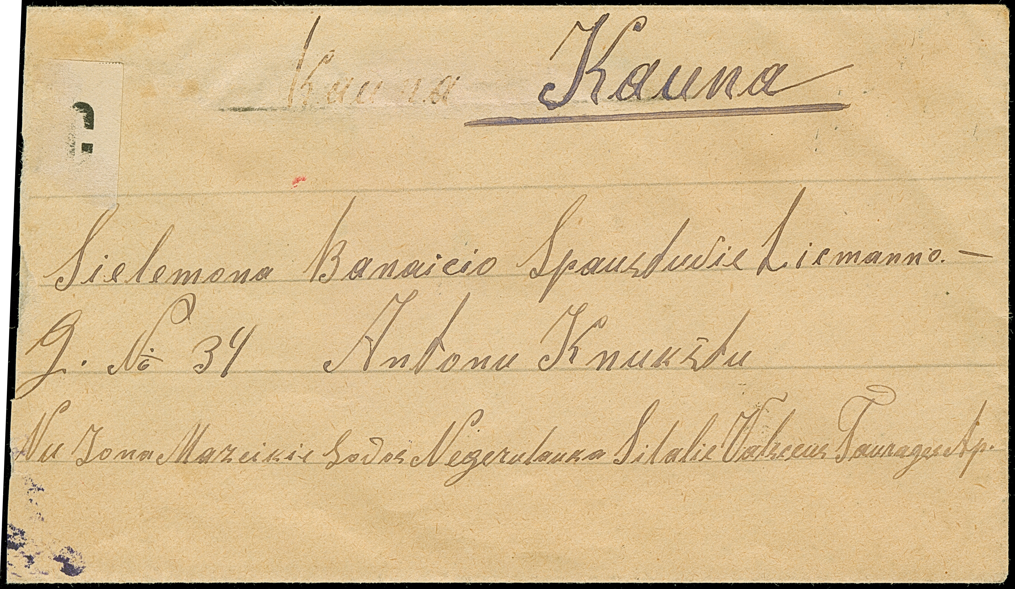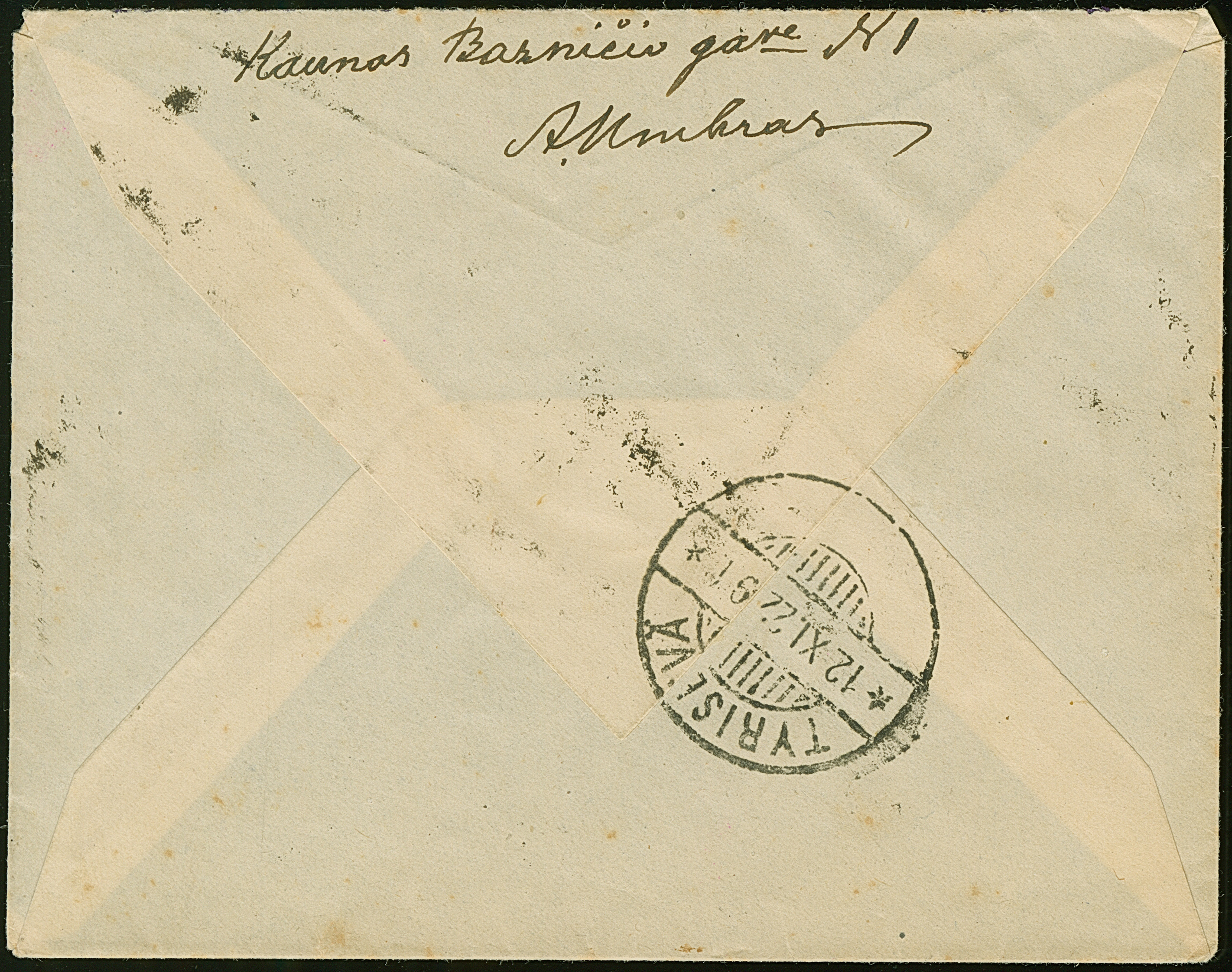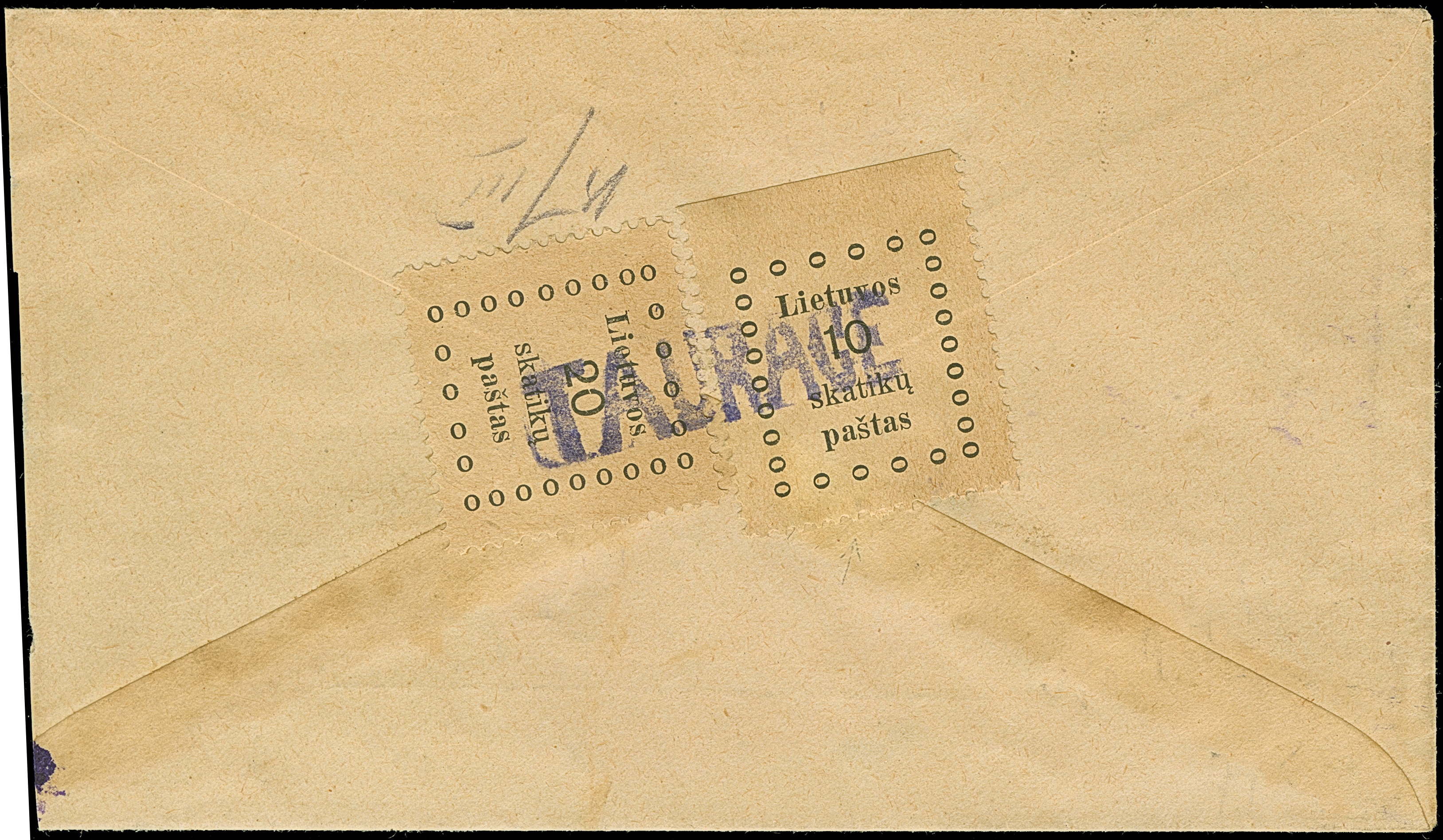 1919, First Kaunas Issue 10 and 20 skatiku tied by straight line "TAURAGE" to reverse of cover to Kaunas, slightly reduced at left, a fine rare cover