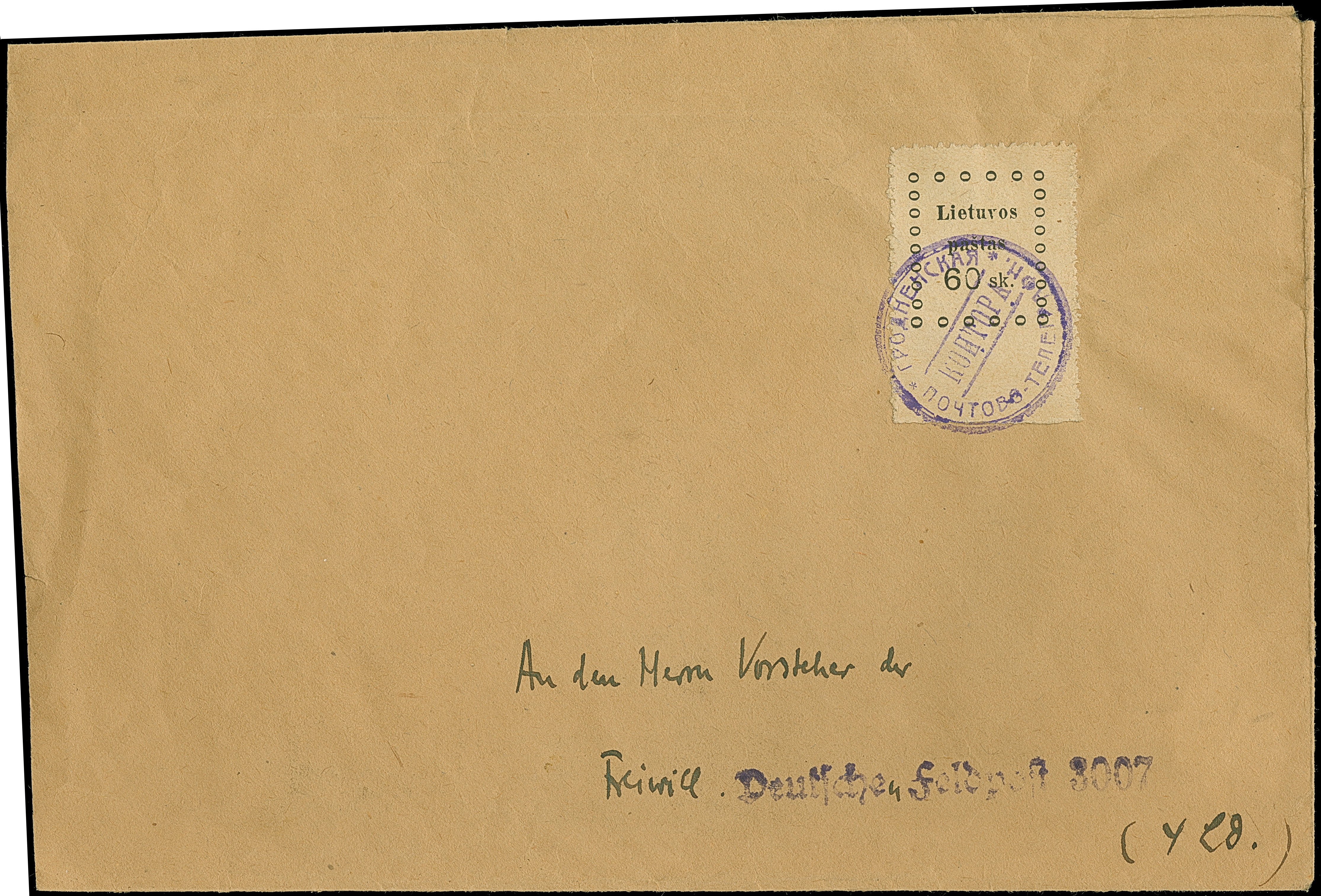 1919, Second Kaunas Issue 60 skatiku, from lower sheet margin, imperforated at bottom, tied by violet cancel of “GRODNO” to cover addressed to Head of Volunteers at German Field Post 3007, fine
