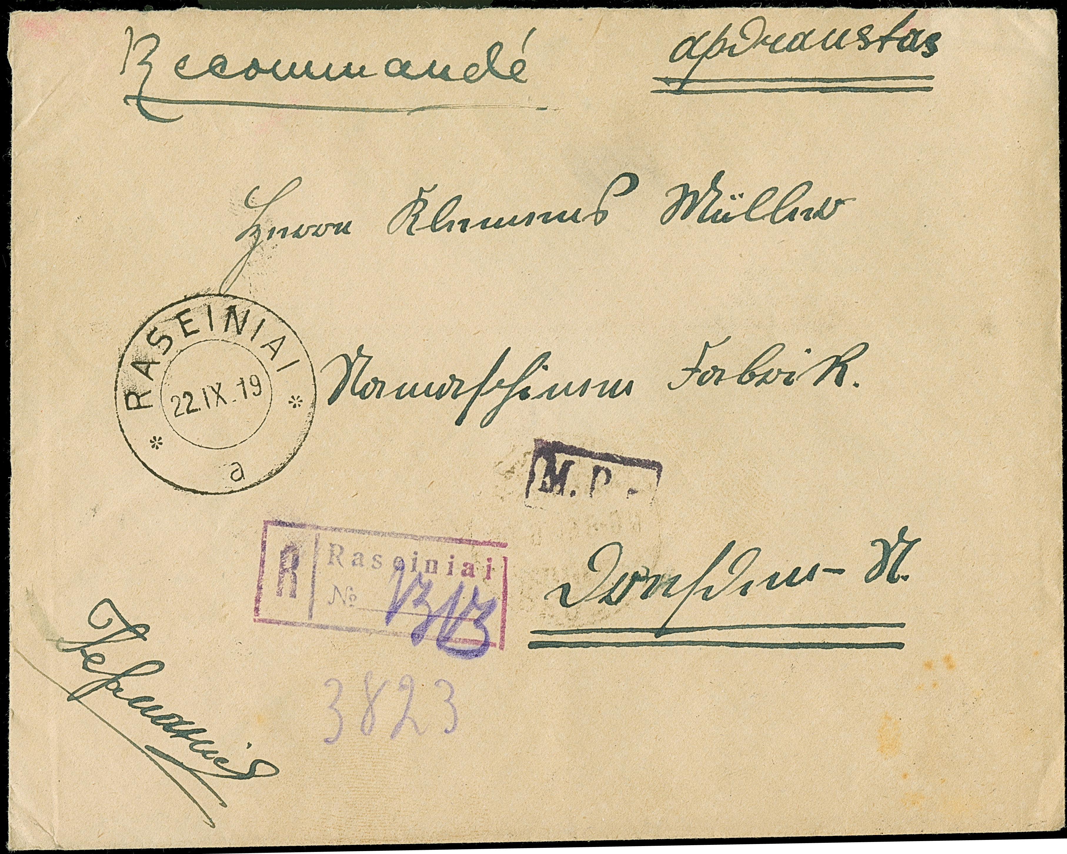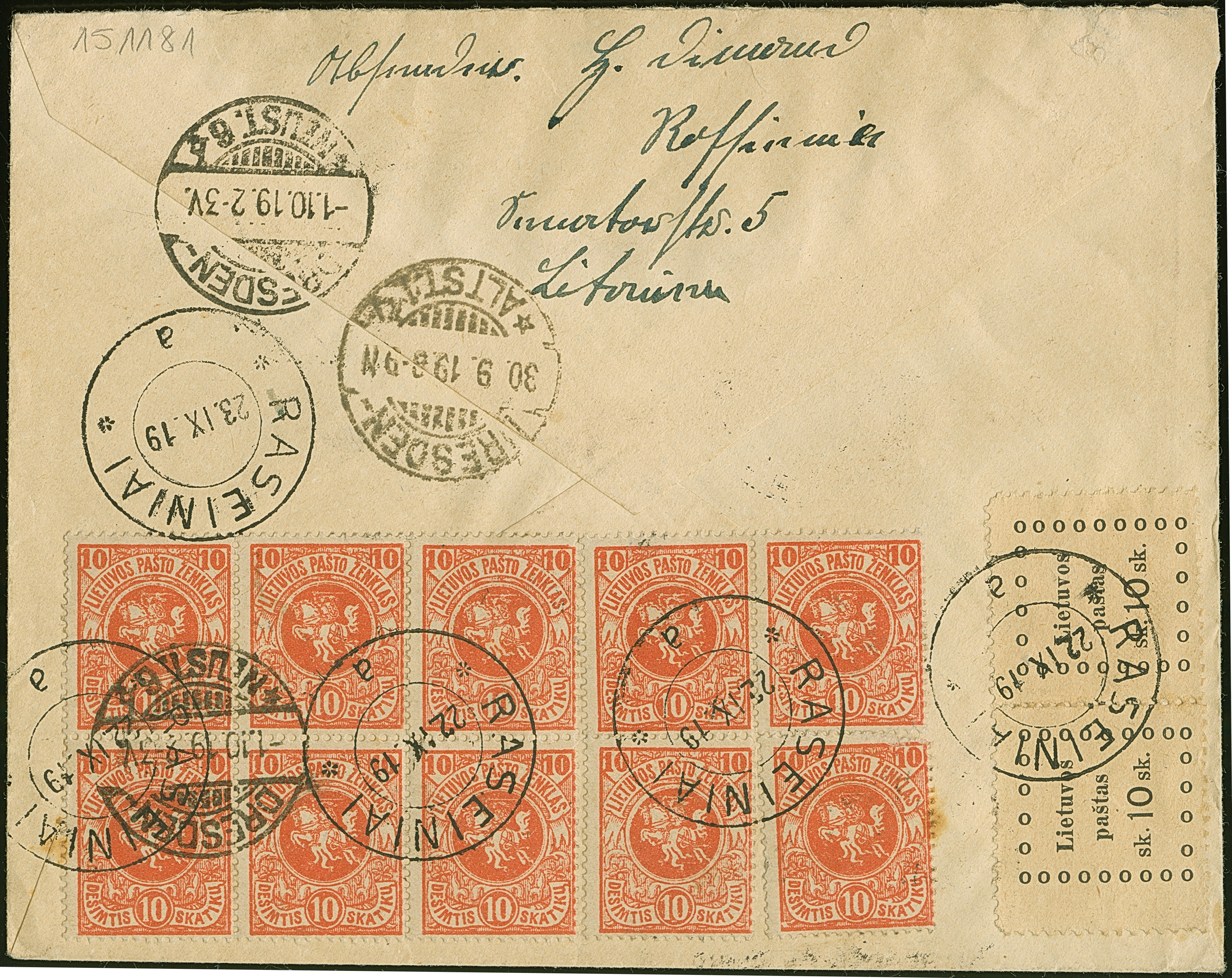 1919, Third Kaunas Issue 10 skatiku, horizontal pair, together with Fourth Berlin Issue 10 skatiku block of six, horizontal pair and two singles, tied by cds. “RASEINIAI 23.IX.19” to reverse of registered cover  to Dresden with arrival mark, minor aging, otherwise a fine and very attractive entire