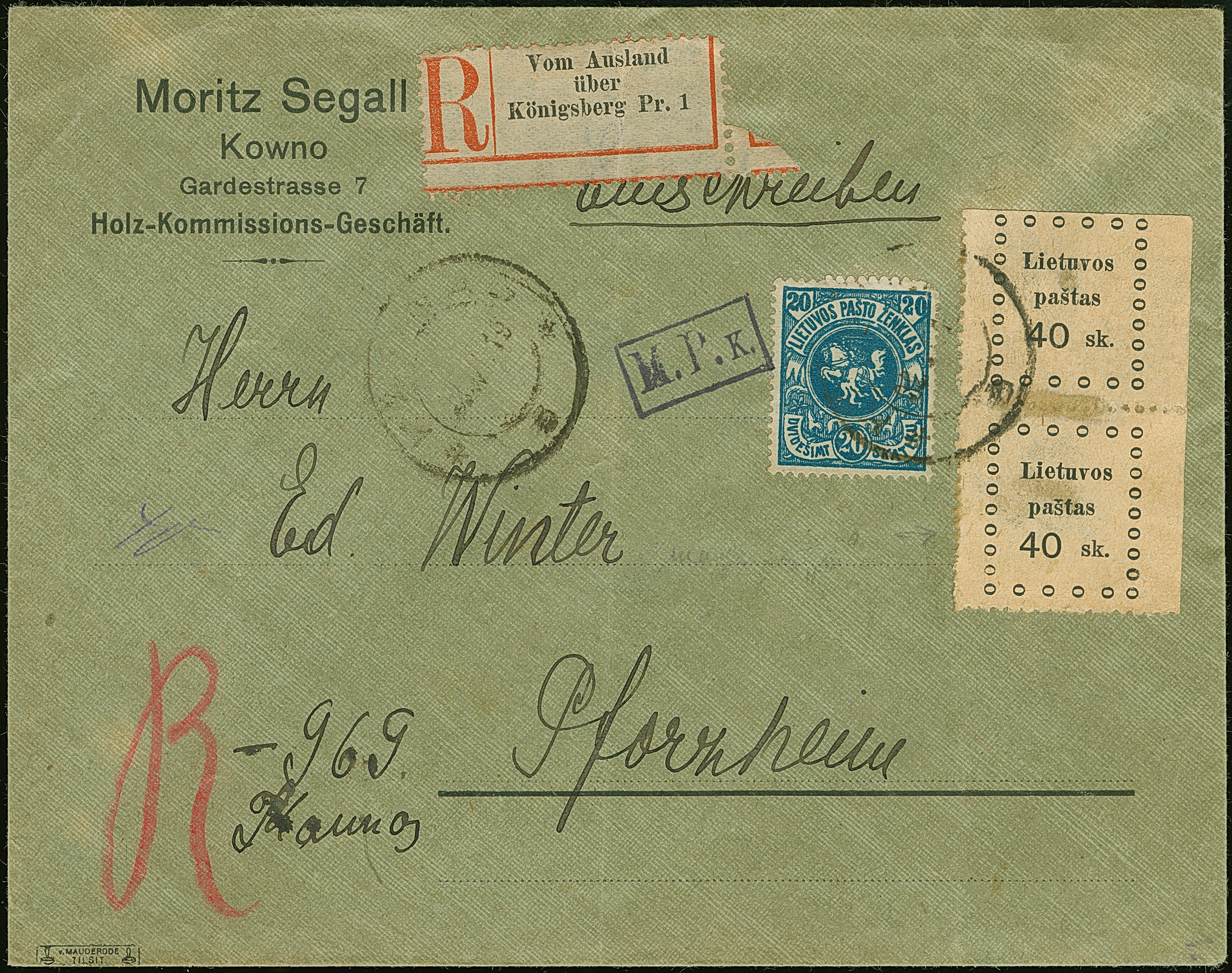 1919, Second Kaunas Issue 40 skatiku, horizontal pair, together with Fourth Berlin Issue 20 skatiku blue, tied by cds. “KAUNAS” to registered cover to Pforzheim, with transit-r-label “Vom Ausland über Königsberg Pr. 1”, arrival mark on reverse, imperceptible, folded vertically three times, not affecting the stamps, a rare and attractive entire