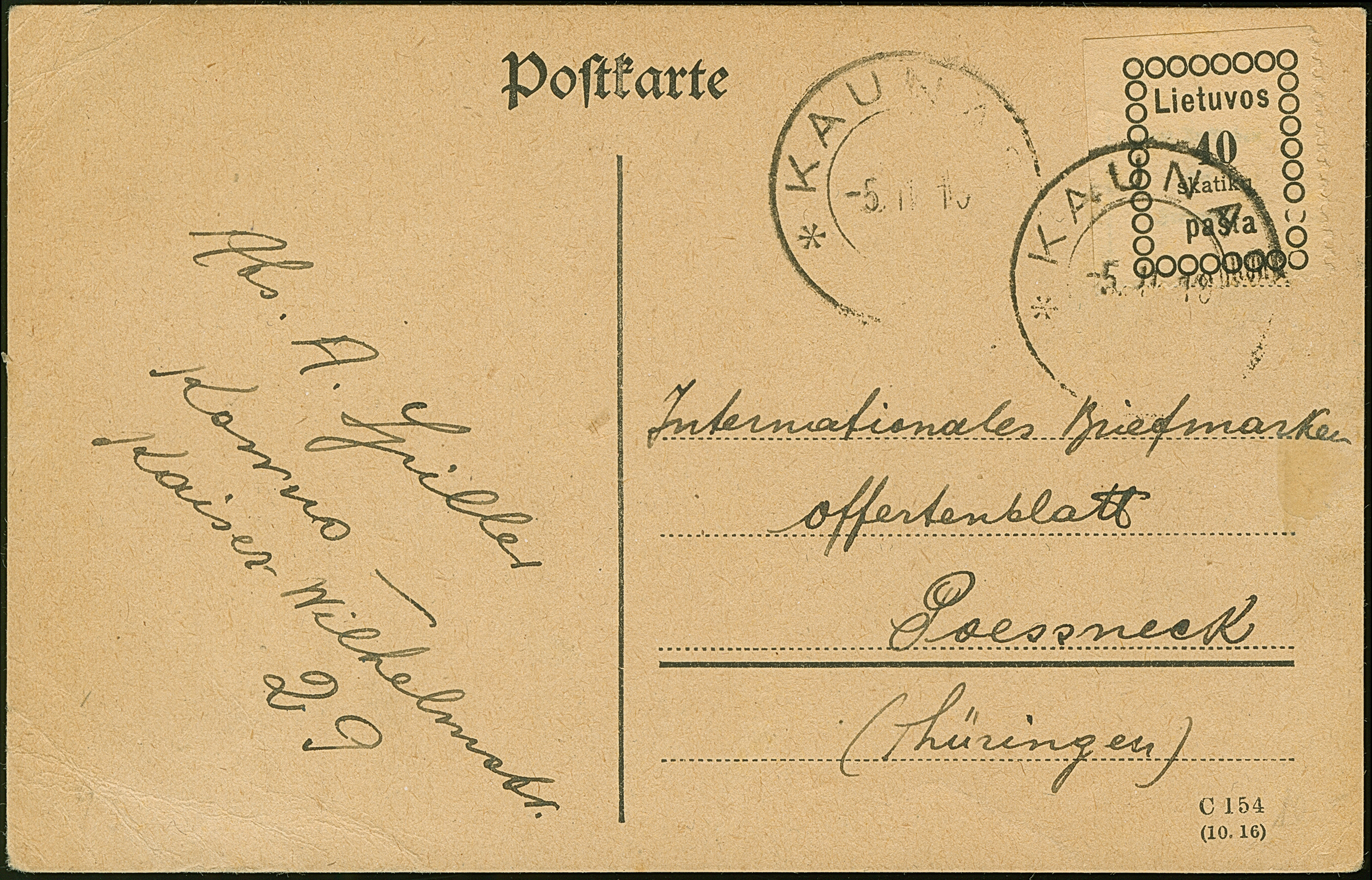 1918, Second Vilnius Issue 40 skatiku from the upper left corner, tied by cds. "KAUNAS -5.II19" to postcard addressed to the "Internationales Briefmarken Offertenblatt" in Pessneck, few creases, otherwise fine and scarce