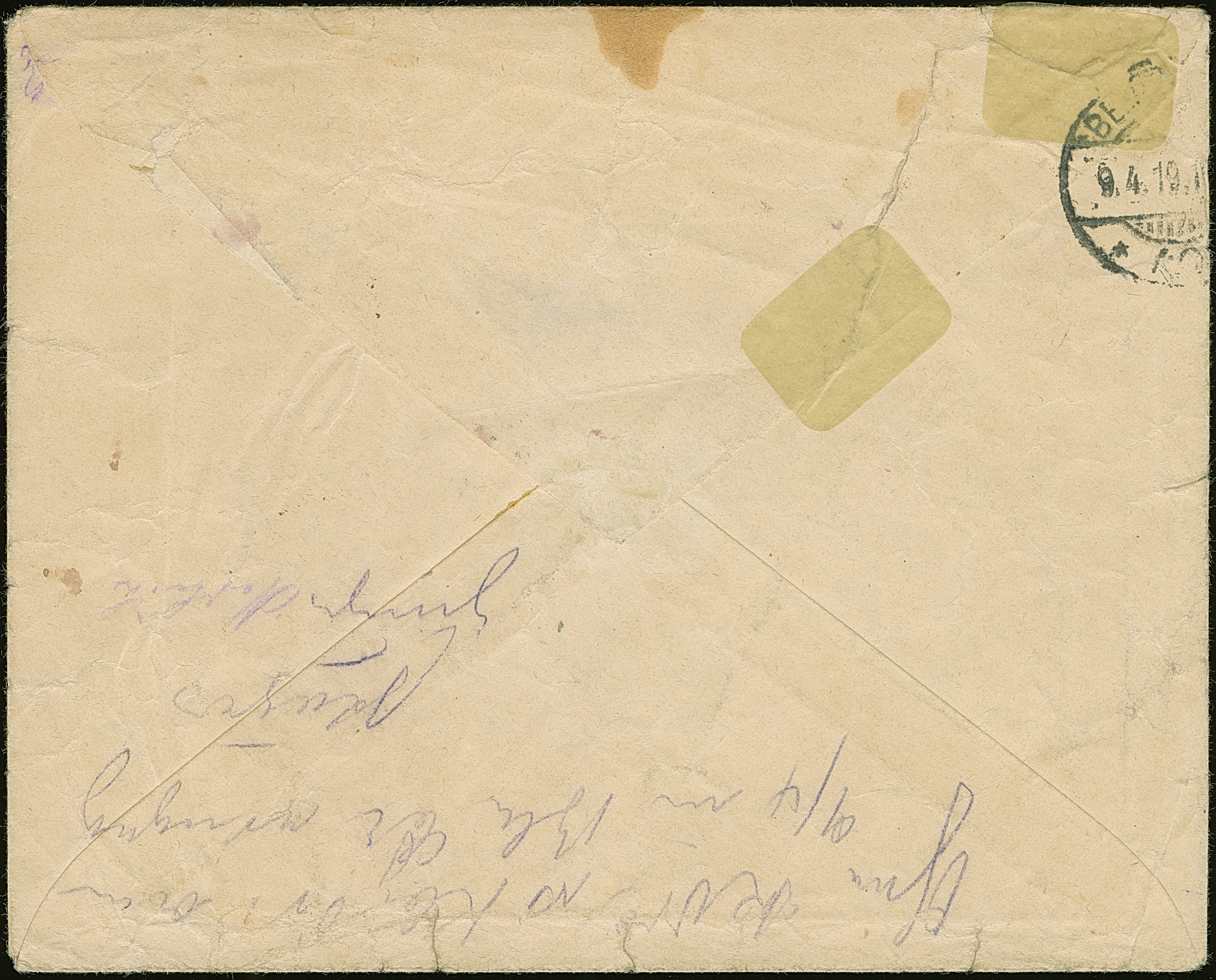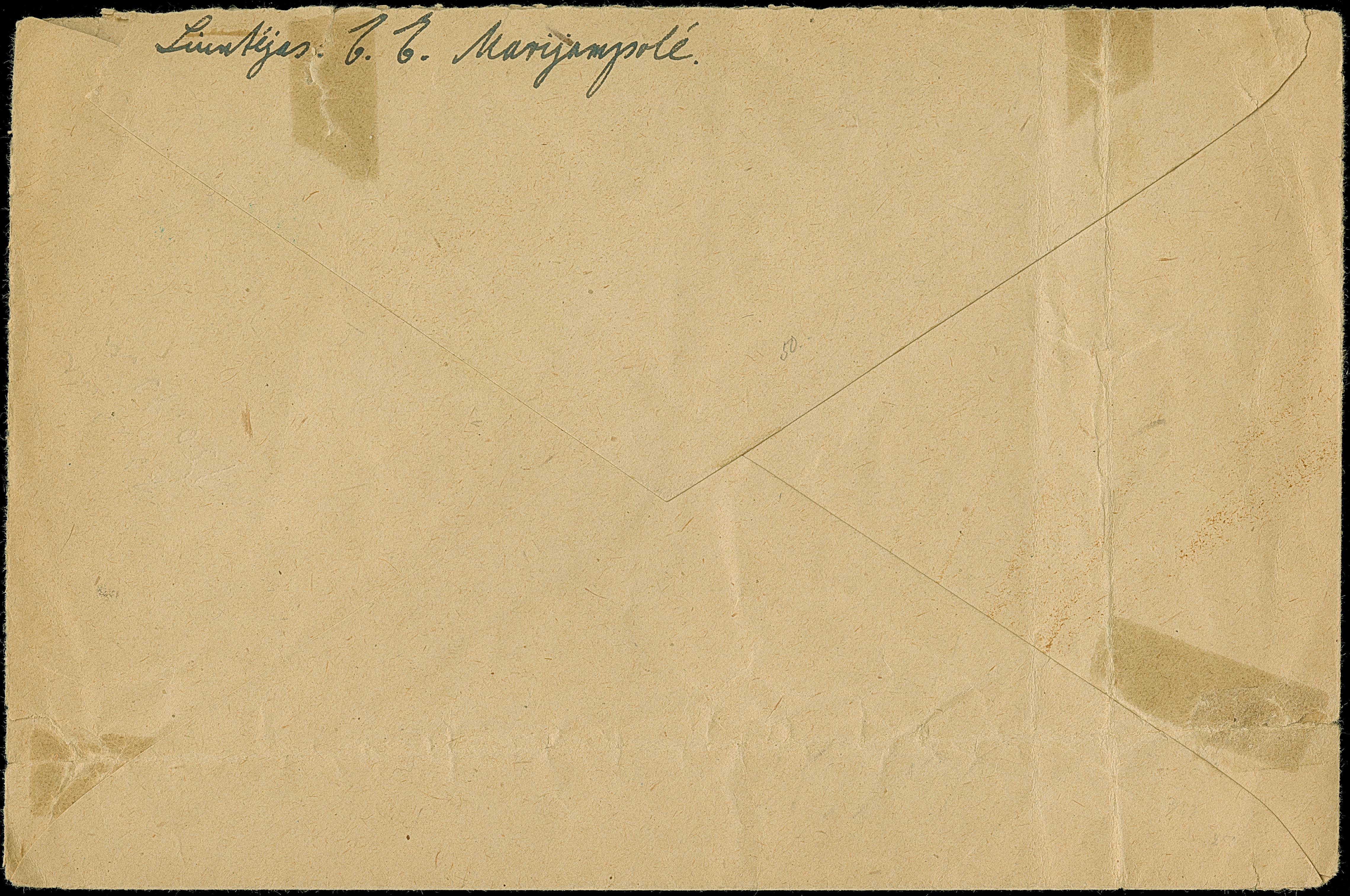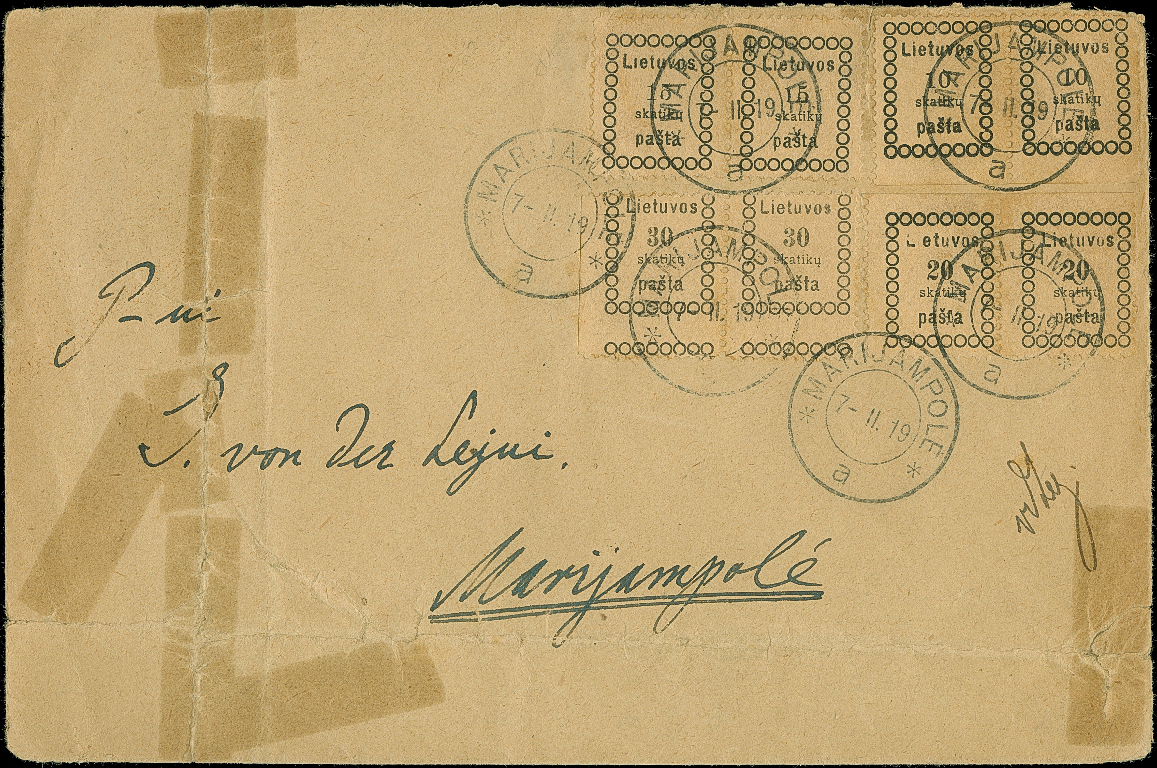 1918, First Vilnius issue 10-15 skatiku and Second Vilnius Issue 20-30 skatiku, each as horizontal pair tied by cds. "MARIAMPOLE 7- II. 19" to local cover, some faults like reinforcement by tape, tears etc., but a scarce early cover