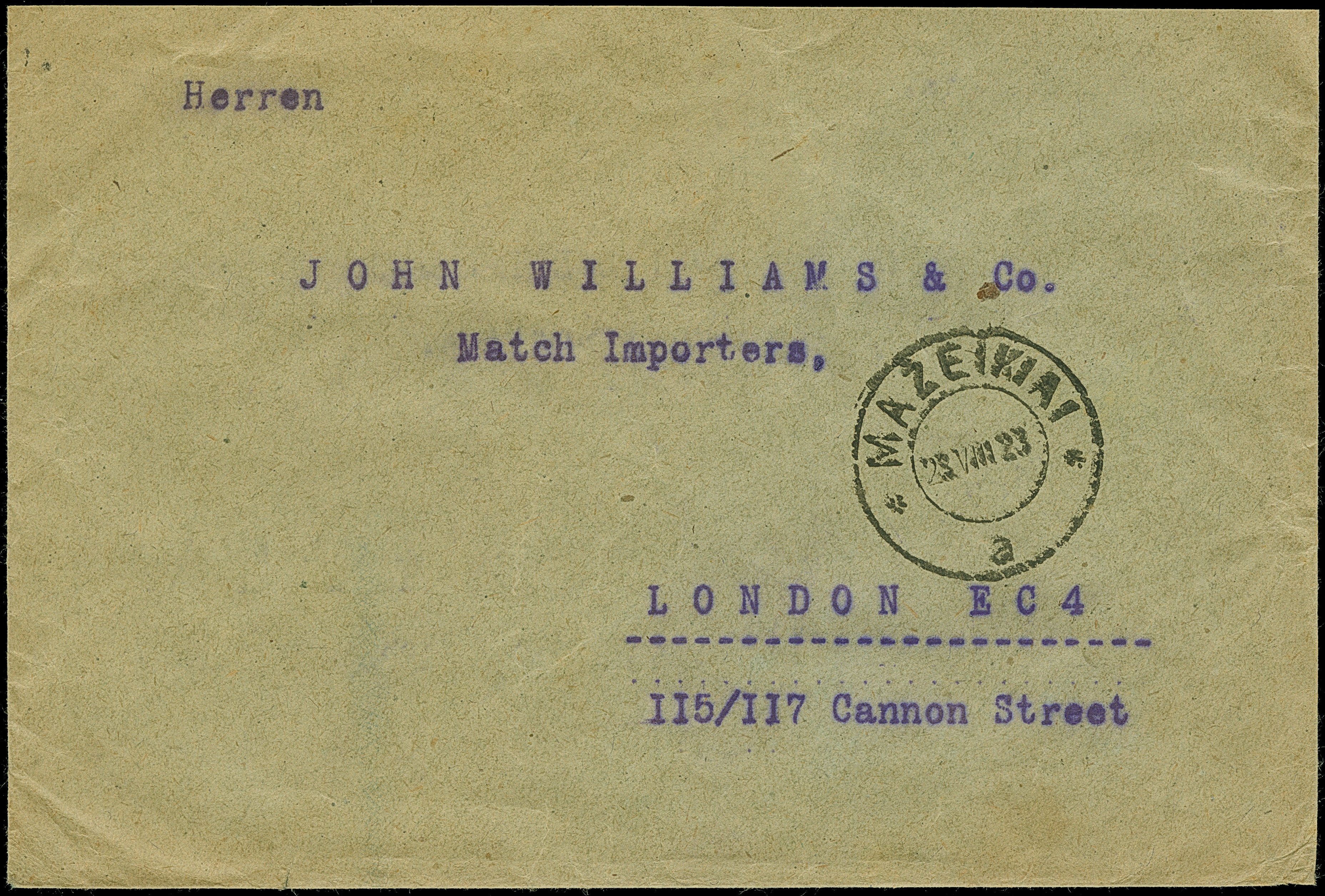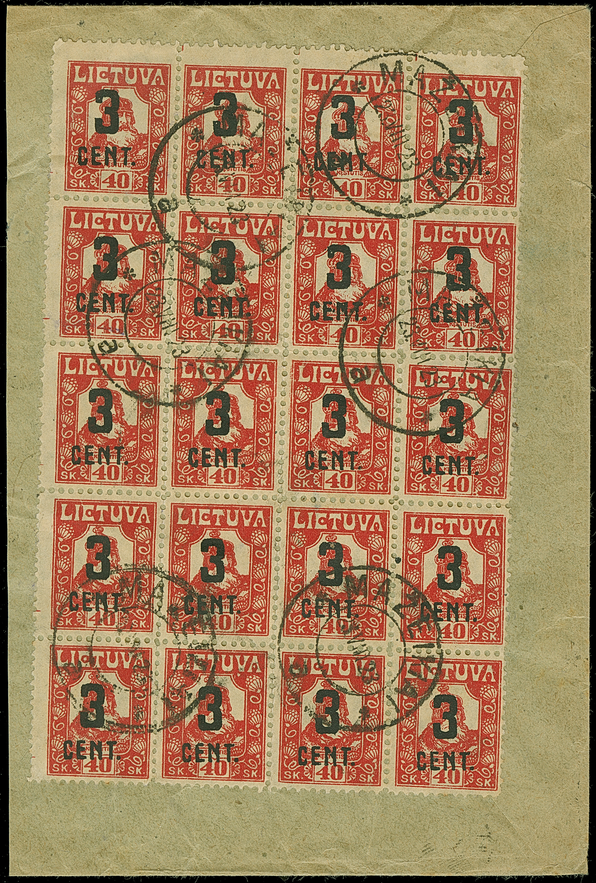 1922, New Currency surcharge 3 centu on 40 skatiku, block of 20, tied by cds. “MAZEIKIAI 28.VIII.23” to reverse of cover to London, few minor imperfections, a scarce and attractive franking